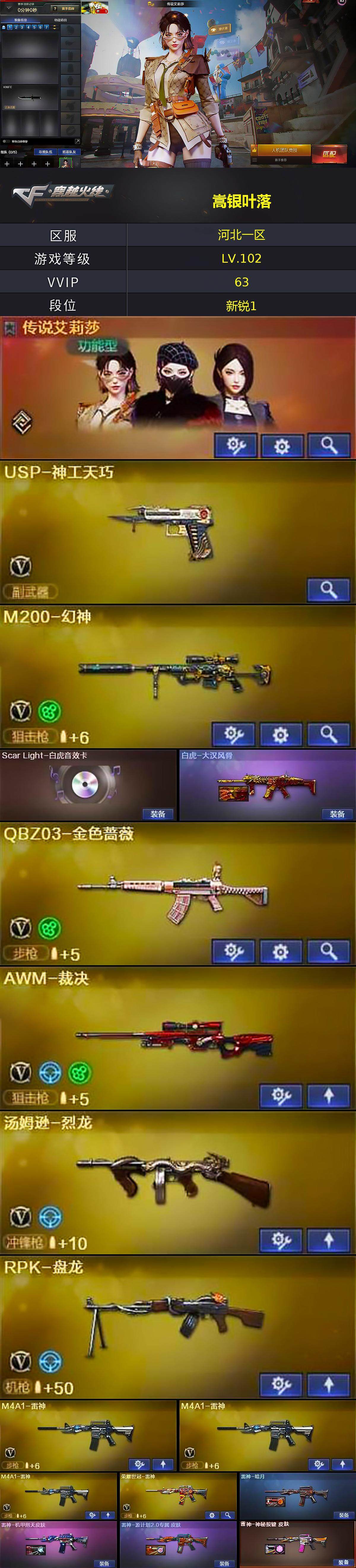 [14543637]河北一区-61v-7王者-2炫金 【传说角色】:传说艾莉莎 【热门武器】:q03-金色蔷薇,m200-幻神,死亡之眼,荣耀世冠-雷神,m4a1-黑骑士,汤姆逊-烈龙,rpk-盘龙,加特林-炼狱5,沙鹰-修罗4 【王者炫金武器】:超新星-悦享,天启-悦智,王者之翼,王者之光,王者之锋,炫金黑龙,炫金武士 【音效卡】:ak47-火麒麟音效卡,barrett-毁灭音效卡,scar light-白虎音效卡,barrett-碧霄极光音效卡 【皮肤】:白虎-大汉风骨,雷神-暗月,雷神-机甲刑天皮肤,雷神-源计划2.0专属 皮肤,雷神-神秘按键 皮肤,火麒麟-雷神,毁灭-暗月,毁灭-黑大圣皮肤,毁灭-风暴,毁灭-神秘黑洞皮肤,毁灭-英雄计划 皮肤,无影-暗月,修罗-能量核心 【角色】:葵,樱,审判者,乔伊教练,修道士,空,暗夜-x,初恋灵狐,飞虎队-x,嘉年华灵狐,娟娟,零-水下丽影,灵狐者-七夕宝贝,龙儿-小淘气,麻雀,潘多拉-x,潘多拉-甜心教官,青霞仙子,蛇姬,铁骑荣耀,兔囡囡,新娜塔莎,影武者-x,游珑儿 【人偶武器】:awm-灵狐-15周年嘉年华2,迷你深渊冰龙,迷你裂空之翼,夺魂,迷你生化手蕾,生化手蕾-机甲核心,迷你艾比 【暴走生化】:死亡之眼 【挑战大师】:激光毁灭者iii2,神圣爆裂者-末日iii 【英雄级武器】:ak47-火麒麟4,m4a1-黑龙,m4a1-雷神3,m4a1-黑骑士,m4a1-死神,ak47-黑鲨,m4a1-龙血,无影-神兵利器,黑武士-锦绣游龙,m4a1-玫瑰精灵2,q03-金色蔷薇,王者之戮-觉醒版,荣耀世冠-雷神,awm-天龙,barrett-毁灭2,awm-裁决,m200-幻神,王者之怒-觉醒版,rpk-盘龙,加特林-炼狱5,汤姆逊-烈龙,aa-12-雷霆,沙鹰-修罗4,沙鹰-天神,usp-神工天巧,屠龙5,擎天,麒麟刺,唐刀-神工天巧,斩神刀-雷暴,丛林匕首-玄豹,高爆手蕾-雷暴,高爆手蕾-玄豹,闪光丹-雷暴,闪光丹-玄豹,盐雾蛋-雷暴,盐雾蛋-玄豹 【道具】:cfs限定背包,亚洲杯纪念炫彩背包,女皇终结者-背包,战舰背包,炫彩背包,超级背包,黄金巨石泰坦-魔花研究所背包,女皇终结者-魔龙之吻,救世主-黑桃战神,绿色巨人,灵魂忍者2,变异宝贝,迷雾幽灵,夺命之镰,防化服3,金色流光-呛王排位,流光-