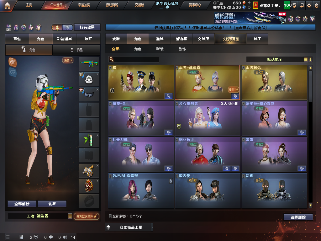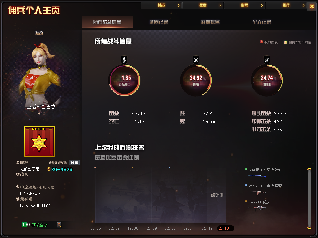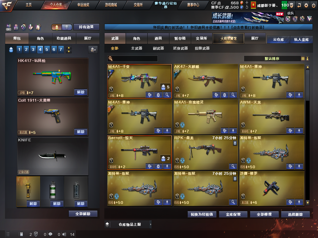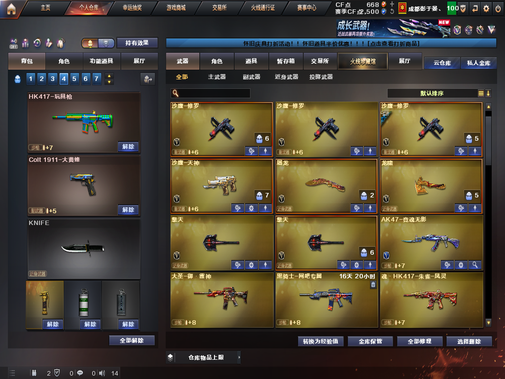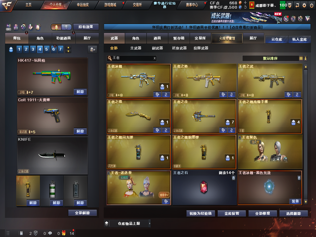 【等级】100【区服】云南一区【vip】5【段位】荣耀呛王【英雄角色】1【英雄武器】18 【王者级武器】王者之锋 王者之魄盐雾蛋 王者之魄闪光丹 王者冰魄 王者之魄高爆手蕾 王者之势 玫瑰精灵-悦动 王者之武 王者之击 【英雄级角色】樱 【英雄级武器】擎天 龙啸 awm-天龙 加特林-炼狱 加特林-炼狱 沙鹰-修罗 m4a1-千变 m4a1-雷神 m4a1-雷神 沙鹰-修罗 a