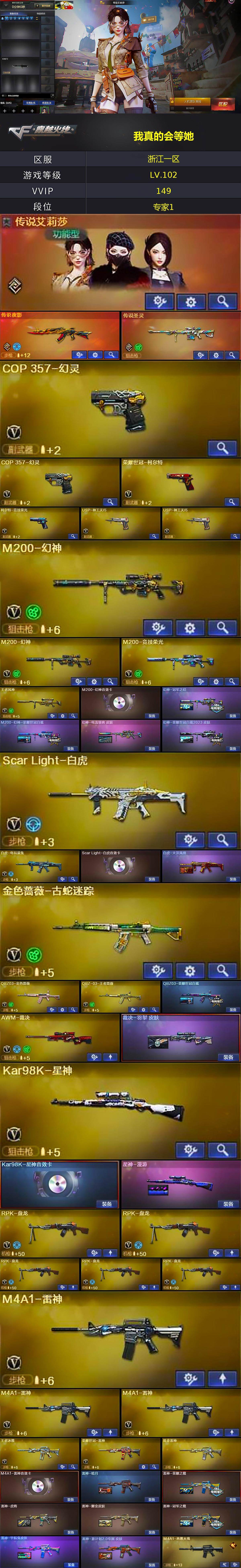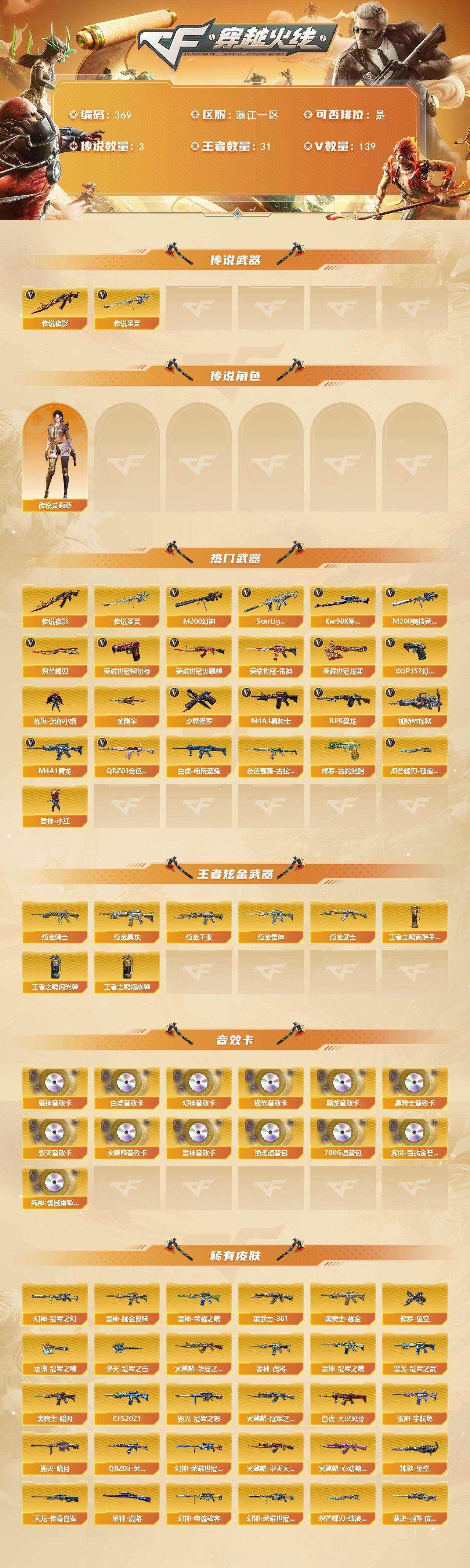浙江一区-139v-31王者-5炫金 【传说武器】:传说夜影,传说圣灵 【传说角色】:传说艾莉莎 【热门武器】:传说圣灵,传说夜影,q03-金色蔷薇,scar light-白虎,m4a1-青龙,m200-幻神2,金色蔷薇-古蛇迷踪,修罗-古蛇迷踪,m200-竞技荣光,荣耀世冠-火麒麟,荣耀世冠-雷神,白虎-电玩蓝兔,荣耀世冠-柯尔特,kar98k-星神,炼狱-迷你小钢,m4a1-黑骑士