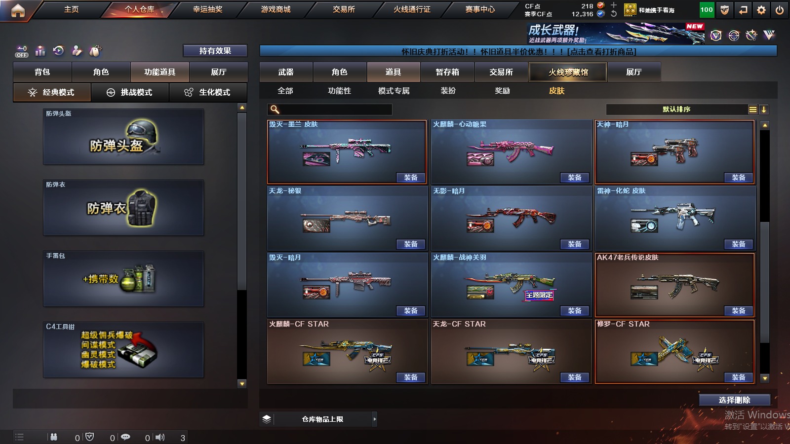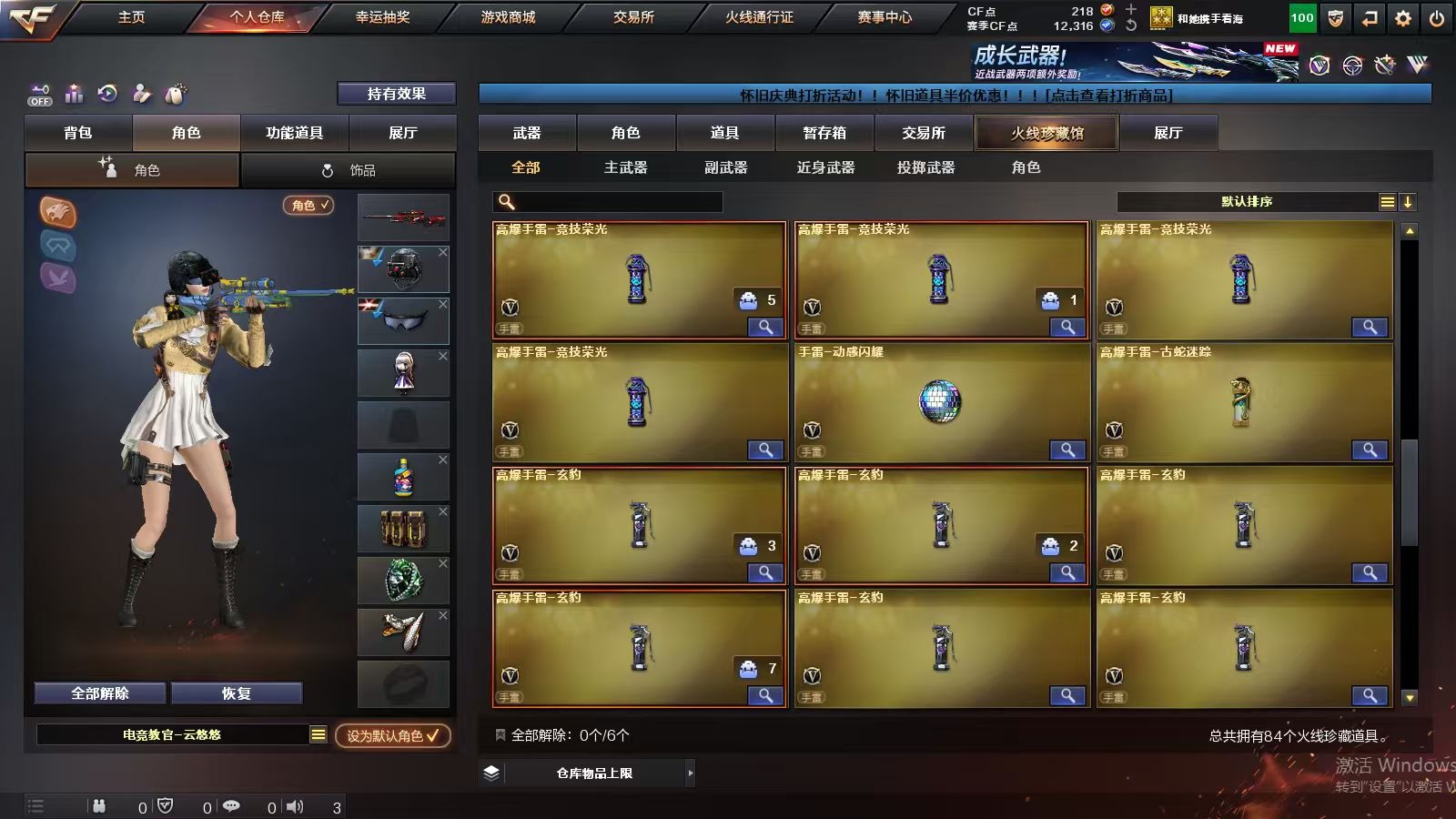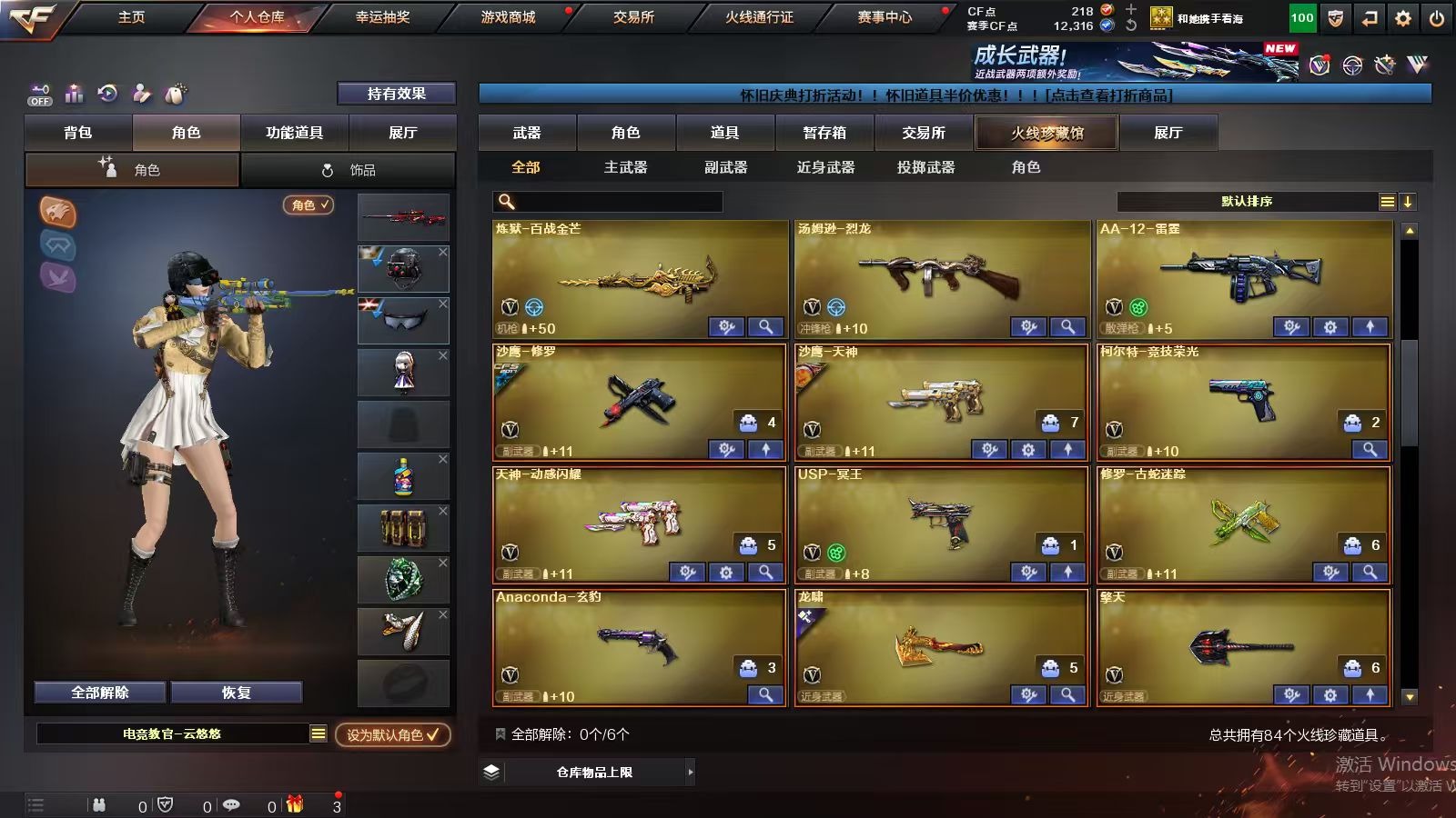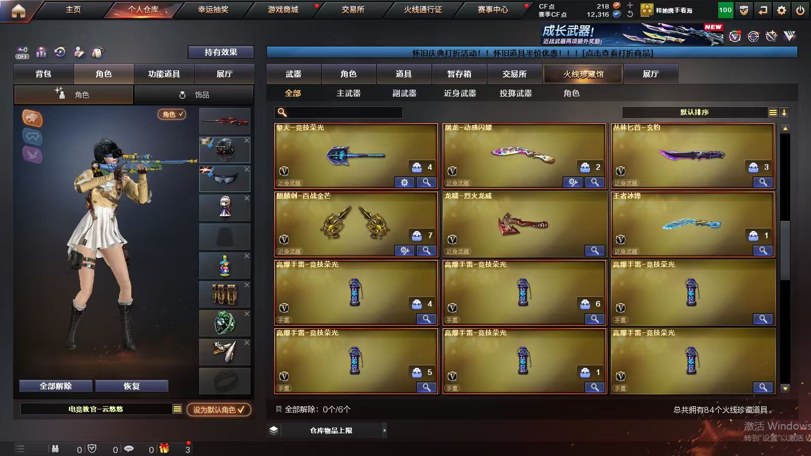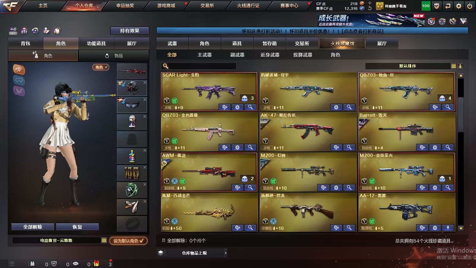 3英雄角色 1王者武器 79v武器 可二次 可修改实名 【排位资格】:有 【v武器】:famas g2-天戎炼狱-百战金芒麒麟刺-百战金芒g36c-幻影龙啸-烈火龙威天神-动感闪耀屠龙-动感闪耀无影-神兵利器死神-雪域霜狐机械迷城-穹宇scar light-玄豹anacond