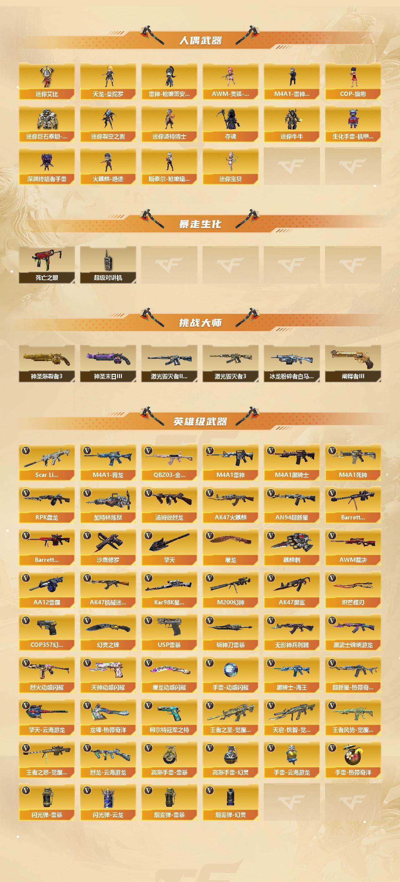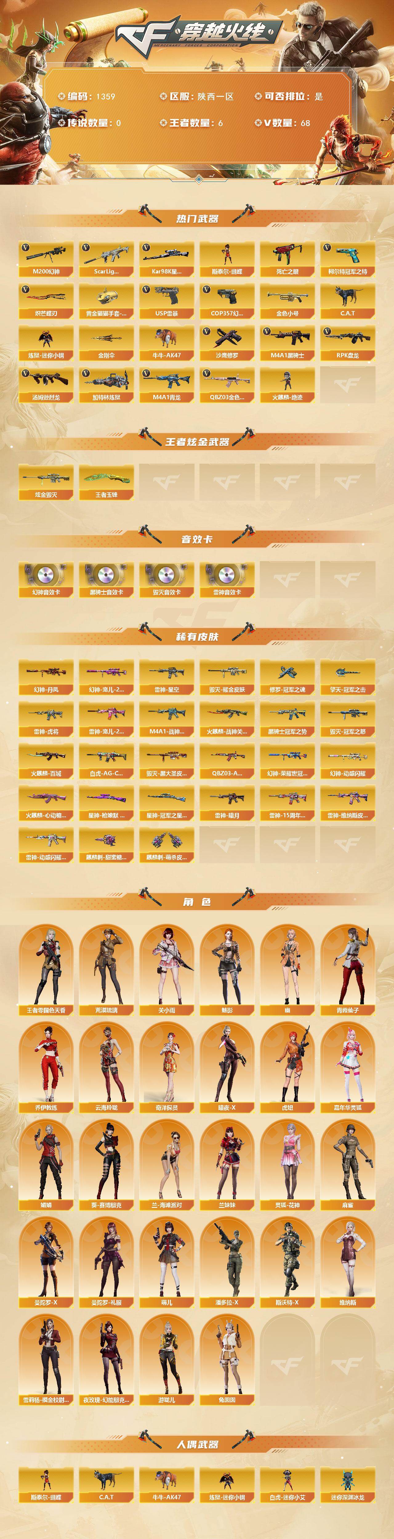 【1359】xg52246陕西一区-68v-6王者-1炫金 【热门武器】:q03-金色蔷薇,scar light-白虎,m4a1-青龙,m200-幻神,死亡之眼,柯尔特-冠军之特,kar98k-星神,金色小号,c.a.t,炼狱-迷你小钢,牛牛-ak47,m4a1-黑骑士,汤姆逊-烈龙2,rpk-盘龙2,加特林-炼狱,斯泰尔-蝴蝶,火麒麟-绝迹,usp-雷暴,cop 357-幻灵3,沙鹰-修罗,炽芒蝶刃,黄金猫猫手套-白鲨,金刚伞 【王者炫金武器】:王者玉锋,炫金毁灭 【音效卡】:m200-幻神音效卡,m4a1-雷神音效卡,m4a1-黑骑士音效卡,barrett-毁灭音效卡 【皮肤】:幻神-丹凤,幻神-宠儿-2021mvp,m200-幻神-荣耀世冠白鲨,幻神-动感闪耀 皮肤,白虎-ag-cfpls20冠军,q03-ag-cfpls19冠军,星神-呛娘默 皮肤,kar98k-星神-冠军之星皮肤,雷神-暗月,雷神-星空,雷神-虎将,m4a1-战神赵云,雷神-宠儿-2019mvp,雷神-15周年嘉年华 皮肤,雷神-维纳斯皮肤,雷神-动感闪耀 皮肤,火麒麟-战神关羽,火麒麟-百城,火麒麟-心动糖果,毁灭耀金皮肤,毁灭-冠军之怒,毁灭-黑大圣皮肤,黑骑士-冠军之势,修罗-冠军之魂,擎天-冠军之击,麒麟刺-甜蜜糖果 皮肤,麒麟刺-萌杀皮肤 【角色】:魅影,荒漠琉璃,关小雨,王者-零-国色天香,奇洋探员,乔伊教练,云海玲珑,暗夜-x,虎妞,嘉年华灵狐,娟娟,葵-赛博朋克,兰-海滩派对,兰妹妹,灵狐-花神,麻雀,曼陀罗-x,曼陀罗-礼服,萌儿,潘多拉-x,青霞仙子,斯沃特-x,兔囡囡,维纳斯,雪莉杨-摸金校尉,夜玫瑰-幻能朋克,幽,游珑儿 【人偶武器】:火麒麟-绝迹,白虎-迷你小艾,天龙-曼陀罗,雷神-呛娘蕾安娜,m4a1-雷神-精英刀锋,炼狱-迷你小钢,迷你宝贝,斯泰尔-蝴蝶,斯泰尔-呛娘暗刃,awm-灵狐-15周年嘉年华,cop-旗袍,c.a.t,牛牛-ak47,迷你深渊冰龙,迷你裂空之翼,迷你波特博士,夺魂,迷你牛牛2,生化手蕾-机甲核心2,深渊终结者手蕾,迷你艾比,迷你巨石泰坦-魔花研究所 【暴走生化】:死亡之眼,超级对讲机 【挑战大师】:神圣爆裂者iii,冰龙粉碎者-白马银呛,激光毁灭者iii-白马银呛,激光毁灭者iii,神圣爆裂者-末日iii,阐释者iii 【英雄级武器】:ak47-火麒麟,m4a1-雷神,m4a1-黑骑士,m4a1-死神,an94-超新星,ak47-机械迷城,ak47-黑鲨,m4a1-青龙,scar light-白虎,无影-神兵利器,黑武士-锦绣游龙,超新星-热带奇洋,q03-金色蔷薇,烈火-动感闪耀,王者之圣-觉醒版,天启-悦智-觉醒版,黑骑士-海王,王者风势-觉醒版,barrett-毁灭,barrett-极光,awm-裁决,m200-幻神,kar98k-星神,王者之怒-觉醒版,rpk-盘龙2,加特林-炼狱,汤姆逊-烈龙2,烈龙-云海游龙,aa-12-雷霆,沙鹰-修罗,usp-雷暴,cop 357-幻灵3,柯尔特-冠军之特,天神-动感闪耀,屠龙,擎天,麒麟刺,幻灵之锋,炽芒蝶刃,屠龙-动感闪耀,擎天-云海游龙,龙啸-热带奇洋,斩神刀-雷暴,高爆手蕾-雷暴4,高爆手蕾-幻灵4,手蕾-动感闪耀,手蕾-云海游龙,手蕾-热带奇洋,闪光丹-雷暴6,闪光丹-云龙,盐雾蛋-雷暴5,盐雾蛋-幻灵 【道具】:ep战队炫彩背包,云海游龙炫彩背包,全能呛王背包,奇洋探员-海龟背包,次元之矛-黄金背包,炫彩背包,热带奇洋炫彩背包,背包-洛丽塔,超级背包,哔哩哔哩名片,灵魂忍者,变异宝贝,夺命之镰,防化服,金色流光-呛王排位2,星辰流光-呛王排位,呛王排位28赛季金色流光,热带奇洋表情,动感闪耀表情,云海游龙表情,c4-黑曜,防弹头盔3,防弹衣3,c4工具钳3,手蕾包3 【特殊呛械】:蝴蝶斯泰尔2烈龙,1白虎,1黑骑士,2烈龙,2盘龙,1炼狱,1蝴蝶斯泰尔