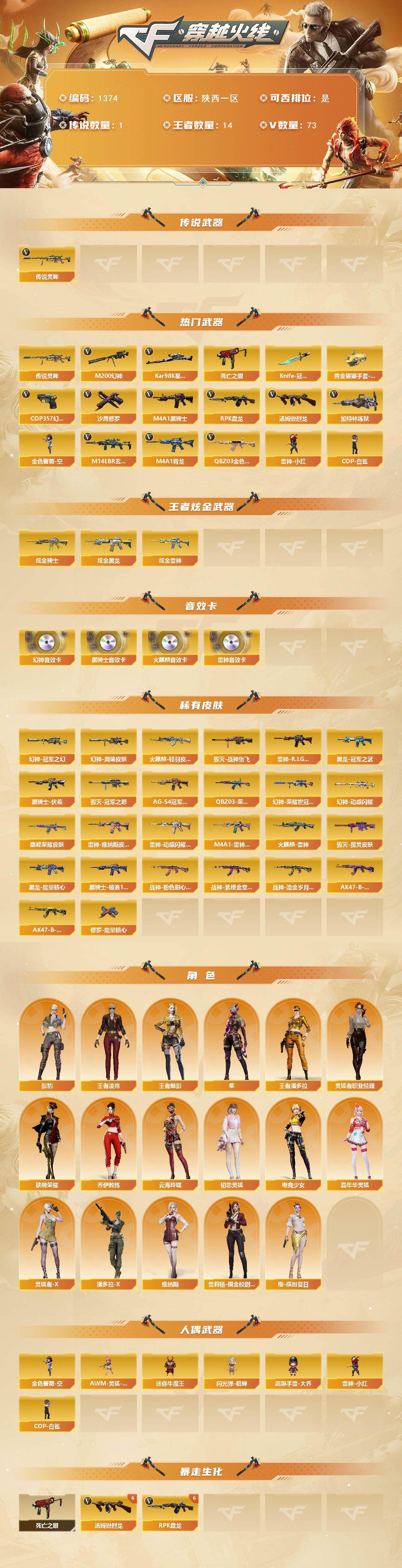 【1374】xg53168陕西一区-73v-14王者-3炫金 【传说武器】:传说灵眸 【热门武器】:传说灵眸,q03-金色蔷薇,m14ebr-玄武,m4a1-青龙,m200-幻神,死亡之眼,kar98k-星神,m4a1-黑骑士,汤姆逊-烈龙6,rpk-盘龙6,加特林-炼狱,金色蔷薇-空,雷神-小红,cop-白鲨,cop 357-幻灵2,沙鹰-修罗2,knife-冠军之刃,黄金猫猫手套-白鲨 【王者炫金武器】:炫金骑士,炫金黑龙,炫金雷神 【音效卡】:m200-幻神音效卡,ak47-火麒麟音效卡,m4a1-雷神音效卡,m4a1-黑骑士音效卡 【皮肤】:幻神-周瑜皮肤,幻神-冠军之幻,m200-幻神-荣耀世冠白鲨,幻神-动感闪耀 皮肤,q03-荣耀世冠白鲨,q03-巅峰荣耀皮肤,雷神-r.lgd-cfpls18冠军,雷神-维纳斯皮肤,雷神-动感闪耀 皮肤,m4a1-雷神-巅峰荣耀皮肤,火麒麟-雷神,火麒麟-轻羽皮肤,毁灭-冠军之怒,毁灭-战神张飞,毁灭-魔灵皮肤,黑龙-能量核心,黑龙-冠军之武,黑骑士-伏羲,黑骑士-ag-s4冠军典藏,黑骑士-破浪10年皮肤,战神-粉色甜心皮肤,战神-紫绶金章皮肤,战神-流金岁月皮肤,ak47-b-常胜将军-曹操2,ak47-b-常胜将军-孙权,修罗-能量核心2 【角色】:影豹,隼,王者凌霄,王者-魅影,王者潘多拉,乔伊教练,云海玲珑,初恋灵狐,电竞少女,嘉年华灵狐,灵狐者-x,灵狐者-职业经理,潘多拉-x,铁骑荣耀,维纳斯,雪莉杨-摸金校尉,樱-缤纷夏日 【人偶武器】:雷神-小红,cop-白鲨,金色蔷薇-空,awm-灵狐-15周年嘉年华,迷你牛魔王,闪光丹-貂蝉,高爆手蕾-大乔 【暴走生化】:死亡之眼 【挑战大师】:冰龙粉碎者-白马银呛,激光毁灭者iii,机甲撕裂者iii,阐释者iii 【英雄级武器】:ak47-火麒麟,m4a1-黑龙2,m4a1-雷神,m4a1-黑骑士,an94-超新星,m4a1-青龙,m14ebr-玄武,无影-神兵利器,q03-金色蔷薇,m4a1-猎神,烈火-动感闪耀,ak-47-猩红传说,王者火魄-觉醒版,黑骑士-海王,ak47-b-常胜将军,王者白虎-觉醒版,q-03-王者蔷薇-觉醒版,王者芳薇-觉醒版,awm-天龙,barrett-毁灭,barrett-极光,m200-幻神,kar98k-星神,barrett-雷霆王者-觉醒版,王者风神-觉醒版,rpk-盘龙6,加特林-炼狱,炼狱-悦蓝-觉醒版,汤姆逊-烈龙6,沙鹰-修罗2,沙鹰-天神,cop 357-幻灵2,天神-动感闪耀,屠龙,麒麟刺,幻灵之锋4,屠龙-动感闪耀,王者之击-觉醒版,高爆手蕾-幻灵6,手蕾-动感闪耀,手蕾-云海游龙,闪光丹-幻灵6,闪光丹-雷霆王者-觉醒版,盐雾蛋-幻灵7 【道具】:ag战队炫彩背包,炫彩背包,超级背包,夺命之镰,防化服,金色流光-呛王排位2,星辰流光-呛王排位,呛王排位28赛季金色流光,动感闪耀表情,防弹头盔,防弹衣,c4工具钳,手蕾包2 【特殊呛械】:1黑骑士,6烈龙,6盘龙,1炼狱