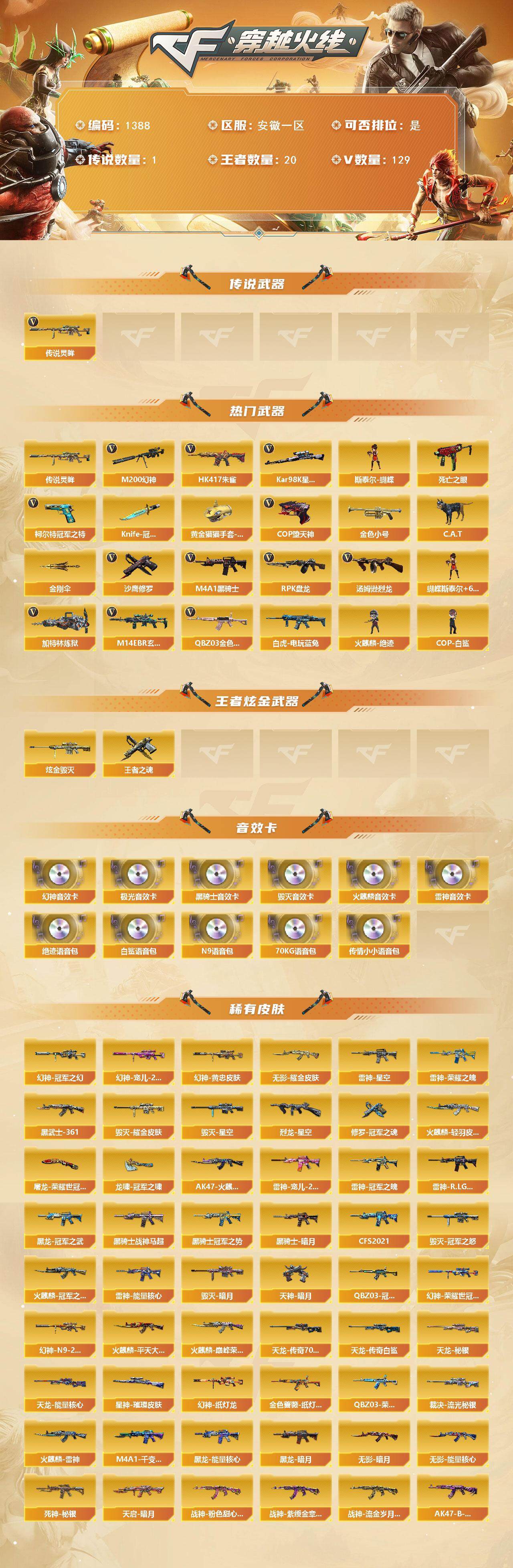 【1388】xg33029安徽一区-129v-20王者-1炫金 【传说武器】:传说灵眸 【热门武器】:传说灵眸,q03-金色蔷薇2,m14ebr-玄武,hk417-朱雀,m200-幻神,死亡之眼2,白虎-电玩蓝兔,柯尔特-冠军之特2,kar98k-星神,金色小号,c.a.t,m4a1-黑骑士2,汤姆逊-烈龙6,rpk-盘龙7,加特林-炼狱2,斯泰尔-蝴蝶,火麒麟-绝迹,cop-白鲨,cop-堕天神2,沙鹰-修罗7,knife-冠军之刃2,黄金猫猫手套-白鲨2,金刚伞 【王者炫金武器】:王者之魂,炫金毁灭 【音效卡】:m200-幻神音效卡,ak47-火麒麟音效卡,m4a1-雷神音效卡,m4a1-黑骑士音效卡,barrett-毁灭音效卡,barrett-极光音效卡,70kg语音包,绝迹语音包,白鲨语音包,n9语音包,传情小小语音包 【皮肤】:m200-幻神-黄忠皮肤,幻神-冠军之幻,幻神-宠儿-2021mvp,m200-幻神-荣耀世冠白鲨,m200-幻神-n9-2022mvp,幻神-纸灯龙皮肤,q03-冠军之薇,金色蔷薇-纸灯龙皮肤,q03-荣耀世冠ep 皮肤,裁决-流光秘银,星神-璀璨皮肤,烈龙-星空,雷神-能量核心2,雷神-荣耀之魄,雷神-星空,雷神-冠军之魄,雷神-宠儿-2019mvp,雷神-r.lgd-cfpls18冠军,火麒麟-雷神,火麒麟-冠军之心2,ak47-火麒麟-传奇even,火麒麟-轻羽皮肤,火麒麟-平天大圣,火麒麟-巅峰荣耀,毁灭-暗月2,毁灭耀金皮肤,毁灭-星空,毁灭-冠军之怒2,m4a1-千变-孔明皮肤,黑龙-能量核心,黑龙-暗月,黑龙-冠军之武,黑骑士-暗月,黑骑士-冠军之势,黑骑士-战神马超,黑骑士-cfs2021,无影-暗月2,无影-能量核心3,无影耀金皮肤,死神-秘银5,ak47-黑武士-361,天启-暗月5,战神-粉色甜心皮肤2,战神-紫绶金章皮肤,战神-流金岁月皮肤,ak47-b-常胜将军-曹操,天龙-秘银,天龙-能量核心,awm-天龙-传奇70kg,awm-天龙-传奇白鲨,极光-能量核心3,炼狱-玩具呛皮肤,修罗-能量核心3,修罗-冠军之魂2,天神-暗月2,屠龙-荣耀世冠ag,龙啸-冠军之啸 【角色】:葵,樱,迷迭香,关小雨,审判者,王者-瞳-闭月羞花,王者-零,王者之瞳,王者-魅影,王者潘多拉,狐影,乔伊教练,云海玲珑,空,暗夜-x,初恋灵狐,电竞少女,芳心审判者,飞虎队-x,风暴女,虎妞,嘉年华灵狐,娟娟,兰-空鹰,兰-新年限定,零-水下丽影,灵狐者-x,灵狐者-黄金海岸,灵狐者-七夕宝贝,龙儿-小淘气,麻雀,曼陀罗-礼服,女主播,潘多拉-x,潜龙队-x,铁骑荣耀,兔囡囡,新娜塔莎,影武者-x,幽,职业选手 【人偶武器】:火麒麟-绝迹,cop-白鲨,白虎-迷你小艾,天龙-曼陀罗,m4a1-雷神-精英刀锋,斯泰尔-蝴蝶,芭蕾特-零-水下丽影2,awm-灵狐-15周年嘉年华,m37-葵,cop-旗袍2,c.a.t,迷你生化手蕾,生化手蕾-机甲核心,闪光丹-小乔,迷你超能女侍 【暴走生化】:死亡之眼2,超级对讲机 【挑战大师】:神圣爆裂者iii,ak47-冰龙粉碎者,激光毁灭者iii,阐释者iii 【英雄级武器】:ak47-火麒麟2,m4a1-黑龙4,m4a1-雷神4,m4a1-黑骑士2,ak47-无影,m4a1-死神3,ak47-黑武士,ak12-天启,an94-超新星,m4a1-武圣,ak47-机械迷城,ak47-黑鲨3,m4a1-龙血,m4a1-堕天神,hk417-朱雀,m14ebr-玄武,q03-天罚,黑武士-锦绣游龙,m4a1-玫瑰精灵4,q03-金色蔷薇2,王者之心-觉醒版,王者之武-觉醒版,王者之魄-觉醒版,ak-47-猩红传说3,ak47-b-战神,黑骑士-海王,q-03-王者蔷薇-觉醒版,白虎-电玩蓝兔,黑武士-cf网剧冠军,awm-天龙,barrett-毁灭5,barrett-极光,awm-裁决,m200-幻神,barrett-朱雀,kar98k-星神,barrett-金色蔷薇,王者之怒-觉醒版,王者之光-觉醒版,王者之力-觉醒版,王者幻神-觉醒版,王者星神-觉醒版2,rpk-盘龙7,加特林-炼狱2,炼狱-悦蓝-觉醒版,汤姆逊-烈龙6,aa-12-雷霆,沙鹰-修罗7,沙鹰-天神2,cop-堕天神2,柯尔特-冠军之特2,天神-动感闪耀,天神-cf网剧冠军,屠龙2,龙啸2,麒麟刺-堕天神2,擎天3,麒麟刺3,龙啸-堕天神,擎天-cf网剧冠军,王者之锋-觉醒版2,高爆手蕾-堕天神6,手蕾-动感闪耀,闪光丹-堕天神6,盐雾蛋-堕天神6,盐雾蛋-云龙 【道具】:ep战队炫彩背包,edg炫彩背包,冰冰企鹅背包-猛男专用,战舰背包,炫彩背包,虎牙炫彩背包,超级背包,女皇终结者-魔龙之吻,妩媚妖姬,黄金生化钩,变异宝贝,生化弹匣,夺命之镰2,防化服,金色流光-呛王排位2,星辰流光-呛王排位,呛王排位28赛季金色流光,语音特效-生化,电玩兔兔表情,循环实验表情,ep战队击杀图标,c4-红龙,防弹头盔5,防弹衣3,c4工具钳2,手蕾包 【特殊呛械】:蝴蝶斯泰尔6烈龙,2黑骑士,6烈龙,6盘龙,2炼狱,1蝴蝶斯泰尔