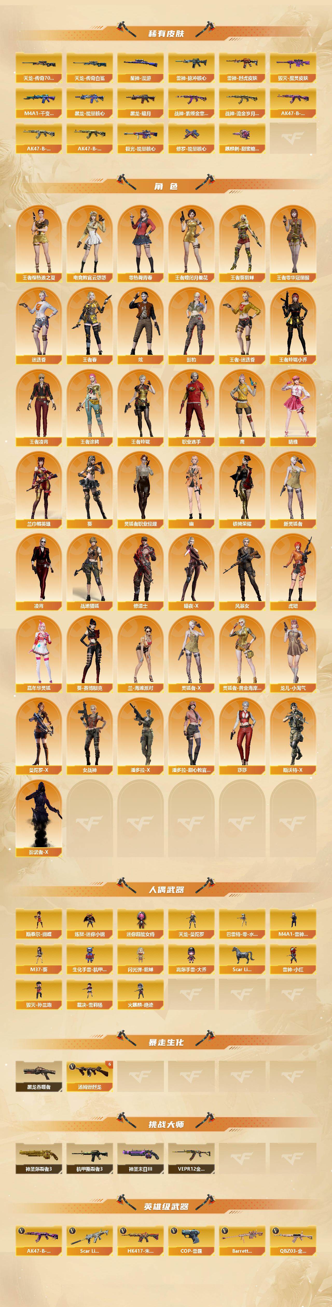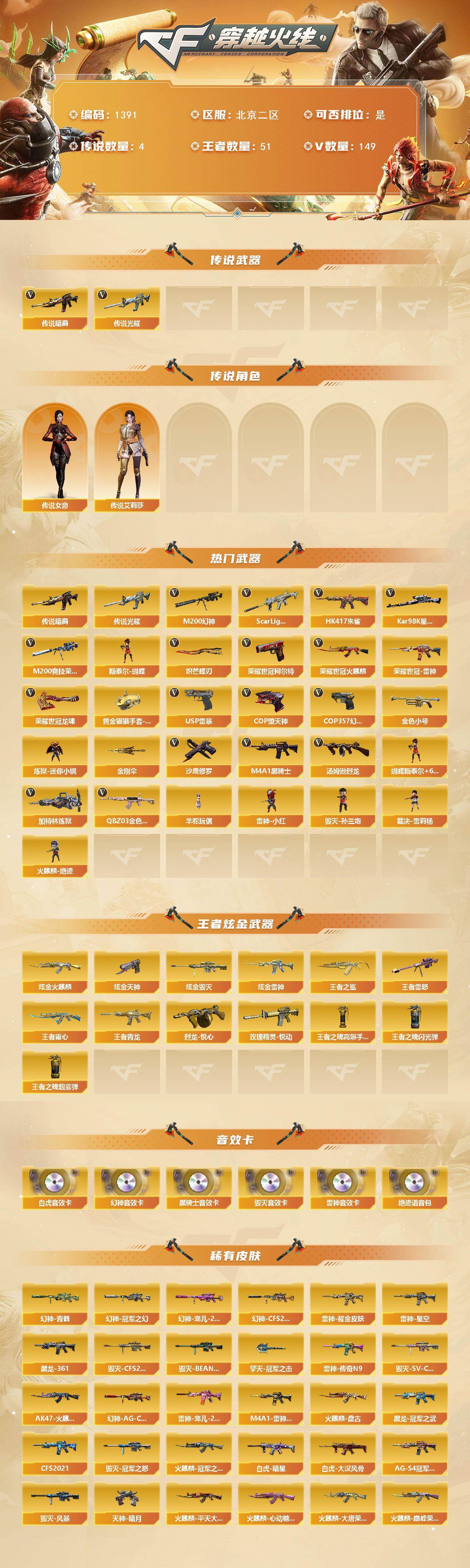 【1391】xg52697北京二区-149v-51王者-4炫金 【传说武器】:传说光耀,传说暗裔 【传说角色】:传说女帝,传说艾莉莎 【热门武器】:传说光耀,传说暗裔,q03-金色蔷薇,scar light-白虎,hk417-朱雀,m200-幻神,m200-竞技荣光,荣耀世冠-火麒麟,荣耀世冠-雷神,荣耀世冠-柯尔特,kar98k-星神,金色小号,炼狱-迷你小钢,m4a1-黑骑士2,汤姆逊-烈龙7,加特林-炼狱2,斯泰尔-蝴蝶,羊驼玩偶,雷神-小红,毁灭-孙三炮,裁决-雪莉杨,火麒麟-绝迹,usp-雷暴,cop-堕天神,cop 357-幻灵3,沙鹰-修罗3,炽芒蝶刃,荣耀世冠-龙啸,黄金猫猫手套-白鲨,金刚伞 【王者炫金武器】:王者之鲨,玫瑰精灵-悦动,王者青龙,王者霜心,王者雷怒,烈龙-悦心,炫金火麒麟,炫金雷神,炫金毁灭,炫金天神,王者之魄高爆手蕾,王者之魄闪光丹,王者之魄盐雾蛋 【音效卡】:m200-幻神音效卡,m4a1-雷神音效卡,m4a1-黑骑士音效卡,barrett-毁灭音效卡,scar light-白虎音效卡,绝迹语音包 【皮肤】:幻神-冠军之幻,幻神-ag-cfpls17冠军,幻神-青鹤,幻神-宠儿-2021mvp,幻神-cfs2022,scar light-白虎-暗星,白虎-大汉风骨,星神-漫游,雷神-星空,m4a1-雷神-cfs 2019,雷神-耀金皮肤,雷神-传奇n9,雷神-宠儿-2019mvp,雷神-烈虎皮肤3,雷神-脉冲核心,火麒麟-冠军之心,ak47-火麒麟-传奇even,火麒麟-平天大圣,火麒麟-盘古,火麒麟-巅峰荣耀,火麒麟-大唐荣光,火麒麟-心动糖果,毁灭-冠军之怒,毁灭-cfs2020,毁灭-sv-cfpls16冠军,毁灭-bean-2020mvp,毁灭-风暴,毁灭-魔灵皮肤,m4a1-千变-孔明皮肤,黑龙-能量核心,黑龙-暗月,m4a1-黑龙-361,黑龙-冠军之武,黑骑士-cfs2021,黑骑士-ag-s4冠军典藏,战神-紫绶金章皮肤,战神-流金岁月皮肤,ak47-b-常胜将军-曹操,ak47-b-常胜将军-刘备,ak47-b-常胜将军-孙权,awm-天龙-传奇70kg2,awm-天龙-传奇白鲨3,极光-能量核心,修罗-能量核心,天神-暗月,擎天-冠军之击,麒麟刺-甜蜜糖果 皮肤 【角色】:葵,炫,迷迭香,凌霄,影豹,电竞教官-云悠悠,鹰,兰-巾帼英雄,晴雅,战地猎狐,王者-瞳-闭月羞花,王者零-华冠丽服,王者樱-热浪之夏,王者-葵-貂蝉,王者春,王者凌霄,王者涂鸦,王者玲珑,王者-迷迭香,王者玲珑-小乔,修道士,暗夜-x,风暴女,虎妞,嘉年华灵狐,葵-赛博朋克,兰-海滩派对,零-热舞青春,灵狐者-x,灵狐者-黄金海岸,灵狐者-职业经理,龙儿-小淘气,曼陀罗-x,女战神,潘多拉-x,潘多拉-甜心教官,莎莎,斯沃特-x,铁骑荣耀,新灵狐者,影武者-x,幽,职业选手 【人偶武器】:雷神-小红,火麒麟-绝迹,毁灭-孙三炮,裁决-雪莉杨,天龙-曼陀罗,m4a1-雷神-精英刀锋,炼狱-迷你小钢,斯泰尔-蝴蝶,芭蕾特-零-水下丽影,scar light-马呛,m37-葵,生化手蕾-机甲核心2,闪光丹-貂蝉,高爆手蕾-大乔,迷你超能女侍 【暴走生化】:黑龙吞噬者 【挑战大师】:神圣爆裂者iii,vepr-12-金魔,机甲撕裂者iii,神圣爆裂者-末日iii 【英雄级武器】:m4a1-千变,ak47-火麒麟2,ak47-麒麟,m4a1-黑龙,m4a1-雷神,m4a1-黑骑士2,ak12-天启,an94-超新星,m4a1-武圣,ak47-机械迷城,ak47-黑鲨,m4a1-龙血,hk417-朱雀,scar light-白虎,m4a1-夜魔,m4a1-幻灵,m4a1-神工天巧,无影-神兵利器,m4a1-玫瑰精灵3,q03-金色蔷薇,m4a1-猎神2,王者之武-觉醒版,王者之魄-觉醒版,王者之势-觉醒版,王者之戮-觉醒版,王者之幻-觉醒版,ak-47-猩红传说,ak47-b-战神,王者之鲨-觉醒版2,王者火魄-觉醒版,黑骑士-海王,ak47-b-常胜将军,王者之烈-觉醒版,王者白虎-觉醒版,m4a1-雷霆王者-觉醒版,q-03-王者蔷薇-觉醒版,白虎之魄-觉醒版,荣耀世冠-火麒麟,荣耀世冠-雷神,黑武士-cf网剧冠军,awm-天龙,barrett-毁灭,barrett-极光,awm-裁决,m200-幻神,barrett-朱雀,kar98k-星神,m200-竞技荣光,barrett-金色蔷薇,王者之怒-觉醒版,王者之决-觉醒版,王者幻神-觉醒版2,barrett-雷霆王者-觉醒版,王者星神-觉醒版,加特林-炼狱2,汤姆逊-烈龙7,aa-12-雷霆,沙鹰-修罗3,沙鹰-天神3,usp-雷暴,cop-雷霆,cop-堕天神,cop 357-雷霆王者-觉醒版3,cop 357-幻灵3,荣耀世冠-柯尔特,柯尔特-竞技荣光,破空呛刃-夜魔,usp-神工天巧2,王者之魂-觉醒版,王者之灵-觉醒版,glock18-武圣,天神-cf网剧冠军,屠龙2,龙啸,麒麟刺-堕天神,马来剑-夜魔,擎天,麒麟刺3,幻灵之锋2,擎天-竞技荣光,炽芒蝶刃,唐刀-神工天巧2,荣耀世冠-龙啸,龙啸-堕天神,斩神刀-雷暴,擎天-cf网剧冠军,王者之锋-觉醒版,王者之啸-觉醒版2,王者之击-觉醒版,雷霆王者之锋-觉醒版,高爆手蕾-雷暴2,高爆手蕾-堕天神2,高爆手蕾-夜魔7,高爆手蕾-竞技荣光,高爆手蕾-神工天巧2,闪光丹-雷暴2,闪光丹-堕天神2,闪光丹-夜魔7,闪光丹-竞技荣光,闪光丹-神工天巧2,闪光丹-雷霆王者-觉醒版,盐雾蛋-雷暴2,盐雾蛋-堕天神2,盐雾蛋-夜魔7,盐雾蛋-竞技荣光,盐雾蛋-神工天巧2,盐雾蛋-雷霆王者-觉醒版 【道具】:ag战队炫彩背包,bs战队炫彩背包,ep战队炫彩背包,kz战队炫彩背包,q9战队炫彩背包,r.lgd炫彩背包,we炫彩背包,战舰背包,背包-葫芦兄弟,虎牙炫彩背包,超级背包,救世主-黑桃战神,变异宝贝,生化弹匣,夺命之镰,防化服,金色流光-呛王排位2,星辰流光-呛王排位,呛王排位28赛季金色流光,语音特效-机器人,语音特效-生化,芳心审判者表情,电玩兔兔表情,循环实验表情,cfpl选手表情-第1套,cfpl选手表情-第2套,c4-高无钳,防弹头盔4,防弹衣3,c4工具钳2,手蕾包4 【特殊呛械】:蝴蝶斯泰尔6烈龙,1白虎,2黑骑士,6烈龙,2炼狱,1蝴蝶斯泰尔