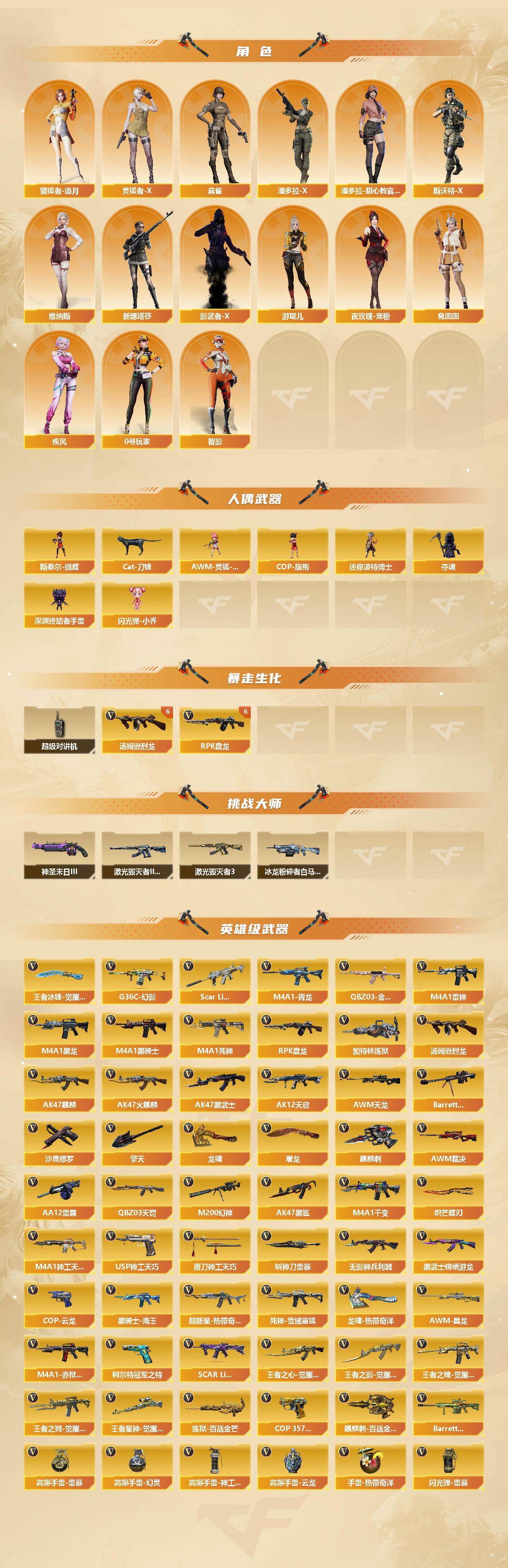 [14568800]重庆一区-97v-20王者-2炫金 【传说武器】:传说幽瞳 【热门武器】:传说幽瞳,g36c-幻影,q03-金色蔷薇,scar light-白虎,m4a1-青龙,m200-幻神,柯尔特-荣耀世冠白鲨20233,柯尔特-冠军之特,金色小号,cat-刀锋,m4a1-黑骑士2,汤姆逊-烈龙6,rpk-盘龙6,加特林-炼狱,斯泰尔-蝴蝶,沙鹰-修罗3,knife-冠军之刃,炽芒蝶刃,炽芒蝶刃-荣耀世冠白鲨2023 皮肤 【王者炫金武器】:炫金火麒麟,炫金修罗 【音效卡】:m200-幻神音效卡,m4a1-雷神音效卡,m4a1-黑骑士音效卡,barrett-毁灭音效卡,awm-裁决音效卡,scar light-白虎音效卡,q03-天罚音效卡 【皮肤】:幻神-冠军之幻,幻神-荣耀世冠白鲨2023 皮肤,幻神-荣耀世冠ep 皮肤,白虎-大汉风骨,scarlight-白虎-冠军之虎皮肤,白虎-热带奇洋 皮肤,白虎-百战金芒 皮肤,q03-荣耀世冠白鲨,金色蔷薇-热带奇洋 皮肤,裁决-巅峰荣耀 皮肤,裁决-羽掣 皮肤,裁决-运输船 皮肤,雷神-暗月,雷神-荣耀之魄,雷神-脉冲核心,雷神-宇航兔皮肤,m4a1-再燃火线,火麒麟-雷神,火麒麟-轻羽皮肤,火麒麟-大唐荣光,火麒麟-玉面羞花 皮肤,毁灭-荣耀之怒,毁灭-魔灵皮肤,黑龙-能量核心,黑龙-冠军之武,黑骑士耀金皮肤,黑骑士-冠军之势,黑骑士-ag-s4冠军典藏,无影-能量核心,awm-天龙-传奇白鲨,屠龙-荣耀之锋2,龙啸-冠军之啸,轻型军用手斧-再燃火线,擎天-冠军之击,麒麟刺-荣耀世冠白鲨,炽芒蝶刃-荣耀世冠白鲨2023 皮肤 【角色】:樱,鹰,隼,机械姬,荆棘,战地猎狐,雪域霜狐,奇洋探员,修道士,暗夜-x,电竞少女,飞虎队-x,风暴女,嘉年华灵狐,疾风,兰-海滩派对,猎狐者-追月,0号玩家,灵狐者-x,麻雀,潘多拉-x,潘多拉-甜心教官,青霞仙子,斯沃特-x,蜀雪,铁骑荣耀,兔囡囡,维纳斯,新娜塔莎,夜玫瑰-宠粉,影武者-x,游珑儿,智影 【人偶武器】:斯泰尔-蝴蝶,awm-灵狐-15周年嘉年华2,cop-旗袍,cat-刀锋,迷你波特博士,夺魂,深渊终结者手蕾,闪光丹-小乔 【暴走生化】:超级对讲机 【挑战大师】:冰龙粉碎者-白马银呛2,激光毁灭者iii-白马银呛2,激光毁灭者iii3,神圣