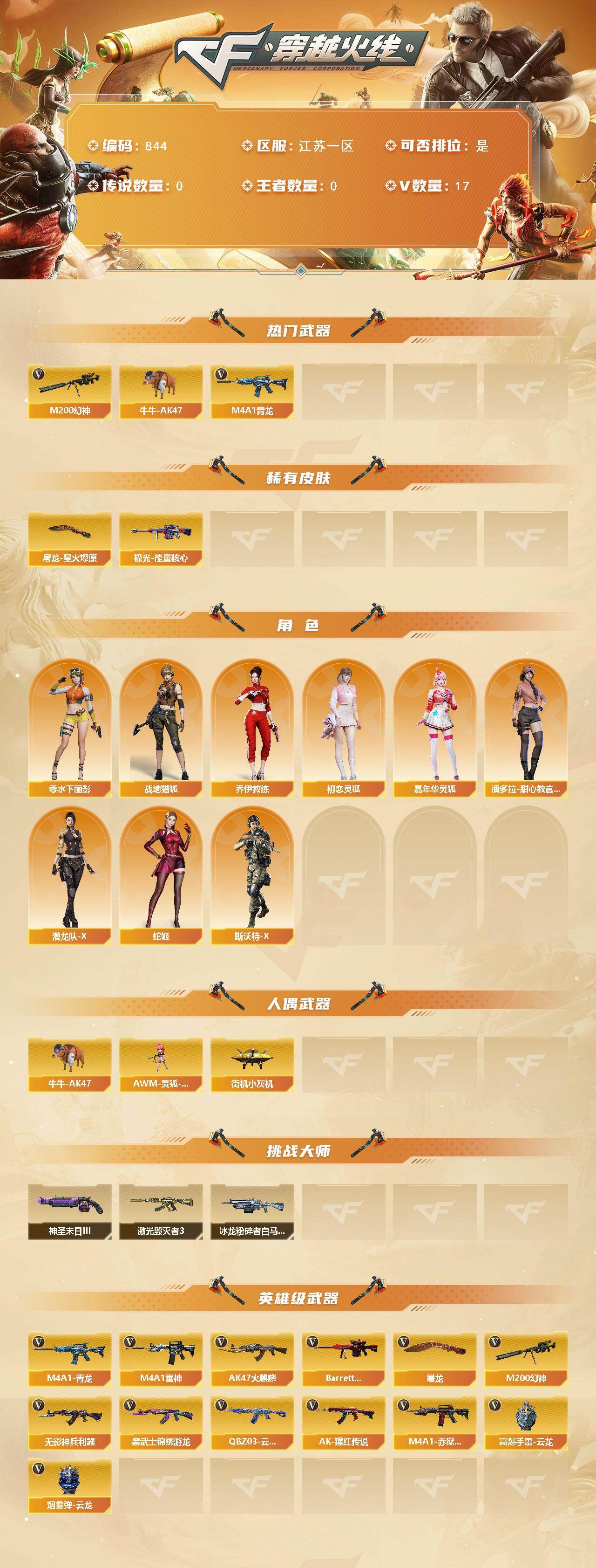 [14569002]江苏一区-17v-0王者-0炫金 【热门武器】:m4a1-青龙,m200-幻神,牛牛-ak47 【皮肤】:极光-能量核心,屠龙-星火燎原 【角色】:战地猎狐,乔伊教练,初恋灵狐,嘉年华灵狐,零-水下丽影,潘多拉-甜心教官,潜龙队-x,蛇姬,斯沃特-x 【人偶武器】:街机小灰机,awm-灵狐-15周年嘉年华,牛牛-ak47 【挑战大师】:冰龙粉碎者-白马银呛,激光毁灭者iii,神圣爆裂者-末日iii 【英雄级武器】:ak47-火麒麟,m4a1-雷神,m4a1-青龙,无影-神兵利器,q03-云龙,黑武士-锦绣游龙,ak-47-猩红传说,barrett-极光,m200-幻神,屠龙2,高爆手蕾-云龙,盐雾蛋-云龙,m4a1-赤狱骑士 【道具】:bs战队炫彩背包,云山科技背包,全能呛王背包,背包-洛丽塔,超级背包,救世主-黑桃战神,黄金生化钩,绿色巨人,灵魂忍者,迷雾幽灵,夺命之镰,防化服3,金色流光-呛王排位2,星辰流光-呛王排位,呛王排位28赛季金色流光,ep战队名片,防弹头盔4,防弹衣4,c4工具钳3,手蕾包4 【特殊呛械】: