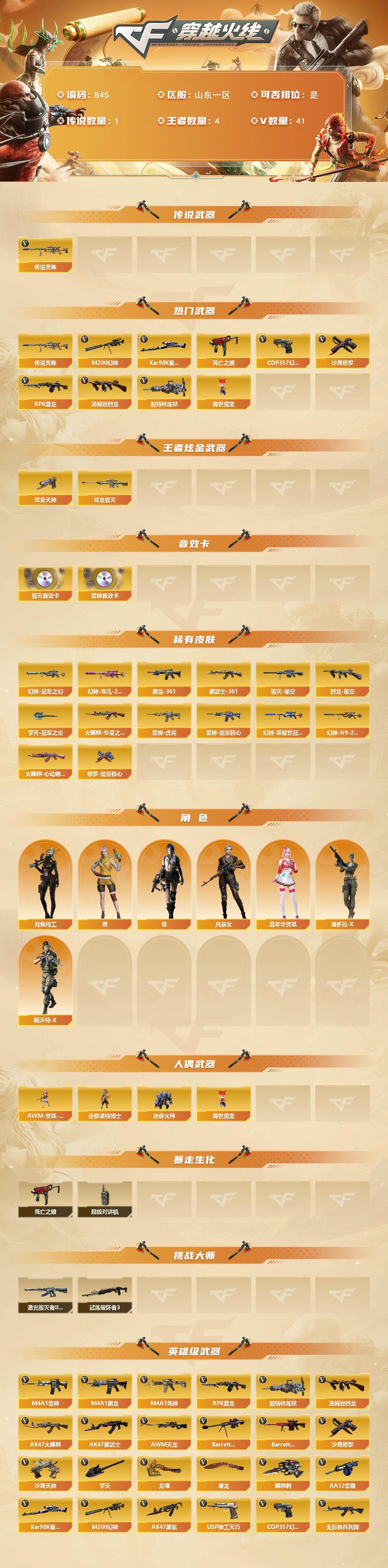 [14569042]山东一区-41v-4王者-2炫金 【传说武器】:传说灵眸 【热门武器】:传说灵眸,m200-幻神,死亡之眼,kar98k-星神,汤姆逊-烈龙,rpk-盘龙,加特林-炼狱2,降世魔童,cop 357-幻灵,沙鹰-修罗2 【王者炫金武器】:炫金毁灭,炫金天神 【音效卡】:m4a1-雷神音效卡,barrett-毁灭音效卡 【皮肤】:幻神-冠军之幻,幻神-宠儿-2021mvp,m200-幻神-荣耀世冠白鲨,m200-幻神-n9-2022mvp,烈龙-星空,雷神-能量核心,雷神-虎将,火麒麟-华夏之心,火麒麟-心动糖果,毁灭-星空,m4a1-黑龙-361,ak47-黑武士-361,修罗-能量核心,擎天-冠军之击 【角色】:零,鹰,月兔特工,风暴女,嘉年华灵狐,潘多拉-x,斯沃特-x 【人偶武器】:awm-灵狐-15周年嘉年华,迷你波特博士,迷你火种,降世魔童 【暴走生化】:死亡之眼,超级对讲机 【挑战大师】:激光毁灭者iii-白马银呛,试炼破坏者iii 【英雄级武器】:ak47-火麒麟,m4a1-黑龙,m4a1-雷神,m4a1-死神,ak47-黑武士,ak47-黑鲨,无影-神兵利器,q-03-王者蔷薇-觉醒版,awm-天龙,barrett-毁灭,barrett-极光,m200-幻神,kar98k-星神,王者之怒-觉醒版,王者风神-觉醒版,rpk-盘龙,加特林-炼狱2,汤姆逊-烈龙,aa-12-雷霆,沙鹰-修罗2,沙鹰-天神,cop 357-幻灵,usp-神工天巧,屠龙2,龙啸,擎天,麒麟刺,王者之锋-觉醒版,高爆手蕾-幻灵,高爆手蕾-神工天巧2,闪光丹-幻灵,闪光丹-神工天巧2,盐雾蛋-幻灵,盐雾蛋-神工天巧2 【道具】:xrock炫彩背包,战舰背包,次元之矛-黄金背包,夺命之镰,防化服,金色流光-呛王排位2,星辰流光-呛王排位,呛王排位28赛季金色流光,防弹头盔2,防弹衣3,c4工具钳,手蕾包2 【特殊呛械】:1烈龙,1盘龙,2炼狱