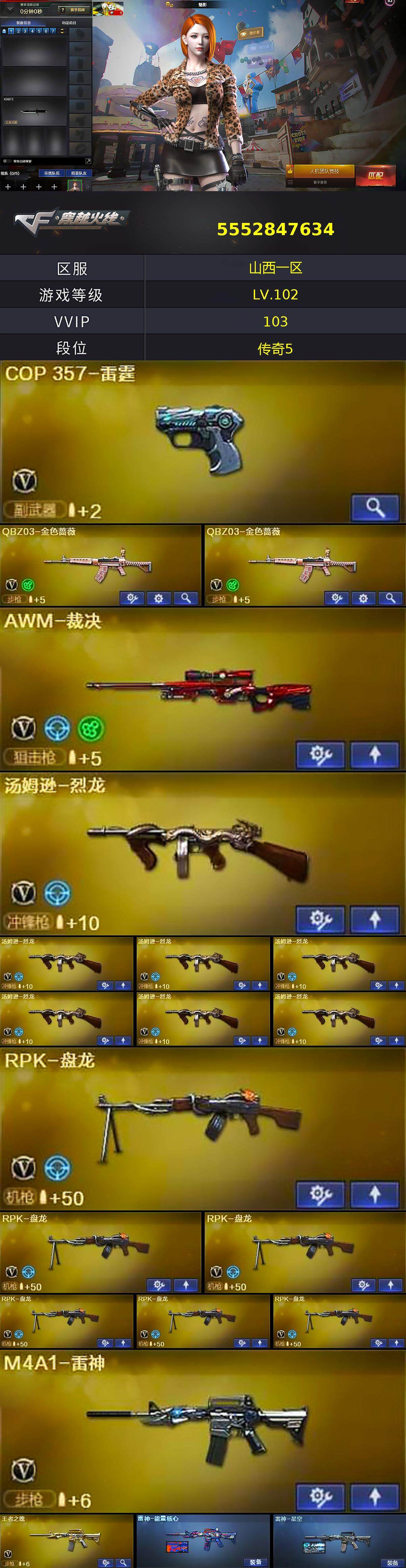 山西一区-101v-5王者-5炫金 【热门武器】:q03-金色蔷薇2,死亡之眼,m4a1-黑骑士3,汤姆逊-烈龙7,rpk-盘龙6,加特林-炼狱3,沙鹰-修罗3 【王者炫金武器】:王者之怒,炫金火麒麟,炫金骑士,炫金无影,炫金黑龙,炫金天龙,王者之魄闪光丹 【音效卡】:barrett-毁灭音效卡 【皮肤】:雷神-能量核心,雷神-星空,火麒麟-雷神,毁灭耀金皮肤,毁灭-星空,毁灭