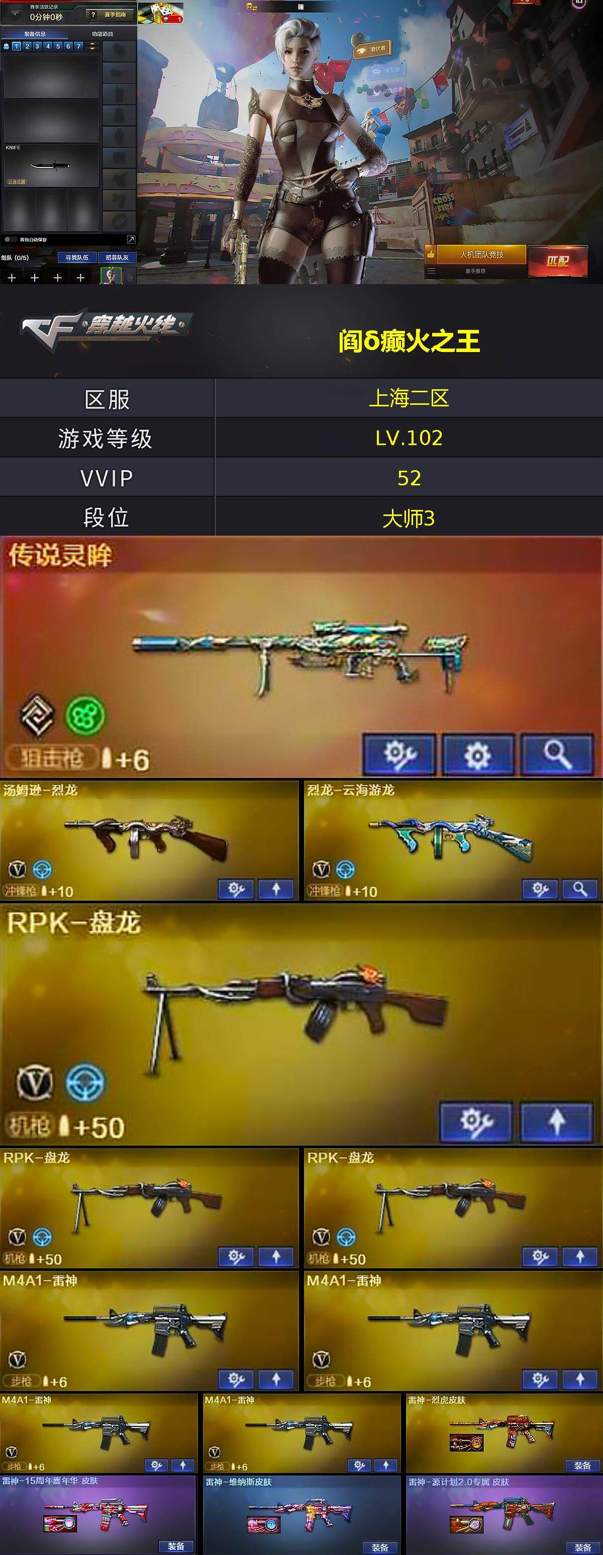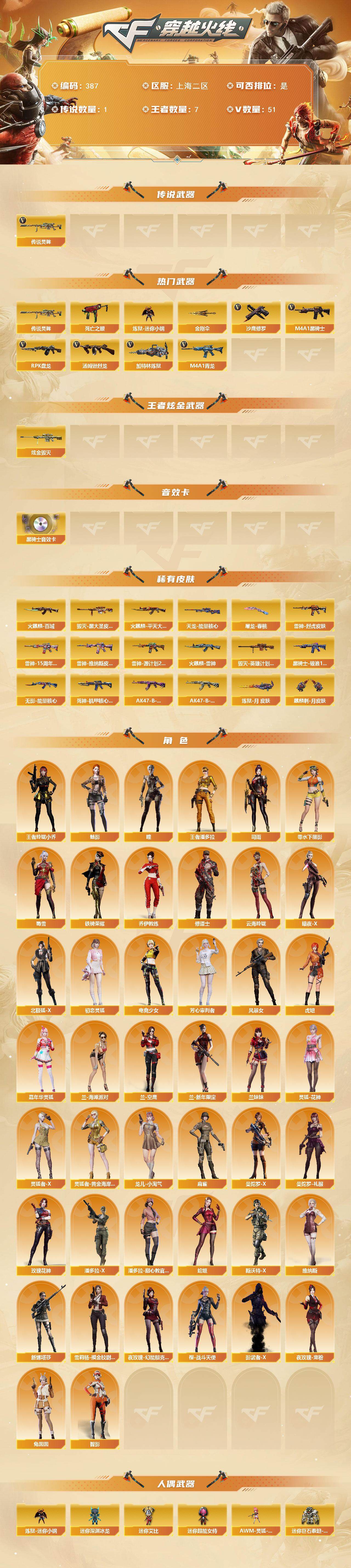 上海二区-51v-7王者-1炫金 【传说武器】:传说灵眸 【热门武器】:传说灵眸,m4a1-青龙,死亡之眼,炼狱-迷你小钢,m4a1-黑骑士,汤姆逊-烈龙,rpk-盘龙3,加特林-炼狱,沙鹰-修罗3,金刚伞 【王者炫金武器】:炫金毁灭 【音效卡】:m4a1-黑骑士音效卡 【皮肤】:雷神-烈虎皮肤