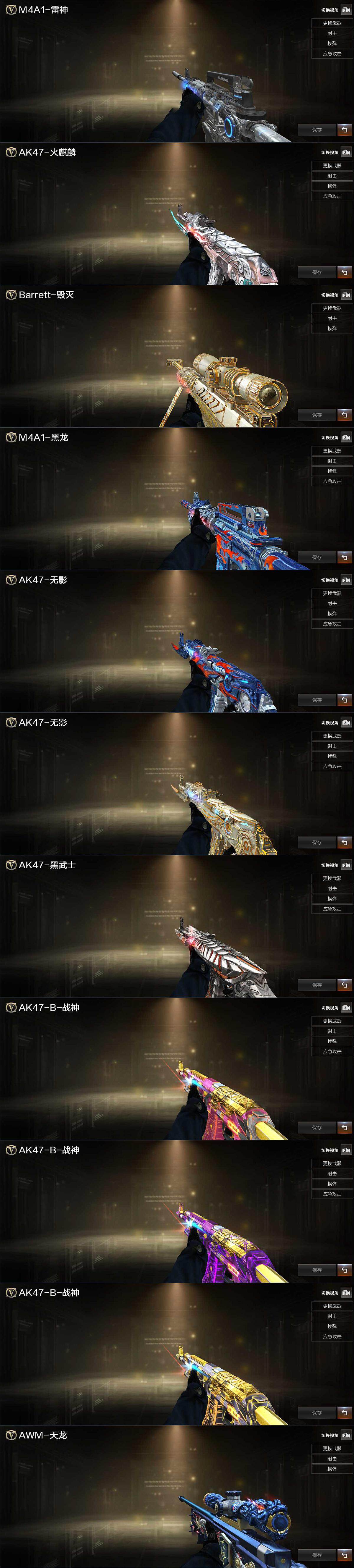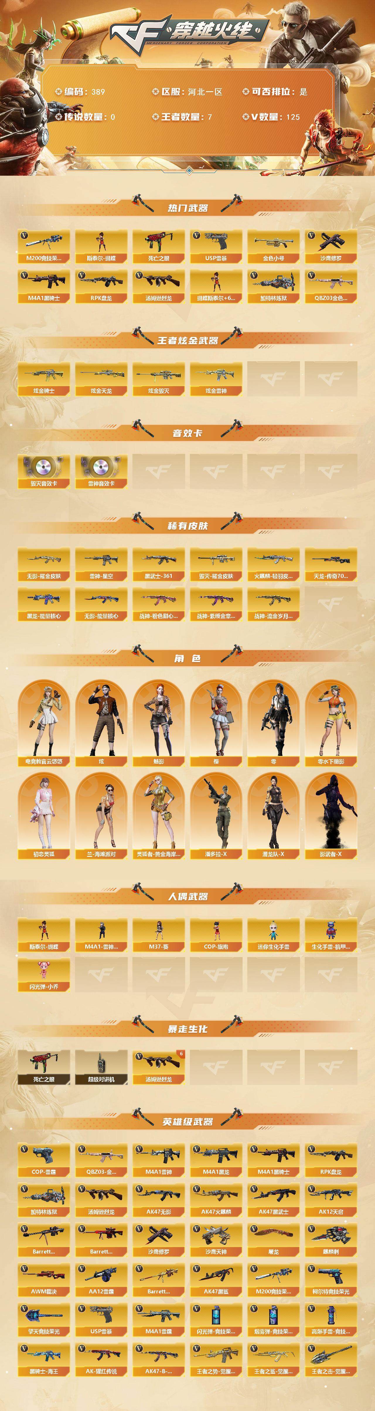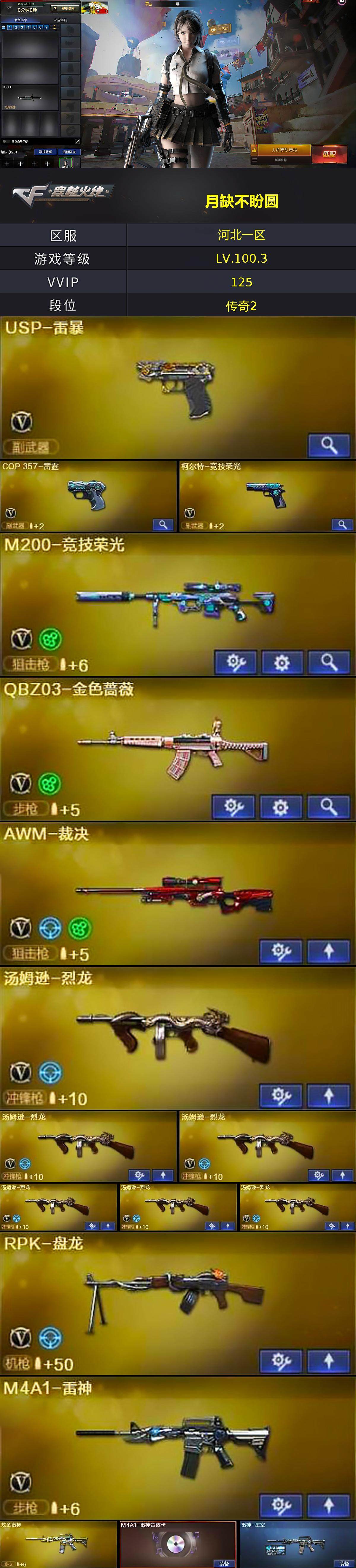 河北一区-125v-7王者-4炫金 【热门武器】:q03-金色蔷薇,m200-竞技荣光,死亡之眼,金色小号,m4a1-黑骑士5,汤姆逊-烈龙6,rpk-盘龙,加特林-炼狱,斯泰尔-蝴蝶,usp-雷暴,沙鹰-修罗8 【王者炫金武器】:炫金骑士,炫金雷神,炫金毁灭,炫金天龙 【音效卡】:m4a