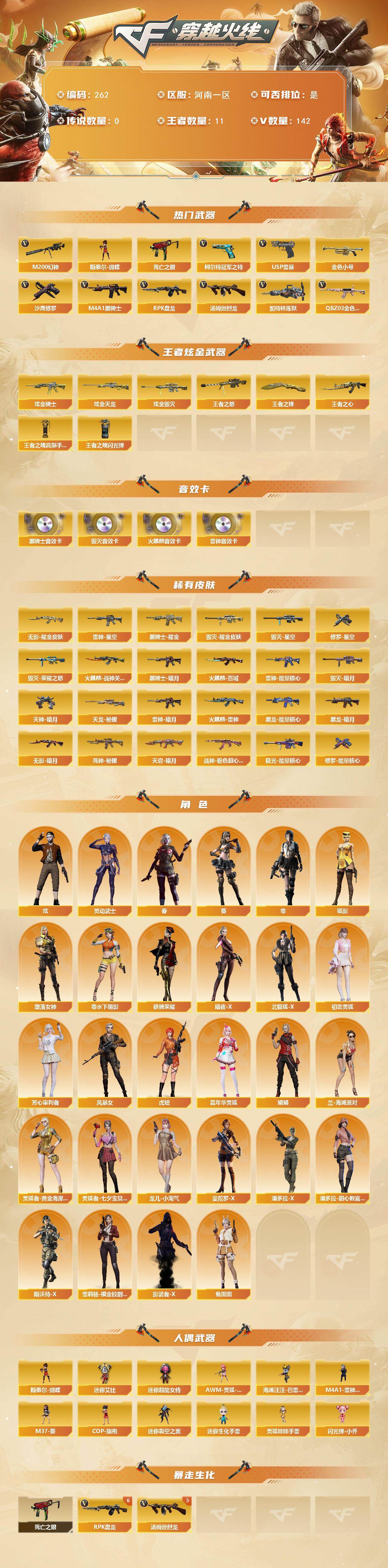 【262】特92887北部河南一区可排位可二次【河南一区/142v/vip6】【纯白无封号/送4w点券/生化爆破全能号/绝版老海豹/雷暴套/雷霆套/6盘龙炼狱/6修罗/5烈龙蝴蝶/15把手呛拉满/冠军之特/usp雷暴/cop雷霆/10多套雷/5张音效卡】【m200-幻神】【柯尔特-冠军之特/usp-雷暴2】【q03-金色蔷薇/q03-金色蔷薇音效卡】【m4a1-雷神2/m4a1-雷神音效卡/雷神-星空/雷神-暗月/雷神-能量核心】【雷霆之契】【barrett-毁灭4/barrett-毁灭音效卡/毁灭-荣耀之怒/毁灭-星空/毁灭耀金皮肤2/毁灭-暗月7】【ak47-火麒麟3/ak47-火麒麟音效卡/火麒麟-百城/火麒麟-cfstar3/火麒麟-战神关羽/火麒麟-雷神】【m4a1-黑骑士2/m4a1-黑骑士音效卡/黑骑士-海王/黑骑士耀金皮肤】【m4a1-黑龙2/黑龙-能量核心】【ak47-无影4/无影-神兵利器】【ak47-黑武士】【awm-天龙4/天龙-秘银2】【barrett-极光/极光-能量核心】【awm-裁决】【m4a1-死神/死神-秘银2/m4a1-千变】【汤姆逊-烈龙5】【rpk-盘龙6】【加特林-炼狱2】【斯泰尔-蝴蝶/死亡之眼/迷你生化手蕾3】【沙鹰-修罗8/修罗-星空/修罗-能量核心】【沙鹰-天神3】【麒麟刺】【擎天】【屠龙5】【龙啸5】【炫/春/龙儿-小淘气/暗夜-x/兰-海滩派对/灵动武士/狐影/堕落女神/木兰/兔囡囡/零-水下丽影/灵狐者-黄金海岸/娟娟/潘多拉-x/斯沃特-x/救世主-x/影武者-x/铁骑荣耀/幻影/堕天使/复仇者】【m4a1-玫瑰精灵2/m4a1-猎神2/m4a1-雷霆2/m4a1-武圣】【ak47-b-常胜将军/ak47-b-身先士卒/ak-47-猩红传说】【ak47-雷暴/ak47-黑鲨2/ak12-天启/天启-暗月】【an94-超新星2】【barrett-暗月传说】【colt 1911-大黄蜂3/cop 357-青龙2/新usp-呛王排位奖励5】【斩魔刀/斩神刀2/金刚伞-电玩红兔】【神圣爆裂者iii/激光毁灭者iii/冰龙粉碎者-白马银呛】【斯泰尔-巧克力】【m4a1-雷神-精英刀锋/cop-旗袍/m37-葵/海滩汪汪-芭蕾特/迷你裂空之翼/金色小号】【王者之心/王者之影/王者之魄/王者之势/王者之锋】【高爆手蕾-雷暴7/闪光丹-雷暴7/盐雾蛋-雷暴7】【高爆手蕾-雷霆8/闪光丹-雷霆8/盐雾蛋-雷霆8】【高爆手蕾-幻灵】【炫金骑士/炫金毁灭/炫金天龙】【语音特效-机器人】