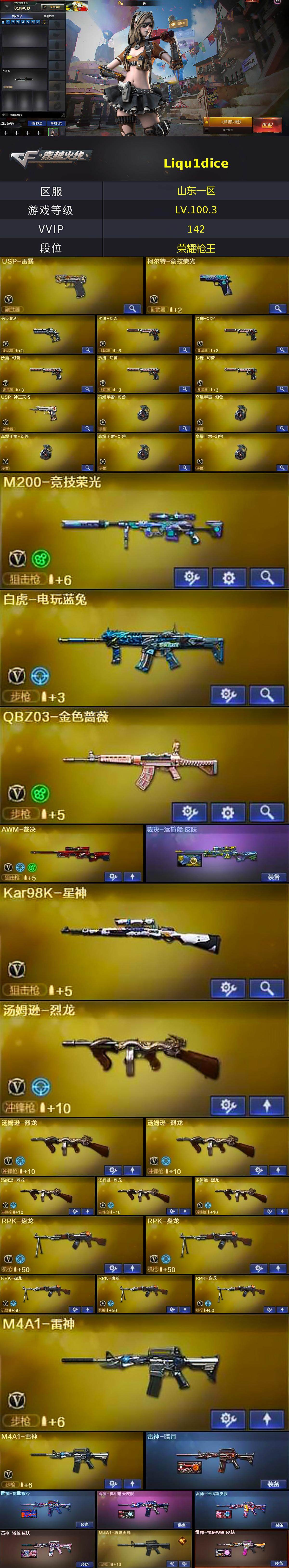 山东一区-141v-9王者-4炫金 【热门武器】:q03-金色蔷薇,m200-竞技荣光,死亡之眼2,白虎-电玩蓝兔,kar98k-星神,m4a1-黑骑士6,汤姆逊-烈龙6,rpk-盘龙5,usp-雷暴,沙鹰-修罗2,炽芒蝶刃,高爆手蕾-幻兽5 【王者炫金武器】:玫瑰精灵-悦动4,炼狱-悦蓝,炫金超新星,炫金毁灭2,炫金天龙 【音效卡】:barrett-碧霄极光音效卡,炼狱-