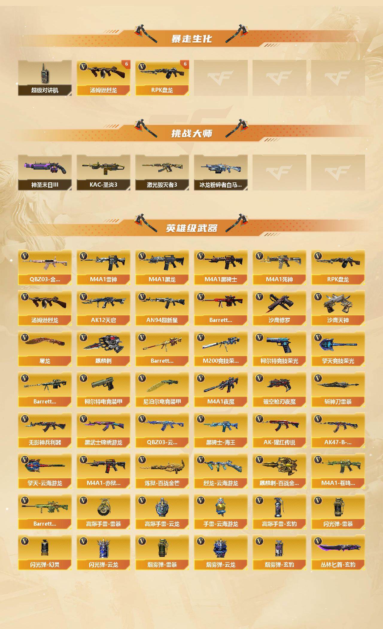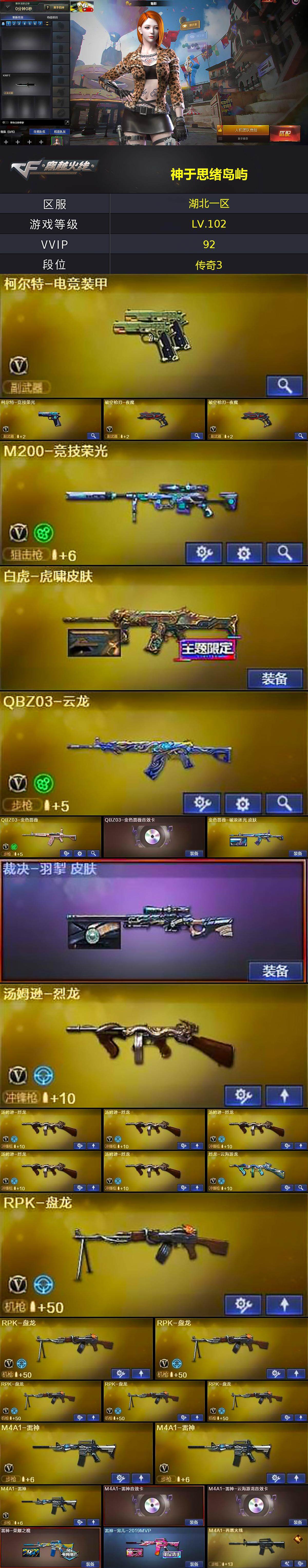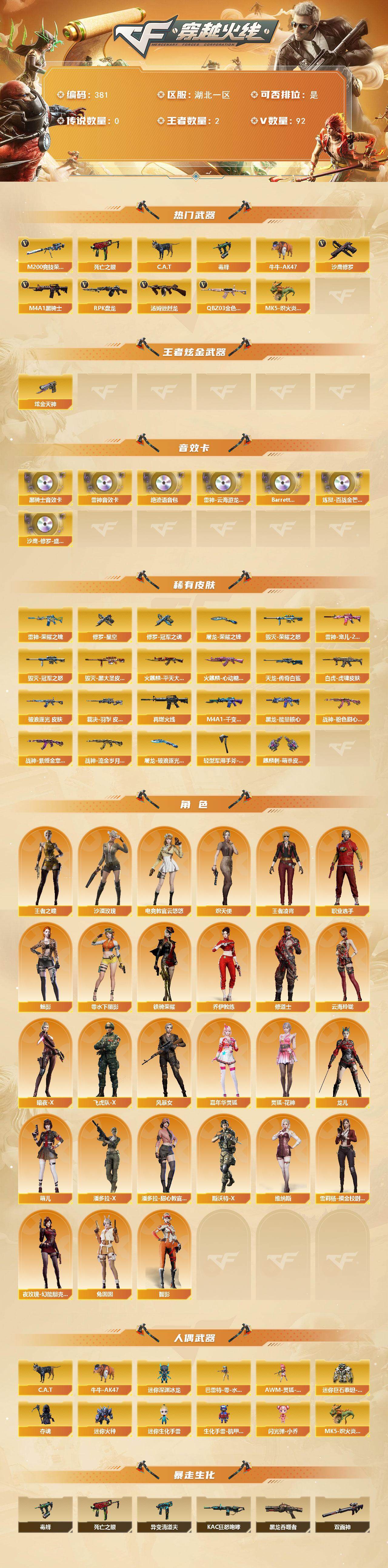 湖北一区-92v-2王者-1炫金 【热门武器】:q03-金色蔷薇,m200-竞技荣光,死亡之眼,c.a.t,毒蜂,牛牛-ak47,m4a1-黑骑士,汤姆逊-烈龙6,rpk-盘龙6,5-炽火炎龙,沙鹰-修罗2 【王者炫金武器】:炫金天神 【音效卡】:m4a1-雷神音效卡,m4a1-雷神-云海游龙音效卡,m4a1-黑骑士音效卡,绝迹语音包,barrett-碧霄极光音效卡3,炼狱-百