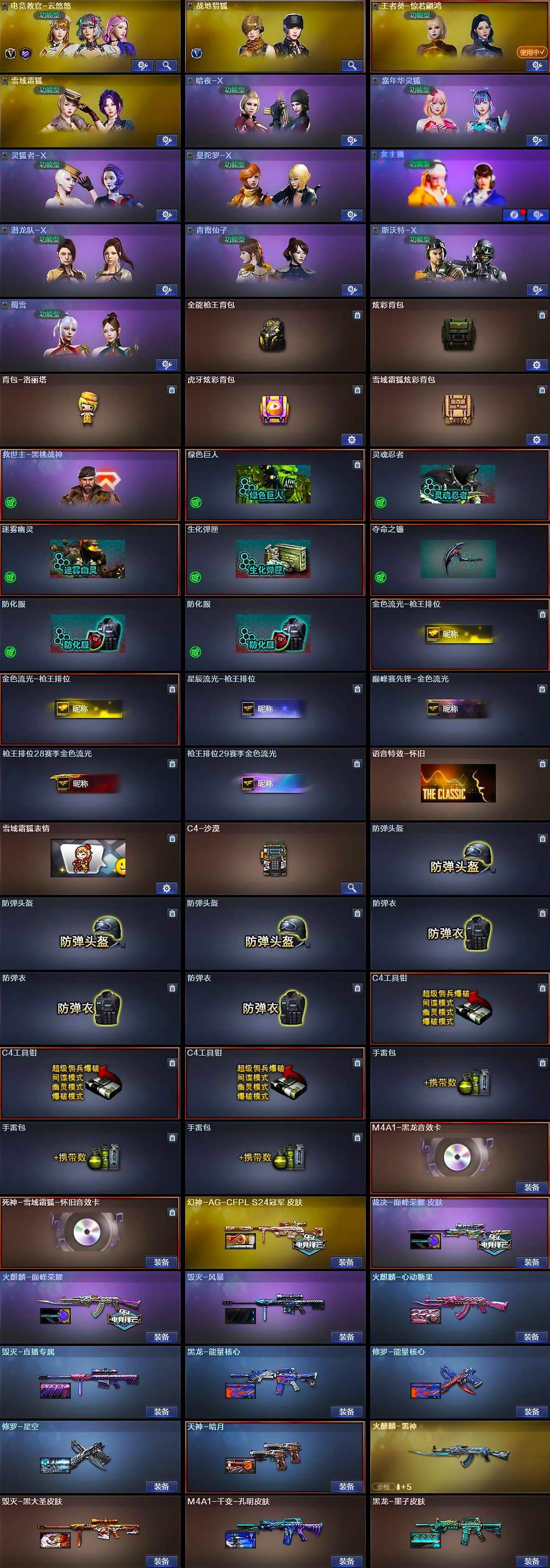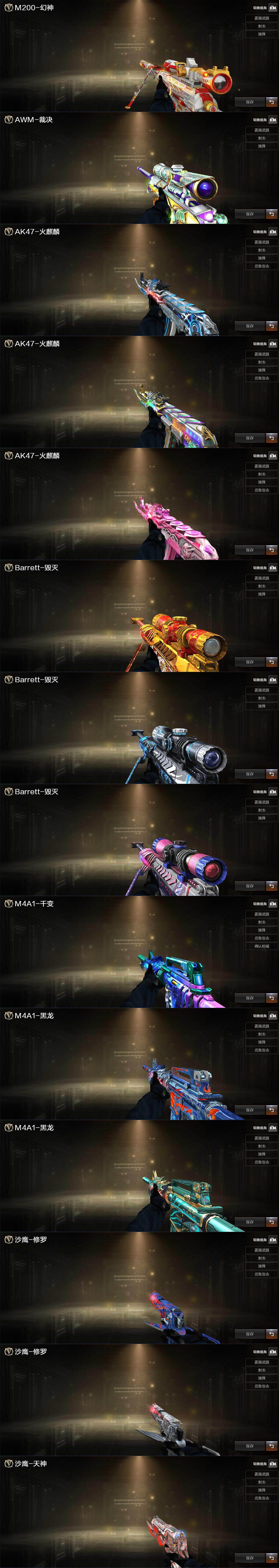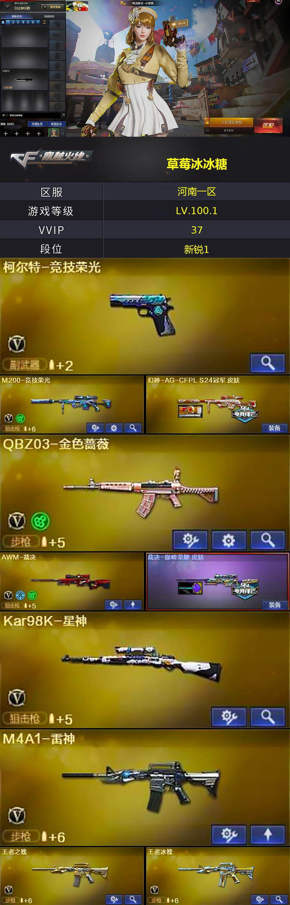 河南一区-35v-12王者-1炫金 【热门武器】:q03-金色蔷薇,m200-竞技荣光,kar98k-星神,加特林-炼狱,沙鹰-修罗2 【王者炫金武器】:炫金毁灭 【音效卡】:m4a1-黑龙音效卡,死神-雪域霜狐-怀旧音效卡,传情小小语音包 【皮肤】:幻神-ag-cfpl s24冠军 皮肤,裁决-巅峰荣耀 皮肤,火麒麟-雷神,火麒麟-巅峰荣耀,火麒麟-心动糖果,毁灭-黑大圣皮肤,毁灭-风
