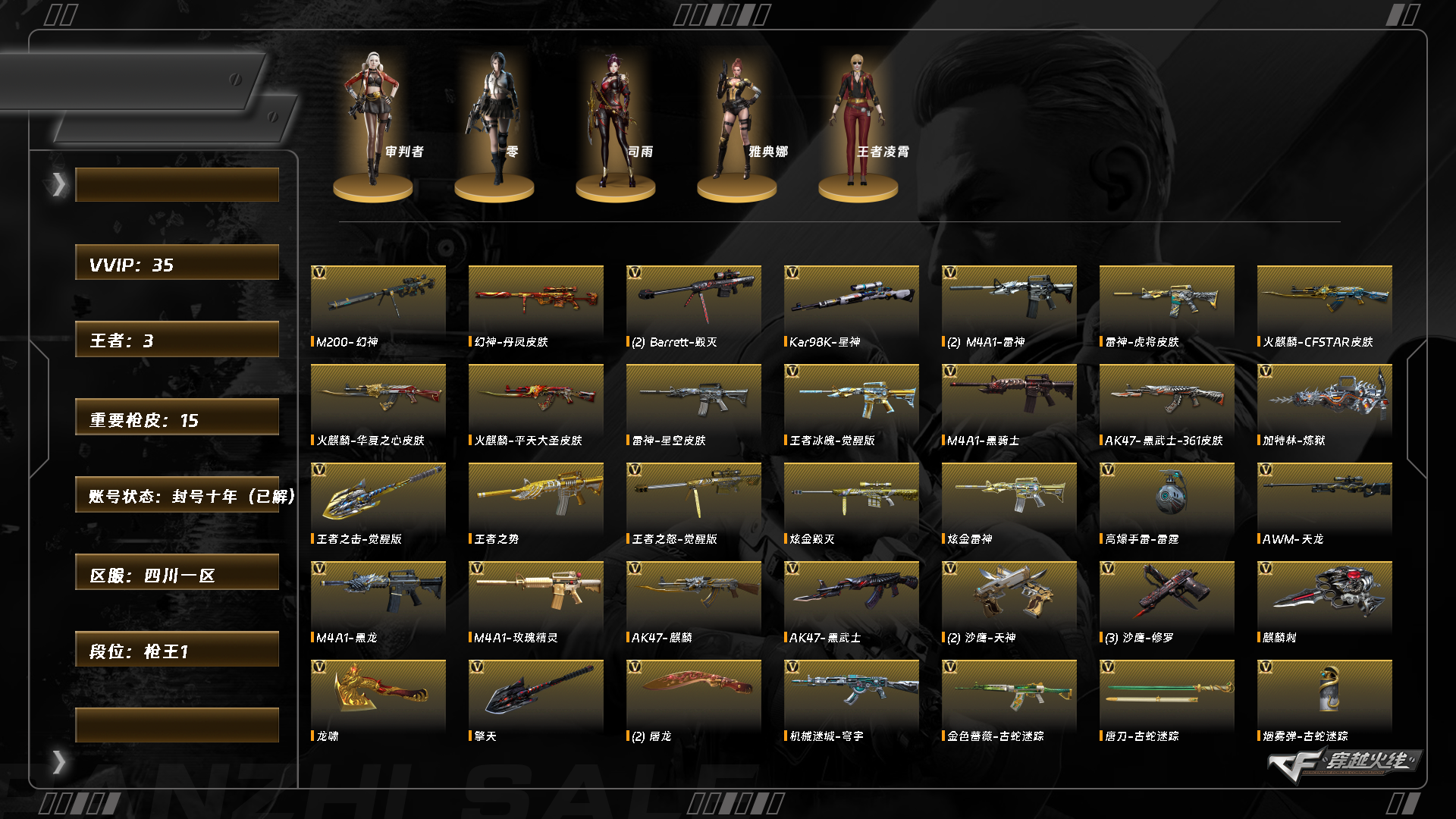 7602/西部/四川一区/可排位/34v/幻神/幻神丹凤/【星神三件套/星神/星神呛娘默/星神音效卡/】/【四防角色/司雨/】/【角色】/零/审判者/蛇隐宗/王者凌霄/【呛皮】/擎天傲竹金蛇/玫瑰精灵粉色浪漫/雷神星空/白虎暗星/王者武器/王者冰魄/王者之势/王者之怒/王者之击/炫金武器/炫金雷