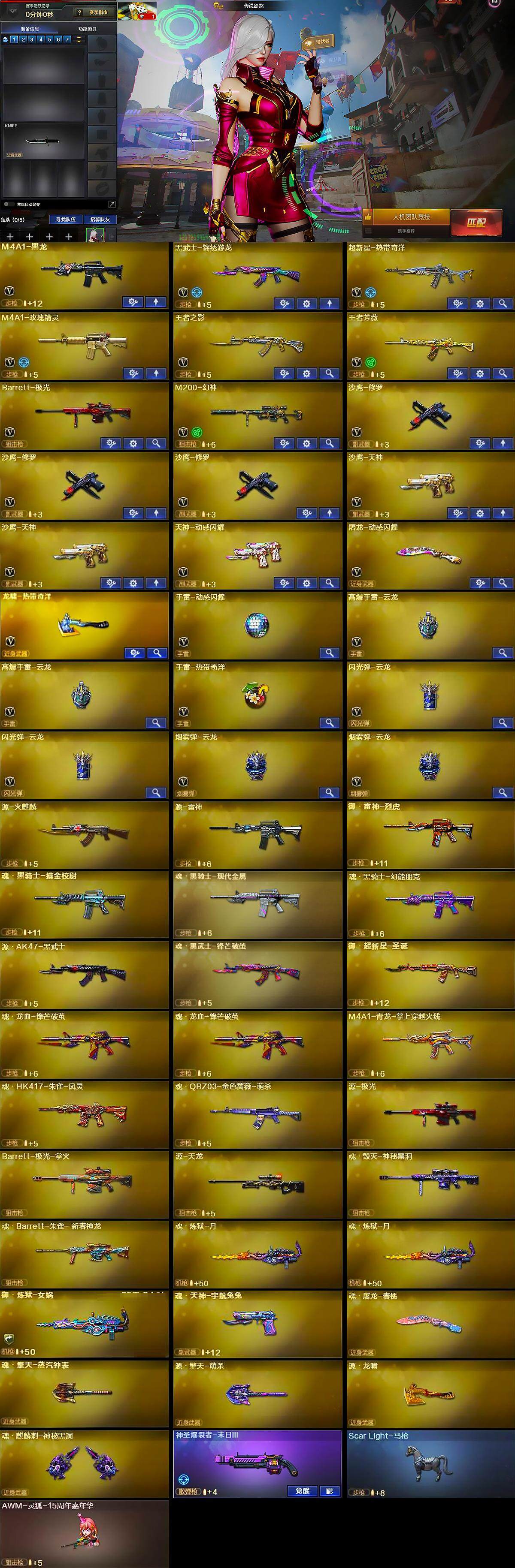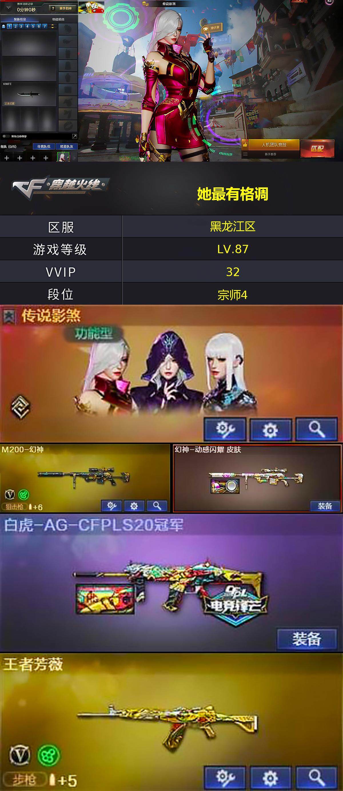 黑龙江区-25v-3王者-0炫金 【传说角色】:传说影煞 【热门武器】:m200-幻神,沙鹰-修罗3 【音效卡】:an94-超新星-热带奇洋音效卡 【皮肤】:幻神-动感闪耀 皮肤,白虎-ag-cfpls20冠军,屠龙-春桃 皮肤 【角色】:王者潘多拉,奇洋探员,乔伊教练,北极狐-x,电竞少女,嘉年华灵狐,0号玩家,潘多拉-甜心教官,潜龙队-x,新娜塔莎,樱-缤纷夏日,影武者-x,游珑儿 【人