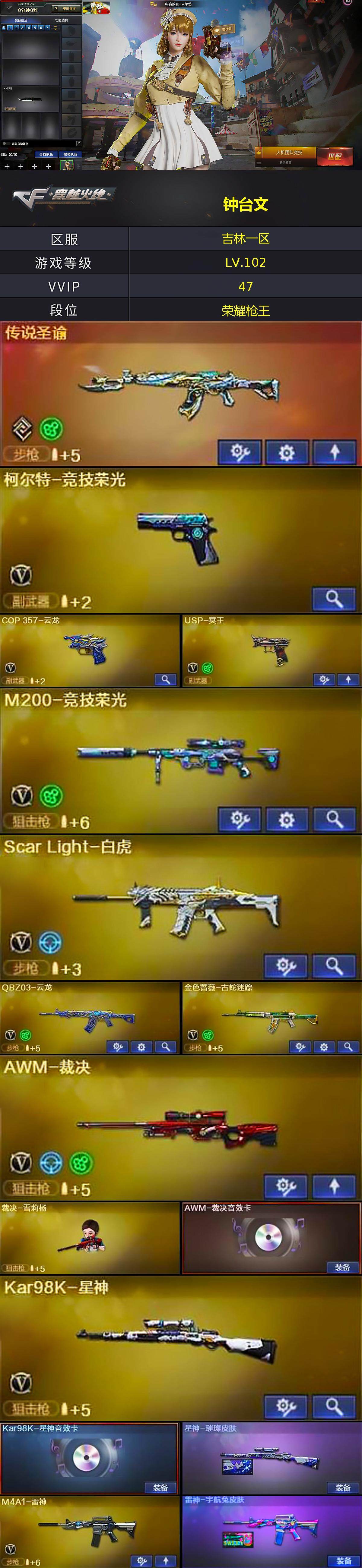 【1425】特12741北部吉林一区可排位可二次【吉林一区/46v/vip6/1传说】【纯白无封号/传说圣谕/星神三件套/裁决三件套/竞技荣光套/云龙套/7手呛拉满/usp冥王/cop/柯尔特/四防云悠悠】【m200-竞技荣光】【kar98k-星神/kar98k-星神音效卡/星神-璀璨皮肤】【awm-裁决/awm-裁决音效卡/裁决-胜者为王 皮肤】【q03-云龙】【柯尔特-竞技荣光】【scar light-白虎】【m4a1-雷神/雷神-宇航兔皮肤】【cop 357-云龙】【华】【火麒麟-cfstar2/火麒麟-雷神2】【m4a1-黑骑士】【m4a1-黑龙/黑龙-能量核心】【hk417-朱雀音效卡】【无影-神兵利器】【ak47-黑武士/黑武士-锦绣游龙】【天龙-cfstar】【awm-裁决/awm-裁决音效卡】【沙鹰-修罗/修罗-cfstar2】【沙鹰-天神3】【云龙扇】【擎天/擎天-竞技荣光】【屠龙】【电竞教官-云悠悠/木兰/乔伊教练/修道士/兔囡囡/斯沃特-x/铁骑荣耀/新娜塔莎/幻影/堕天使】【m4a1-雷霆王者】【新usp-呛王排位奖励4】【雷霆王者之锋/斩神刀/迷你深渊冰龙】【神圣爆裂者-末日iii/激光毁灭者iii-白马银呛/激光毁灭者iii】【牛牛-ak47/cat-刀锋】【高爆手蕾-竞技荣光3/闪光丹-竞技荣光4/盐雾蛋-竞技荣光3】【高爆手蕾-云龙2/闪光丹-云龙2/盐雾蛋-云龙】【高爆手蕾-雷霆王者】【烟雾保护头盔/闪光护目镜/超级背包/防弹头盔7/防弹衣8/c4工具钳6/手蕾包6/防化服4】截图展示段位不代表实际段位,如赛季更新等不/拒因素发生变化、时限道具不保证所剩时间。标题未写送点卷默认不送1274102284