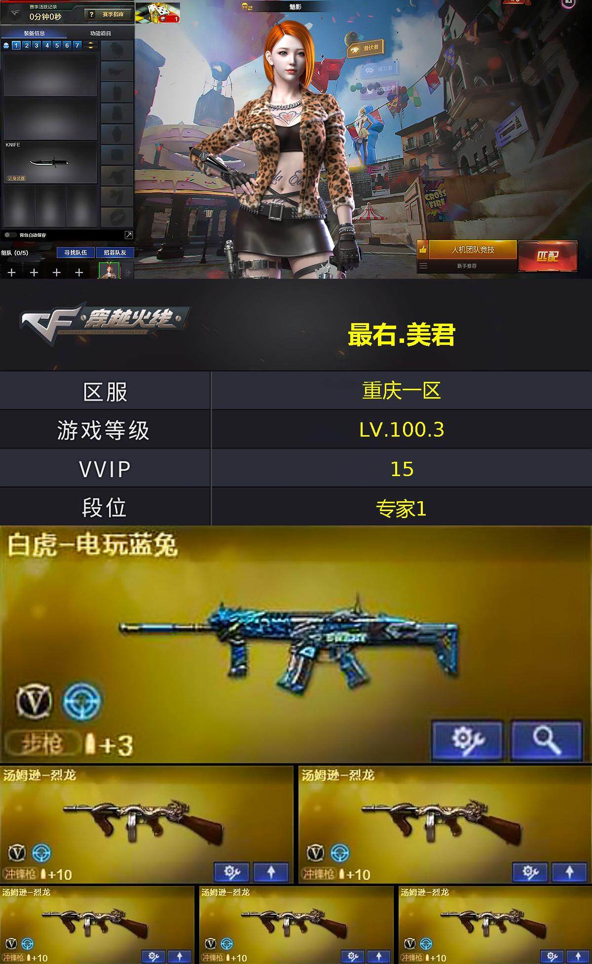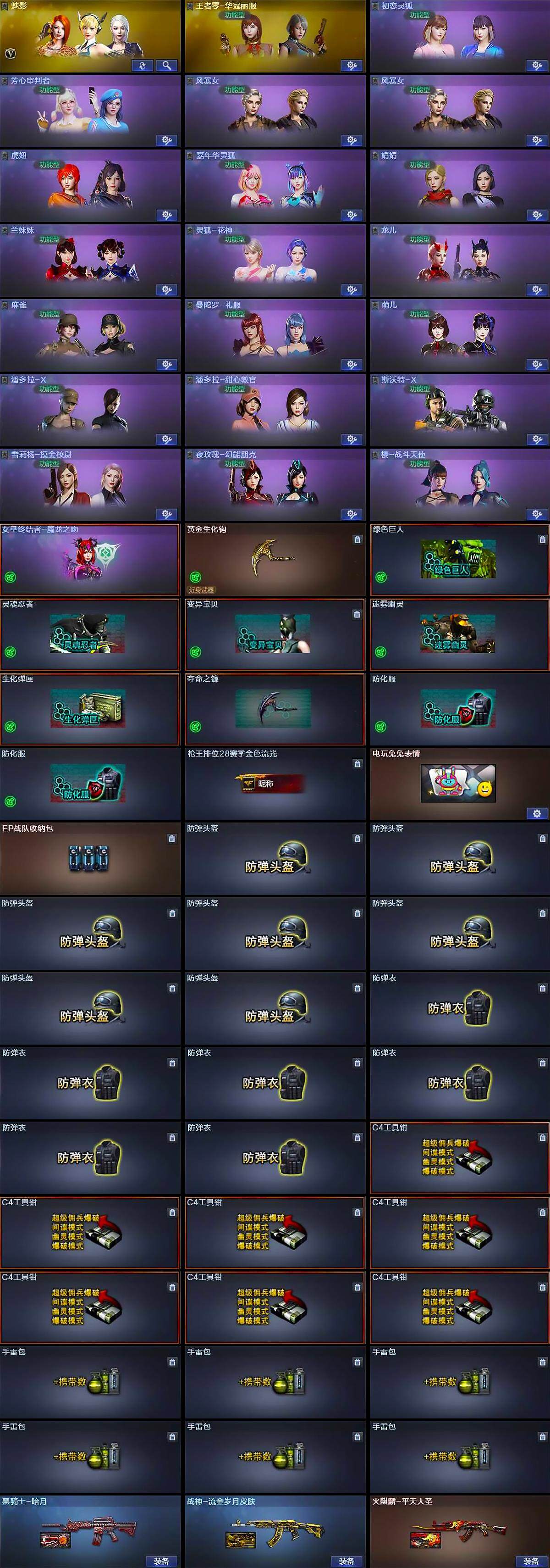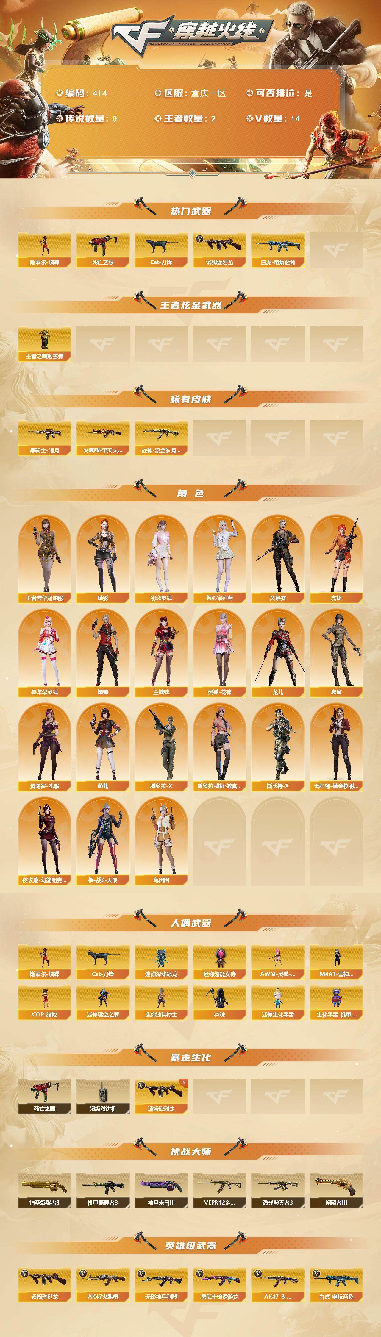 [14609050]重庆一区-14v-2王者-0炫金 【热门武器】:死亡之眼,白虎-电玩蓝兔,cat-刀锋,汤姆逊-烈龙5,斯泰尔-蝴蝶 【王者炫金武器】:王者之魄盐雾蛋 【皮肤】:火麒麟-平天大圣,黑骑士-暗月,战神-流金岁月皮肤 【角色】:魅影,王者零-华冠丽服,初恋灵狐,芳心审判者,风暴女2,虎妞,嘉年华灵狐,娟娟,兰妹妹,灵狐-花神,龙儿,麻雀,曼陀罗-礼服,萌儿,潘多拉-x,潘多拉-甜心教官,斯沃特-x,兔囡囡,雪莉杨-摸金校尉,夜玫瑰-幻能朋克,樱-战斗天使 【人偶武器】:m4a1-雷神-精英刀锋,斯泰尔-蝴蝶,awm-灵狐-15周年嘉年华,cop-旗袍,cat-刀锋,迷你深渊冰龙,迷你裂空之翼,迷你波特博士,夺魂,迷你生化手蕾,生化手蕾-机甲核心,迷你超能女侍 【暴走生化】:死亡之眼,超级对讲机 【挑战大师】:神圣爆裂者iii,vepr-12-金魔,激光毁灭者iii,机甲撕裂者iii,神圣爆裂者-末日iii2,阐释者iii3 【英雄级武器】:ak47-火麒麟,无影-神兵利器,黑武士-锦绣游龙,ak47-b-战神,白虎-电玩蓝兔,汤姆逊-烈龙5 【道具】:女皇终结者-魔龙之吻,黄金生化钩,绿色巨人,灵魂忍者,变异宝贝,迷雾幽灵,生化弹匣,夺命之镰,防化服2,呛王排位28赛季金色流光,电玩兔兔表情,ep战队收纳包,防弹头盔7,防弹衣6,c4工具钳7,手蕾包6 【特殊呛械】:蝴蝶斯泰尔5烈龙,5烈龙,1蝴蝶斯泰尔