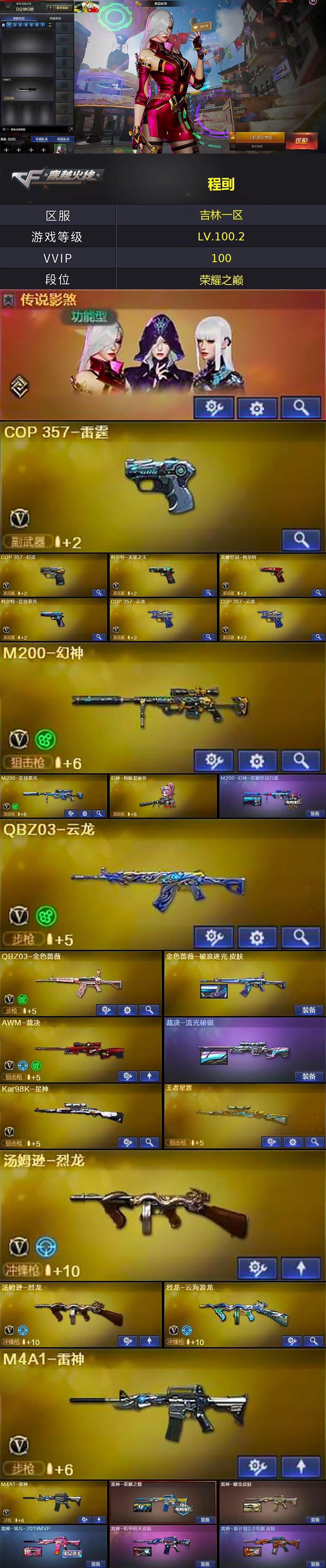 【1434】吉林一区-98v-15王者-1炫金 【传说角色】:传说影煞 【热门武器】:q03-金色蔷薇,hk417-朱雀,m4a1-青龙,m200-幻神,m200-竞技荣光,荣耀世冠-柯尔特,kar98k-星神,金色小号,cat-刀锋,毒蜂,牛牛-ak47,m4a1-黑骑士,汤姆逊-烈龙2,幻神-呛娘爱丽丝,雷神-小红,毁灭-孙三炮,cop-白鲨,cop 357-幻灵,沙鹰-修罗,荣耀世冠-龙啸,黄金猫猫手套-白鲨 【王者炫金武器】:m4a1-王者堕天神,王者星霆,炫金修罗 【音效卡】贝16349可排位-可二次平台合作商家【纯白无封号】【113v/vip6/1传说】【四防传说影煞】【竞技荣光套/云龙套/白狐套】【m200-幻神/m200-幻神-荣耀世冠白鲨】【m200-竞技荣光】【kar98k-星神】【awm-裁决/裁决-流光秘银】【王者星霆】【黄金猫猫手套-白鲨】【柯尔特-无冕之王/荣耀世冠-柯尔特/柯尔特-竞技荣光/cop 357-幻灵/cop 357-云龙2/cop 357-雷霆】【q03-金色蔷薇/金色蔷薇-破浪逐光皮】【q03-云龙】【m4a1-雷神2/雷神-荣耀之魄/雷神-宠儿/雷神-机甲刑天皮肤/雷神-耀金皮肤】【barrett-毁灭2/毁灭-冠军之怒/毁灭-heartshot皮】【m4a1-青龙/hk417-朱雀/m4a1-猎神/m4a1-死神/m4a1-黑龙】【王者堕天神/王者风势/王者之势/王者之武】【ak47-火麒麟/火麒麟-巅峰荣耀/火麒麟-百城/火麒麟-cfstar2/火麒麟-平天大圣2】【m4a1-黑骑士/黑骑士音效卡/黑骑士-摸金校尉】【ak47-无影/无影-神兵利器】【黑武士-锦绣游龙】【天龙-cfstar】【barrett-极光/极光-能量核心】【汤姆逊-烈龙2/烈龙-云海游龙】【沙鹰-修罗/修罗-cfstar2/修罗-冠军之魂2/修罗-能量核心】【沙鹰-天神2】【云龙扇】【麒麟刺】【擎天/擎天-云海游龙/擎天-竞技荣光】【屠龙/屠龙-荣耀之锋/屠龙-破浪逐光 皮肤】【荣耀世冠-龙啸】【职业选手/王者凌霄/王者-瞳-闭月羞花/龙儿/暗夜-x/雨墨/木兰/奇洋探员/云海玲珑/乔伊教练/兔囡囡/兰-新年限定/萌儿/麻雀/紫霞/青霞仙子/灵狐者-黄金海岸/妲己/雪莉杨/蜀雪/娟娟/潘多拉-x/斯沃特-x/救世主-x/影武者-x/幻影/堕天使/复仇者】【ak47-黑鲨/ak12-天启2】【an94-超新星】【colt1911-小故障/colt 1911-大黄蜂/柯尔特-萌杀/cop 357-青龙/新usp-呛王排位奖励】【雷霆王者之锋/斩神刀/迷你深渊冰龙/唐刀-神工天巧】【神圣爆裂者-末日iii2/激光毁灭者iii-白马银呛2/冰龙粉碎者-白马银呛】【斯泰尔-巧克力2/轻型军用手斧-镜】【牛牛-ak47/猫猫手套/雷神-小红/cat-刀锋/m4a1-雷神-精英刀锋/cop-白鲨/毁灭-孙三炮/天龙-曼陀罗/夺魂/街机小灰机/金色小号】【高爆手蕾-竞技荣光/闪光丹-竞技荣光/盐雾蛋-竞技荣光】【高爆手蕾-云龙6/闪光丹-云龙6/盐雾蛋-云龙4/手蕾-云海游龙】【高爆手蕾-雷霆王者2/闪光丹-雷霆王者/盐雾蛋-雷霆王者】【高爆手蕾-神工天巧/闪光丹-神工天巧/盐雾蛋-神工天巧】【高爆手蕾-幻灵6/闪光丹-幻灵7/盐雾蛋-幻灵6】【炫金修罗】【绝迹语音包/语音特效-云海游龙】【超级护目镜/透明头盔/透明护目镜/烟雾保护头盔/闪光护目镜2/超级对讲机/超级背包/防弹头盔6/防弹衣8/c4工具钳6/手蕾包5/防化服4】【截图展示段位不代表实际段位,如赛季更新等不/拒因素发生变化、时限道具不保证所剩时间。标题未写送点券默认不送】:m4a1-黑骑士音效卡,绝迹语音包,barrett-碧霄极光音效卡 【皮肤】:m200-幻神-荣耀世冠白鲨,金色蔷薇-破浪逐光 皮肤,裁决-流光秘银,雷神-荣耀之魄,雷神-耀金皮肤,雷神-宠儿-2019mvp,雷神-机甲刑天皮肤,雷神-源计划2.0专属 皮肤,火麒麟-平天大圣2,火麒麟-百城,火麒麟-巅峰荣耀,毁灭-冠军之怒,黑骑士-暗月,极光-能量核心,修罗-能量核心,修罗-冠军之魂2,屠龙-荣耀之锋,屠龙-破浪逐光 皮肤 【角色】:樱,雨墨,华,王者-瞳-闭月羞花,王者凌霄,蛇隐宗,奇洋探员,乔伊教练,云海玲珑,暗夜-x,北极狐-x,初恋灵狐,芳心审判者,飞虎队-x,风暴女2,虎妞,嘉年华灵狐,娟娟,兰-空鹰,兰-新年限定,兰妹妹,猎狐者-追月,0号玩家,灵狐者-x,灵狐者-黄金海岸,灵狐者-七夕宝贝,龙儿,麻雀,曼陀罗-x,曼陀罗-礼服,萌儿,潘多拉-x,潘多拉-甜心教官,潜龙队-x,邱刚敖,青霞仙子,蛇姬,斯沃特-x,甜心偶像,蜀雪,兔囡囡,雪莉杨,雪莉杨-摸金校尉,樱-战斗天使,影武者-x,职业选手 【人偶武器】:幻神-呛娘爱丽丝,雷神-小红,cop-白鲨,毁灭-孙三炮,天龙-曼陀罗,m4a1-雷神-精英刀锋,scar light-马呛,街机小灰机,awm-灵狐-15周年嘉年华2,cat-刀锋,牛牛-ak47,迷你深渊冰龙,迷你牛魔王,迷你波特博士,夺魂,生化手蕾-机甲核心3,灵狐娃娃手蕾 【暴走生化】:毒蜂,超级对讲机 【挑战大师】:冰龙粉碎者-白马银呛,激光毁灭者iii-白马银呛2,神圣爆裂者-末日iii2 【英雄级武器】:ak47-火麒麟,m4a1-黑龙,m4a1-雷神2,m4a1-黑骑士,ak47-无影,m4a1-死神,ak12-天启2,an94-超新星,ak47-黑鲨,m4a1-青龙,hk417-朱雀,无影-神兵利器,q03-云龙,黑武士-锦绣游龙,q03-金色蔷薇,m4a1-猎神,王者之武-觉醒版,王者之势-觉醒版,黑骑士-海王2,王者风势-觉醒版,barrett-毁灭2,barrett-极光,awm-裁决,m200-幻神,kar98k-星神,m200-竞技荣光,barrett-金色蔷薇,汤姆逊-烈龙2,烈龙-云海游龙,沙鹰-修罗,沙鹰-天神2,cop-雷霆,cop 357-幻灵,柯尔特-无冕之王,荣耀世冠-柯尔特,柯尔特-竞技荣光,cop 357-云龙2,屠龙,擎天,麒麟刺,幻灵之锋,擎天-竞技荣光,唐刀-神工天巧,擎天-云海游龙,荣耀世冠-龙啸,雷霆王者之锋-觉醒版,高爆手蕾-幻灵6,高爆手蕾-竞技荣光,高爆手蕾-神工天巧,高爆手蕾-云龙6,手蕾-云海游龙,高爆手蕾-古蛇迷踪,闪光丹-幻灵7,