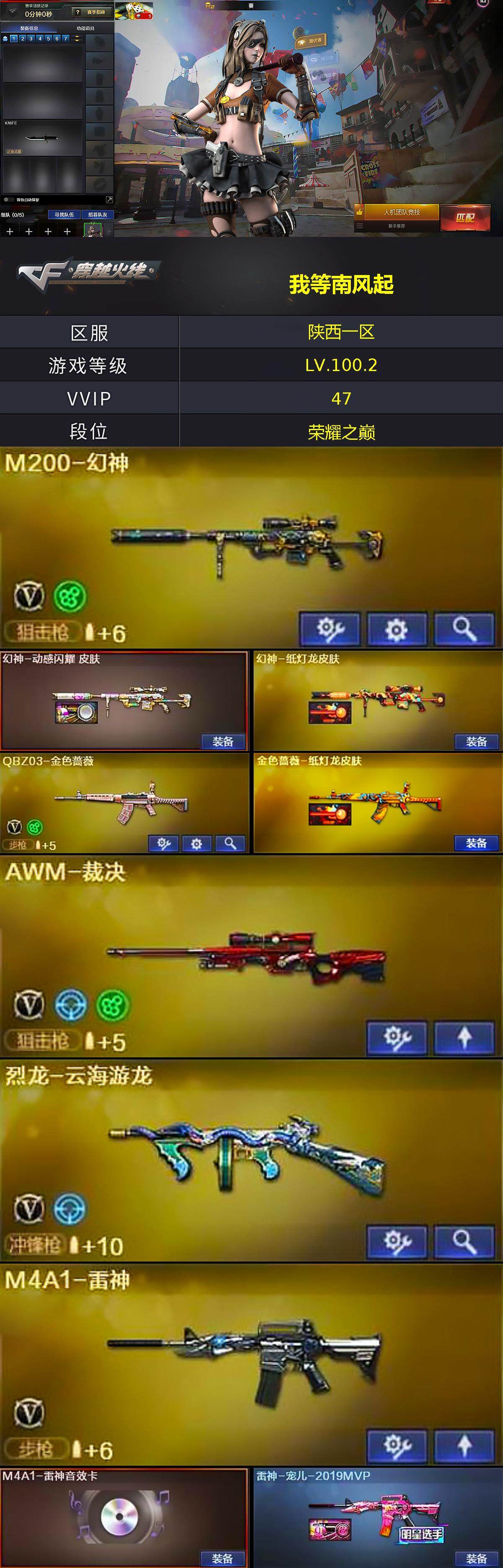 陕西一区-47v-6王者-0炫金 【热门武器】:q03-金色蔷薇,hk417-朱雀,m200-幻神,金色小号,m4a1-黑骑士,沙鹰-修罗 【音效卡】:m4a1-雷神音效卡,m4a1-黑骑士音效卡,barrett-毁灭音效卡 【皮肤】:幻神-动感闪耀 皮肤,幻神-纸灯龙皮肤,金色蔷薇-纸灯龙皮肤,雷神-宠儿-2019mvp,火麒麟-平天大圣,火麒麟-百城,毁灭-暗月,毁灭-英雄计划 皮肤,