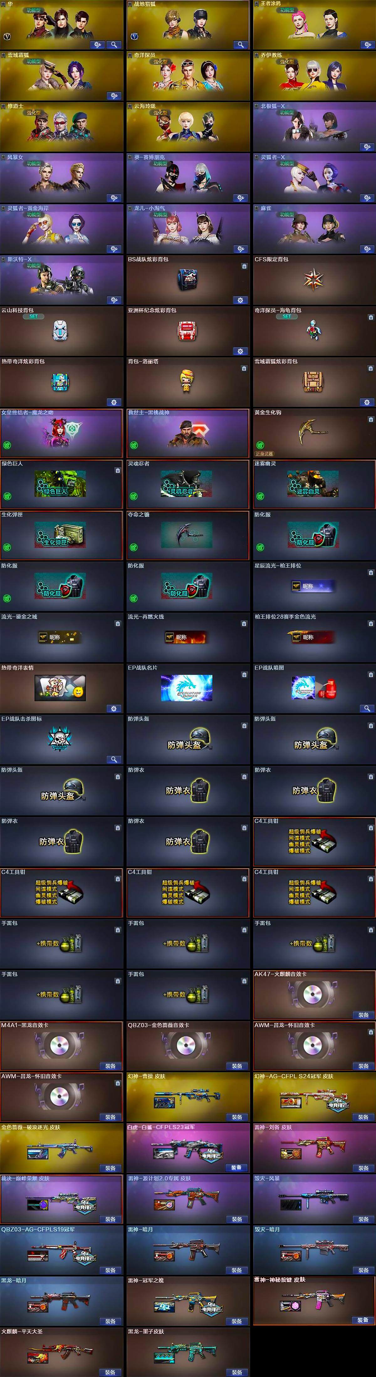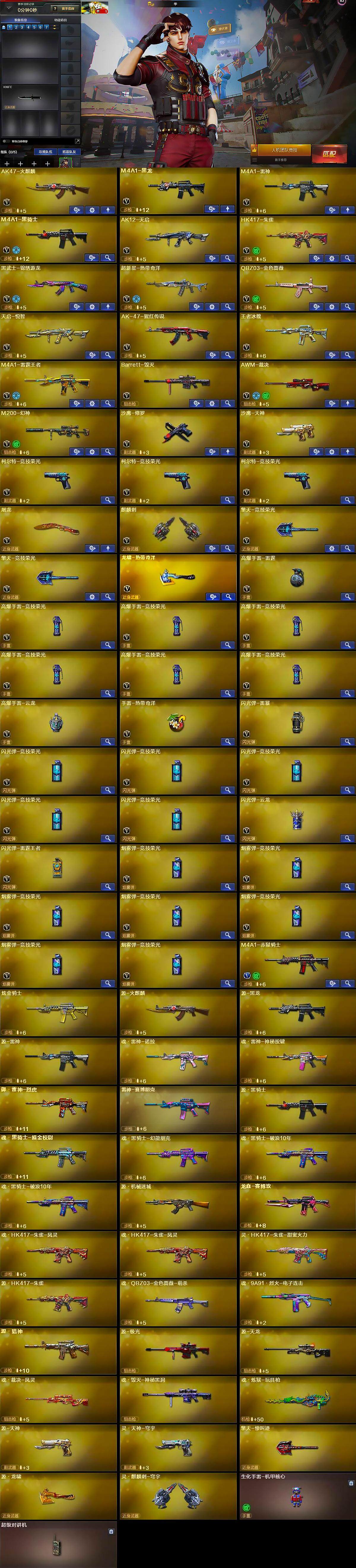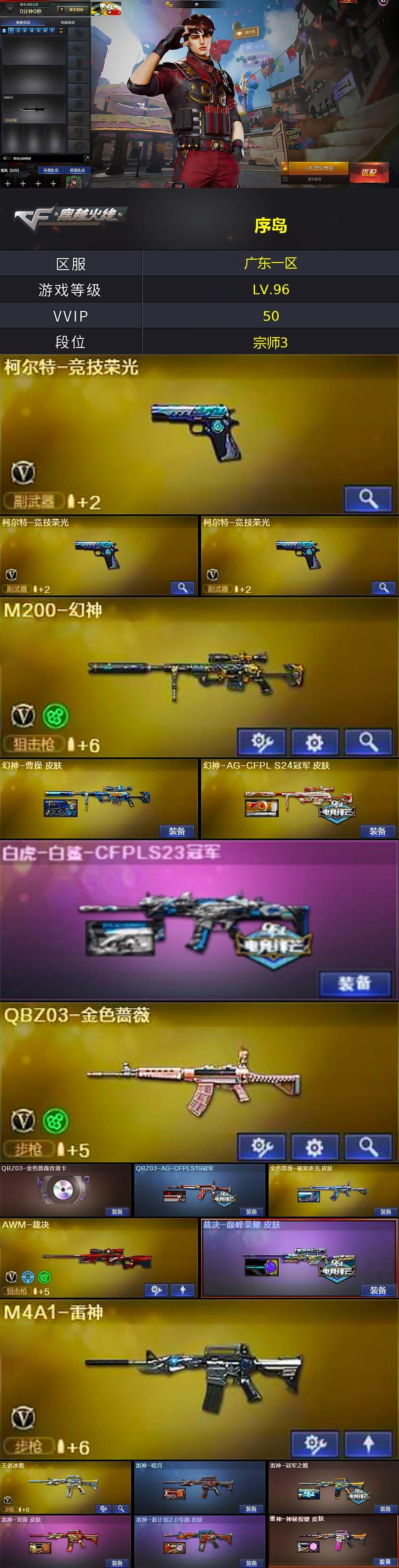 广东一区-46v-6王者-1炫金 【热门武器】:q03-金色蔷薇,hk417-朱雀,m200-幻神,m4a1-黑骑士,沙鹰-修罗,黄金猫猫手套-白鲨 【王者炫金武器】:炫金骑士 【音效卡】:ak47-火麒麟音效卡,m4a1-黑龙音效卡,awm-昌龙-怀旧音效卡2 【皮肤】:幻神-曹操 皮肤,幻神-ag-cfpl s24冠军 皮肤,白虎-白鲨-cfpls23冠军,q03-ag-cfpl