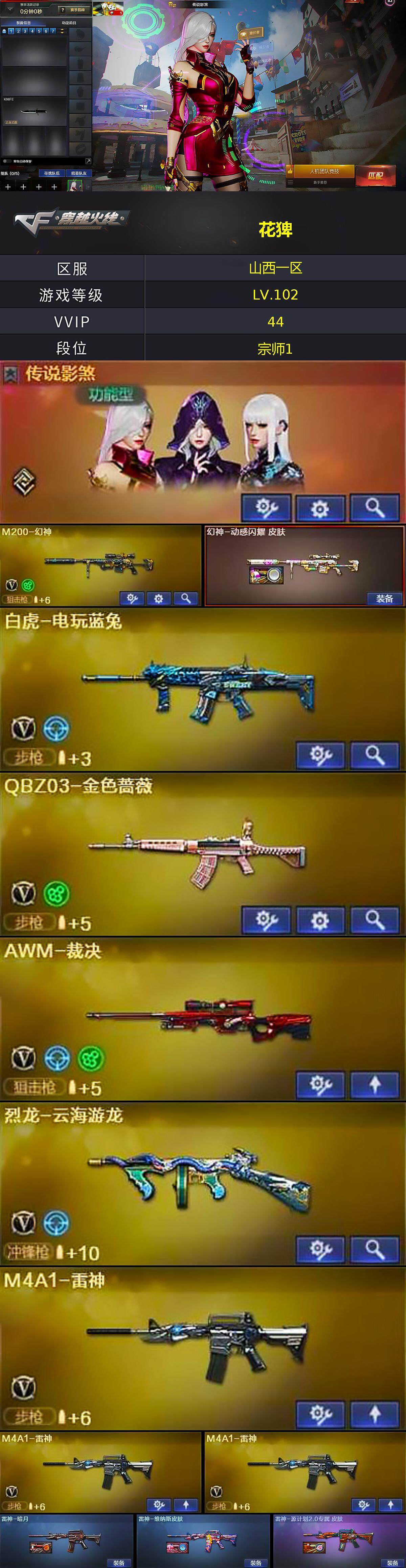 山西一区-40v-5王者-0炫金 【传说角色】:传说影煞 【热门武器】:q03-金色蔷薇,m200-幻神,白虎-电玩蓝兔,毒蜂,m4a1-黑骑士,沙鹰-修罗 【王者炫金武器】:雷霆王者之锋 【音效卡】:天神-动感闪耀 音效卡,屠龙-云海游龙音效卡,m4a1-黑骑士音效卡 【皮肤】:幻神-动感闪耀 皮肤,雷神-暗月,雷神-维纳斯皮肤,雷神-源计划2.0专属 皮肤,火麒麟-平天大圣,火麒麟-心