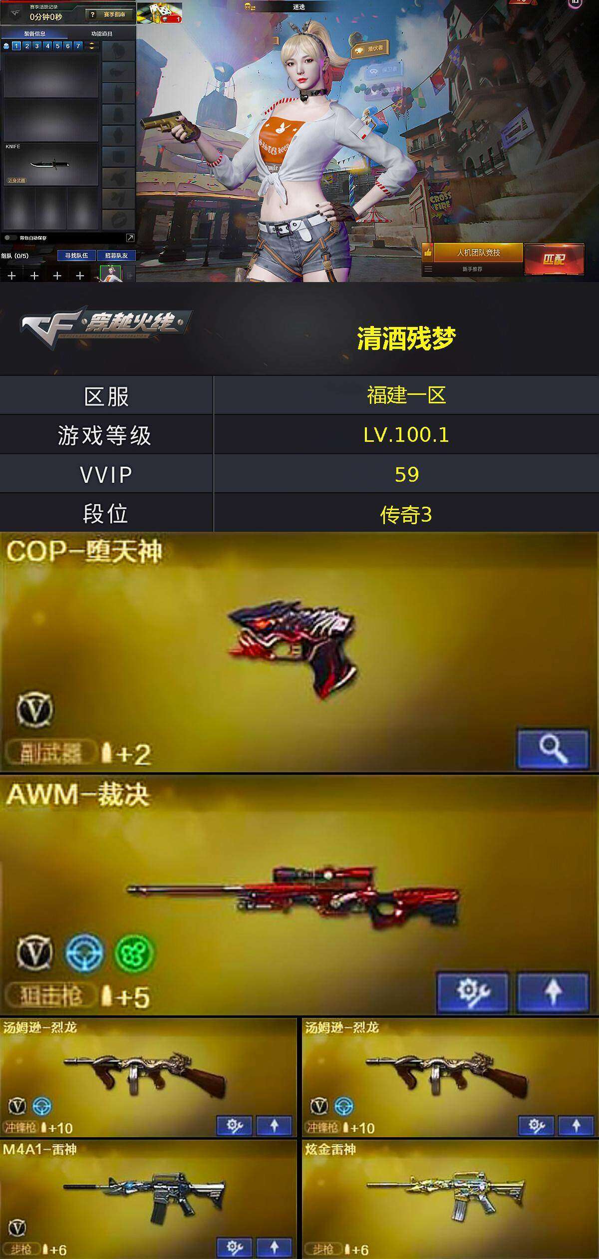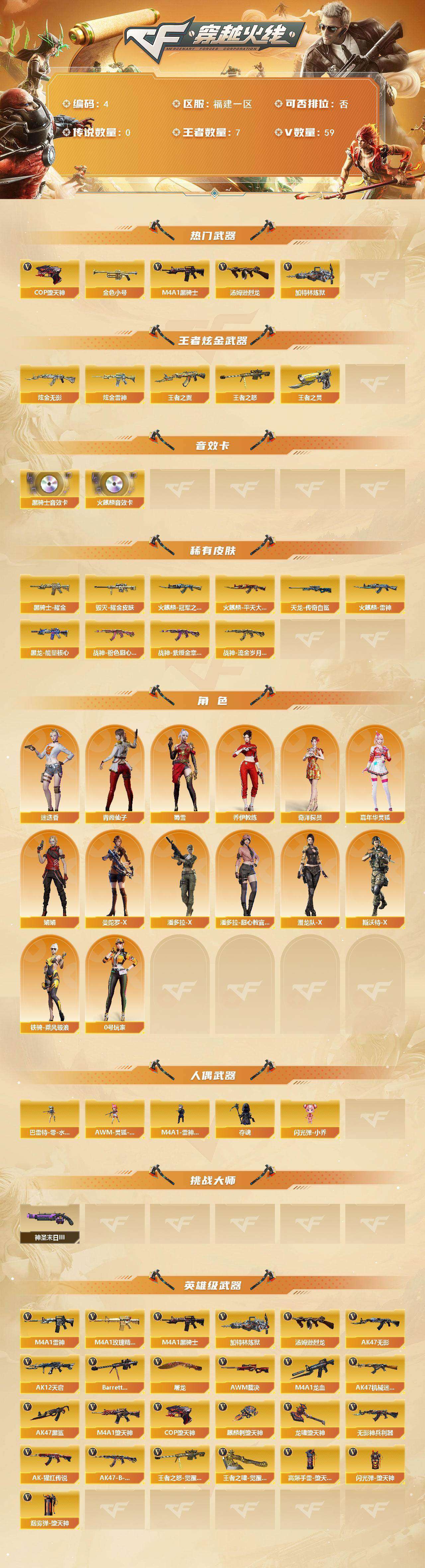 【等级】100【区服】福建一区【vip】1【段位】传奇3【英雄角色】1【英雄武器】58【王者级武器】王者之翼 王者之怒 王者之怒-觉醒版 王者之灵 王者之灵 王者之啸-觉醒版 【炫金级武器】炫金无影 炫金无影 炫金雷神 【英雄级角色】迷迭香 【英雄级武器】无影-神兵利器 ak12-天启 m4a1-玫瑰精灵 ak47-机械迷城 屠龙 ak47-无影 ak-47-猩红传说 ak-4