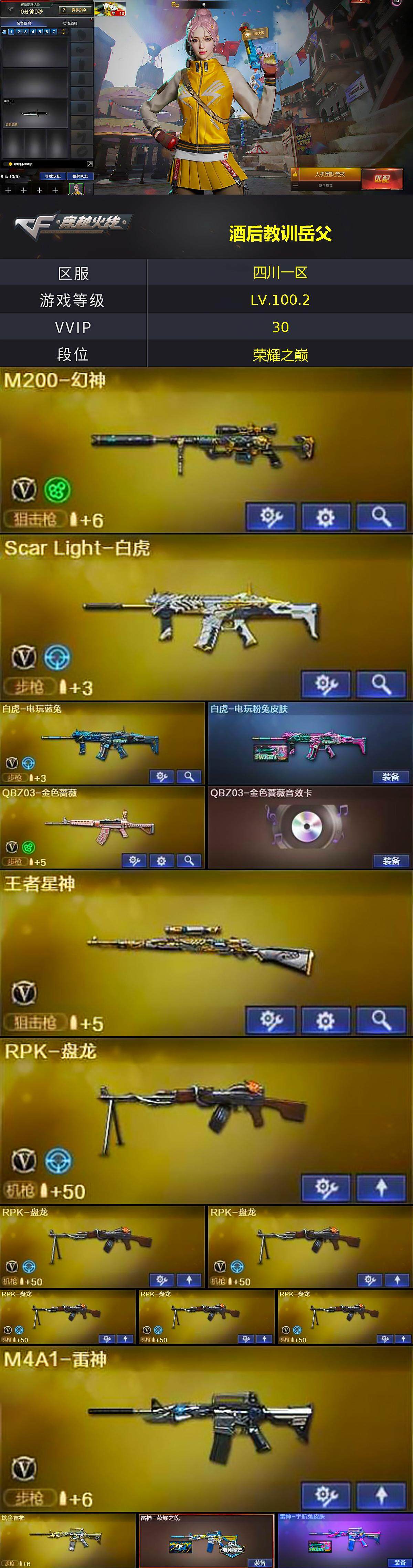四川一区-30v-1王者-1炫金 【热门武器】:q03-金色蔷薇,scar light-白虎,m200-幻神,白虎-电玩蓝兔,m4a1-黑骑士,rpk-盘龙6,加特林-炼狱 【王者炫金武器】:炫金雷神 【音效卡】:m4a1-黑骑士音效卡 【皮肤】:白虎-电玩粉兔皮肤,雷神-荣耀之魄,雷神-宇航兔皮肤,火麒麟-平天大圣,火麒麟-心动糖果,毁灭-荣耀之怒,m4a1-千变-孔明皮肤2,黑骑士