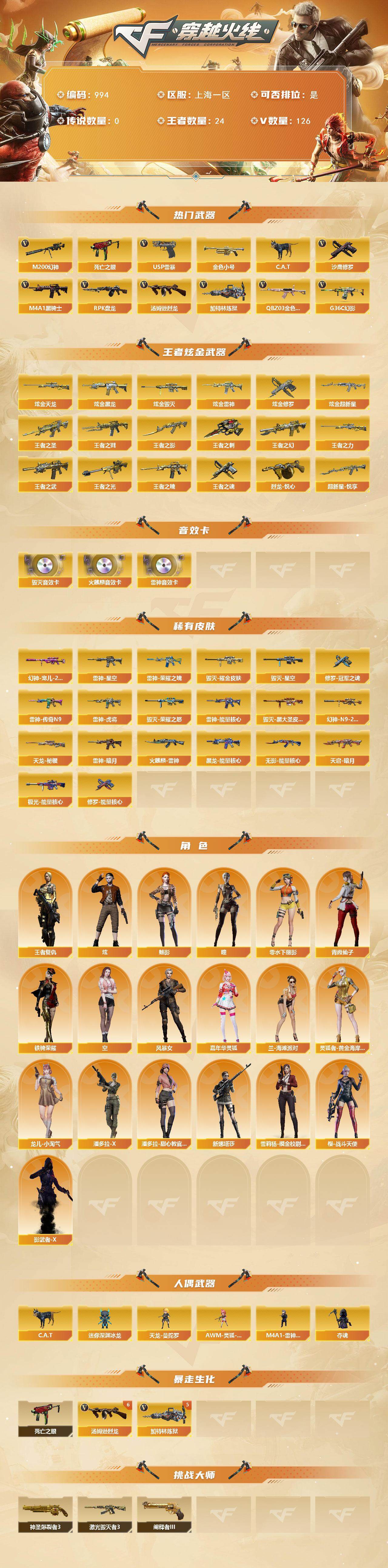 [14659502]123v/102级/荣耀元首/24王者/8炫金/3英雄/g36c-幻影/q03-金色蔷薇/m200-幻神/死亡之眼/金色小号/c.a.t/m4a1-黑骑士/汤姆逊-烈龙/rpk-盘龙/加特林-炼狱/usp雷暴/沙鹰-修罗/王者之圣/王者之戮/超新星-悦享/王者之幻/王者之武/王者之影/王者之魄/王者之光/王者之力/烈龙-悦心/王者之魂/王者之刺/炫金黑龙/炫金雷神/炫金超新星/炫金毁灭/炫金天龙/炫金修罗/ak47-火麒麟音效卡/m4a1-雷神音效卡/barrett-毁灭音效卡/幻神-宠儿/m200-幻神-n9-2022mvp/雷神-暗月/雷神-能量核心/雷神荣耀之魄/雷神-星空/雷神-虎将/雷神-传奇n9/火麒麟-雷神/毁灭-荣耀之怒/毁灭耀金皮肤/毁灭-星空/毁灭-黑大圣皮肤/黑龙-能量核心/无影-能量核心/天启-暗月/天龙-秘银/极光-能量核心/修罗-能量核心/修罗-冠军之魂/瞳/魅影/炫/王者复仇/空/风暴女/嘉年华灵狐/兰-海滩派对/零-水下丽影/灵狐者-黄金海岸/龙儿-小淘气/潘多拉-x/潘多拉-甜心教官/青霞仙子/铁骑荣耀/新娜塔莎/雪莉杨-摸金校尉/樱-战斗天使/影武者-x/天龙-曼陀罗/m4a1-雷神-精英刀锋/awm-灵狐-15周年嘉年华/迷你深渊冰龙/夺魂/6烈龙/5炼狱/神圣爆裂者/激光毁灭者/阐释者/m4a1-千变/ak47-火麒麟/m4a1-黑龙/m4a1-雷神/ak47-黑武士/ak12-天启/an94-超新星/m4a1-武圣/ak47-机械迷城/ak47-黑鲨/m4a1-雷霆/m4a1-玫瑰精灵/m4a1-猎神/王者之心-觉醒版/王者之魄-觉醒版/ak-47-猩红传说/awm-天龙/barrett-毁灭/barrett-极光/awm-裁决/barrett-金色蔷薇/王者之怒-觉醒版/aa-12-雷霆/沙鹰-天神/cop-雷霆/屠龙/龙啸/擎天/麒麟刺/斩神刀-雷暴/王者之锋-觉醒版/王者之啸-觉醒版/王者之击-觉醒版/高爆手蕾-雷霆/高爆手蕾-雷暴/闪光丹-雷霆/闪光丹-雷暴/盐雾蛋-雷霆/盐雾蛋-雷暴/战舰背包/炫彩背包/超级背包/变异宝贝/夺命之镰/防化服/金色流光-呛王排位/星辰流光-呛王排位/呛王排位28赛季金色流光/c4-沙漠/防弹头盔/防弹衣/c4工具钳/手蕾包