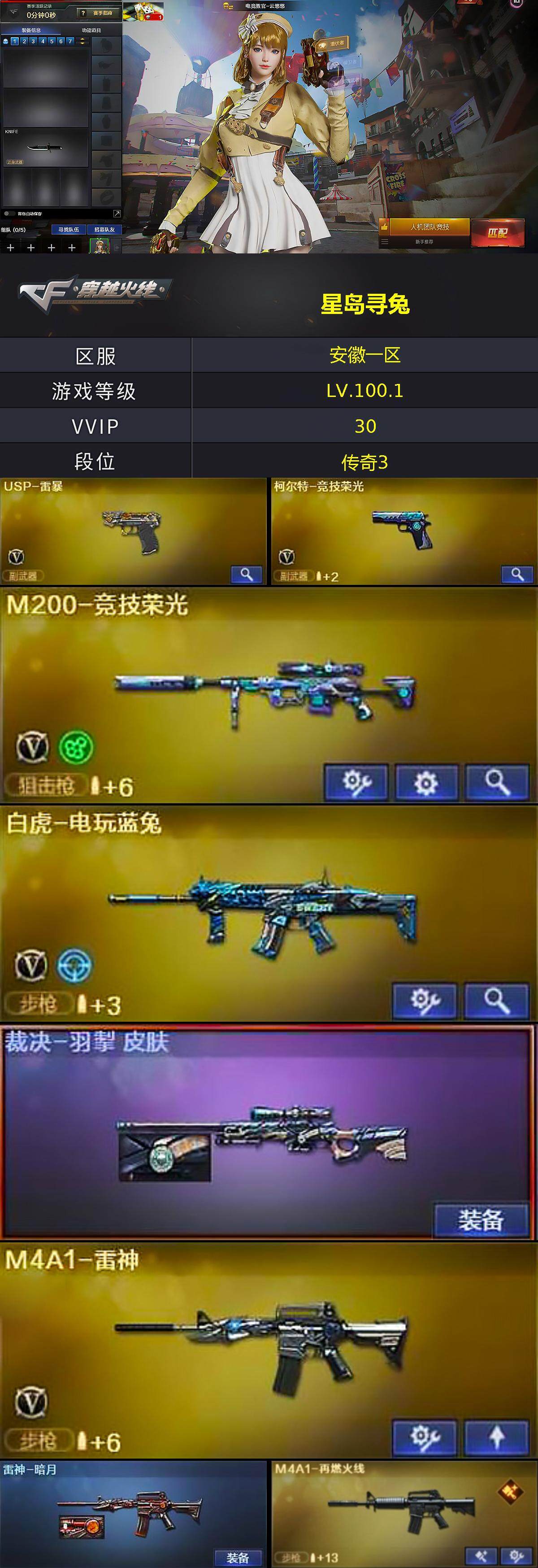 安徽一区-30v-0王者-0炫金 【热门武器】:m200-竞技荣光,白虎-电玩蓝兔,usp-雷暴 【音效卡】:barrett-碧霄极光音效卡,炼狱-百战金芒-庆典舞曲音效卡 【皮肤】:裁决-羽掣 皮肤,雷神-暗月,m4a1-再燃火线,火麒麟-雷神,火麒麟-轻羽皮肤,毁灭-风暴,战神-粉色甜心皮肤,战神-流金岁月皮肤,轻型军用手斧-再燃火线 【角色】:电竞教官-云悠悠,战地猎狐,乔伊教练,修道士,初恋灵狐,娟娟,曼陀罗-x,斯沃特-x,幽 【人偶武器】:天龙-曼陀罗,火麒麟-灵狐,m4a1-雷神-精英刀锋,awm-灵狐-15周年嘉年华,迷你牛牛,生化手蕾-机甲核心2,迷你超能女侍 【挑战大师】:激光毁灭者iii-白马银呛,kac-圣炎切割者iii 【英雄级武器】:ak47-火麒麟,m4a1-雷神,ak47-b-战神,白虎-电玩蓝兔,m200-竞技荣光,usp-雷暴,柯尔特-竞技荣光,屠龙,龙啸,擎天-竞技荣光,麒麟刺-百战金芒,高爆手蕾-竞技荣光2,闪光丹-竞技荣光4,盐雾蛋-竞技荣光3,m4a1-赤狱骑士,m4a1-苍鸣雷神,barrett-碧霄极光 【道具】:bs战队炫彩背包,cfs限定背包,云山科技背包,亚洲杯纪念炫彩背包,女皇终结者-背包,百战金芒炫彩背包,女皇终结者-魔龙之吻,救世主-黑桃战神,绿色巨人,灵魂忍者,迷雾幽灵,夺命之镰,防化服3,星辰流光-呛王排位,呛王排位29赛季金色流光,语音特效-盛典烟火,萌萌小葵表情,电玩兔兔表情,c4-再燃火线,防弹头盔4,防弹衣4,c4工具钳4,手蕾包4 【特殊呛械】:
