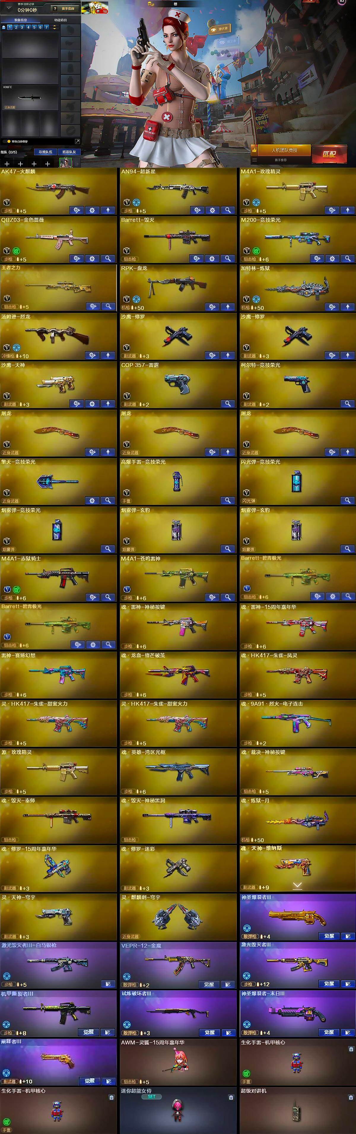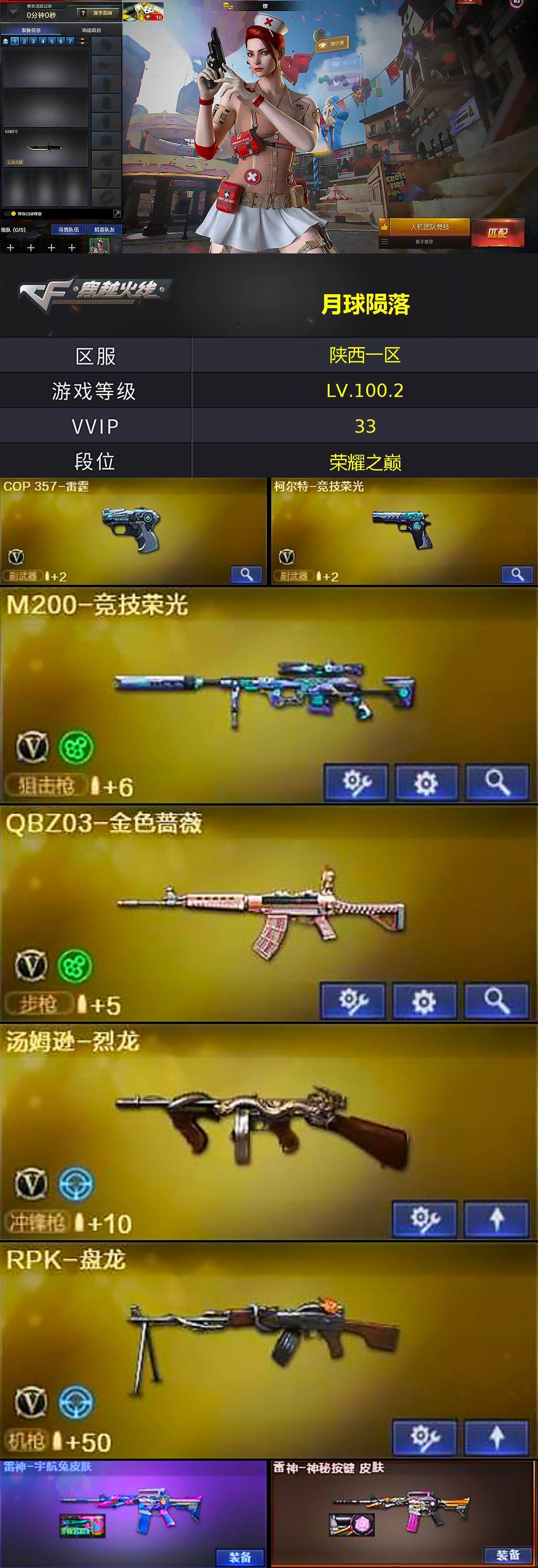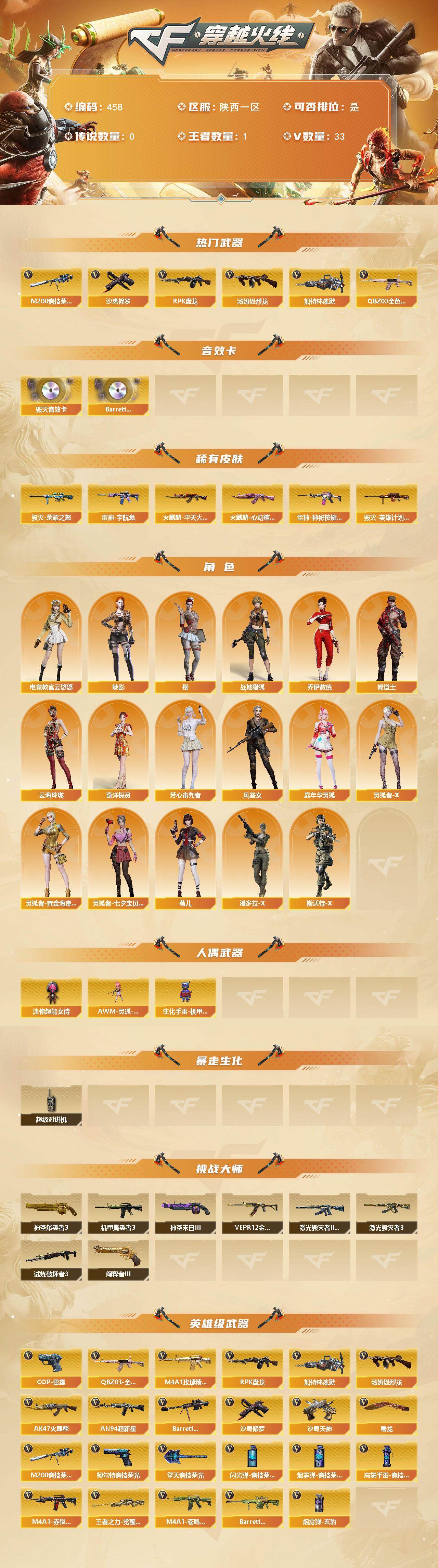 陕西一区-33v-1王者-0炫金 【热门武器】:q03-金色蔷薇,m200-竞技荣光,汤姆逊-烈龙,rpk-盘龙,加特林-炼狱,沙鹰-修罗2 【音效卡】:barrett-毁灭音效卡,barrett-碧霄极光音效卡 【皮肤】:雷神-宇航兔皮肤,雷神-神秘按键 皮肤,火麒麟-平天大圣,火麒麟-心动糖果,毁灭-荣耀之怒,毁灭-英雄计划 皮肤 【角色】:樱,魅影,电竞教官-云悠悠,战地猎狐,奇洋