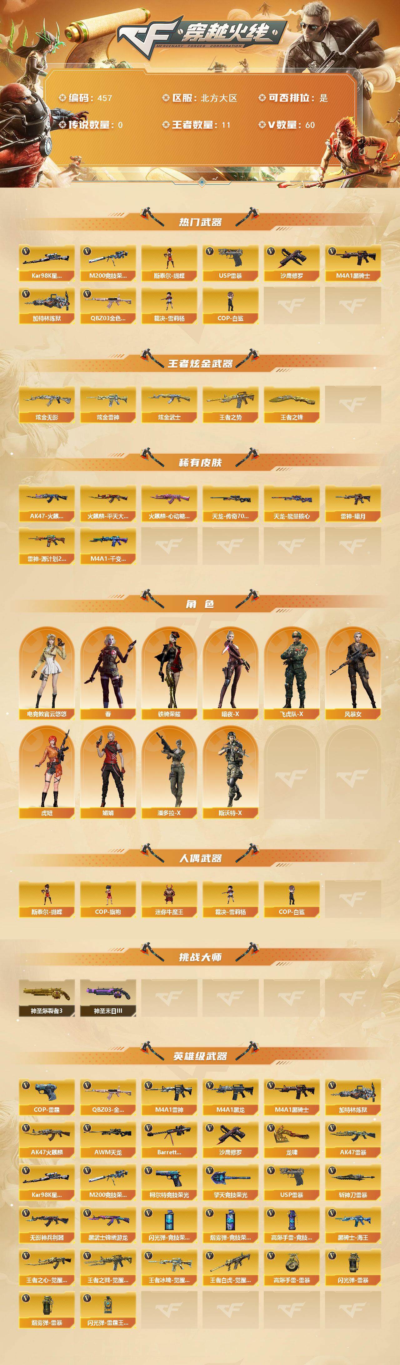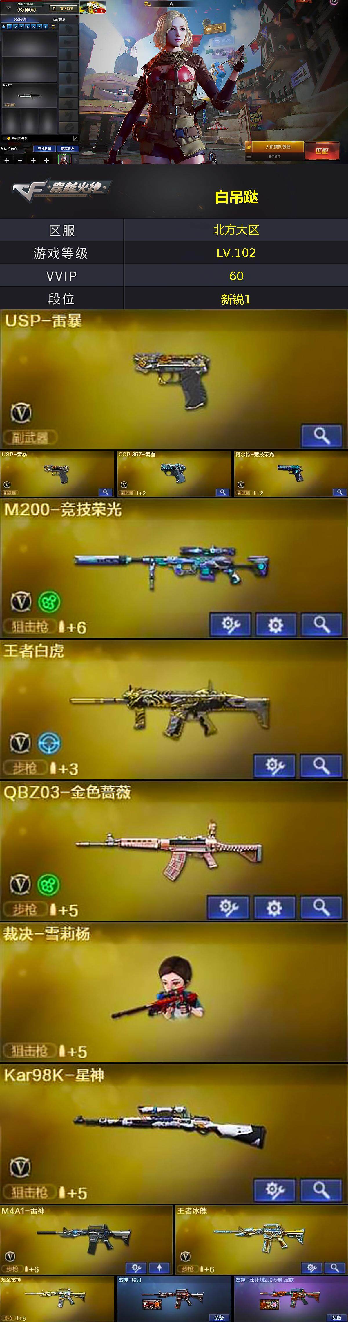 北方大区-60v-11王者-3炫金 【热门武器】:q03-金色蔷薇,m200-竞技荣光,kar98k-星神,m4a1-黑骑士,加特林-炼狱,斯泰尔-蝴蝶,裁决-雪莉杨,cop-白鲨2,usp-雷暴2,沙鹰-修罗4 【王者炫金武器】:王者之势,王者之锋,炫金无影,炫金雷神,炫金武士 【皮肤】:雷神-暗月,雷神-源计划2.0专属 皮肤,ak47-火麒麟-传奇even,火麒麟-平天大圣,火