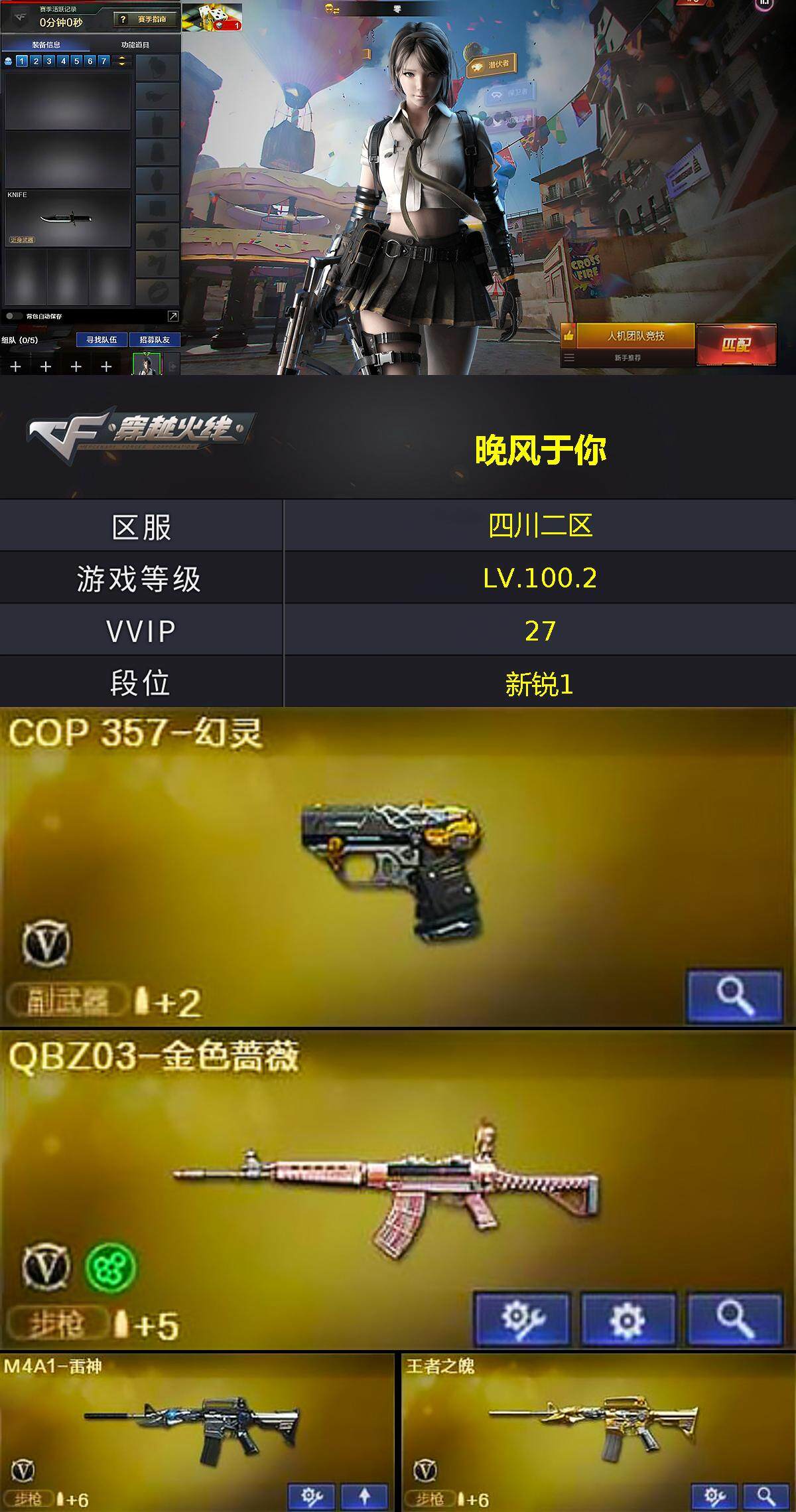 四川二区-21v-5王者-0炫金 【热门武器】:q03-金色蔷薇,hk417-朱雀,m4a1-黑骑士,cop 357-幻灵,沙鹰-修罗 【王者炫金武器】:王者之戮,炼狱-悦蓝 【皮肤】:黑骑士-暗月 【角色】:零,审判者,王者-瞳-闭月羞花,暗夜-x,初恋灵狐,芳心审判者,风暴女,虎妞,嘉年华灵狐,兰-新年限定,灵狐-花神,灵狐者-x,麻雀,潘多拉-x,潜龙队-x,赛斯-x,斯沃特-x,雪