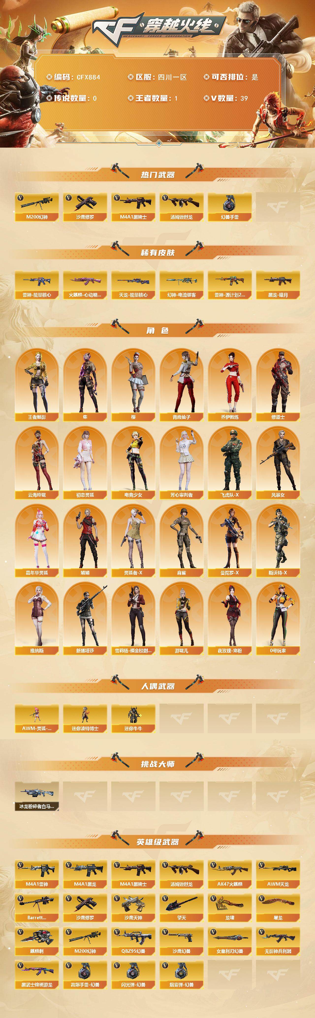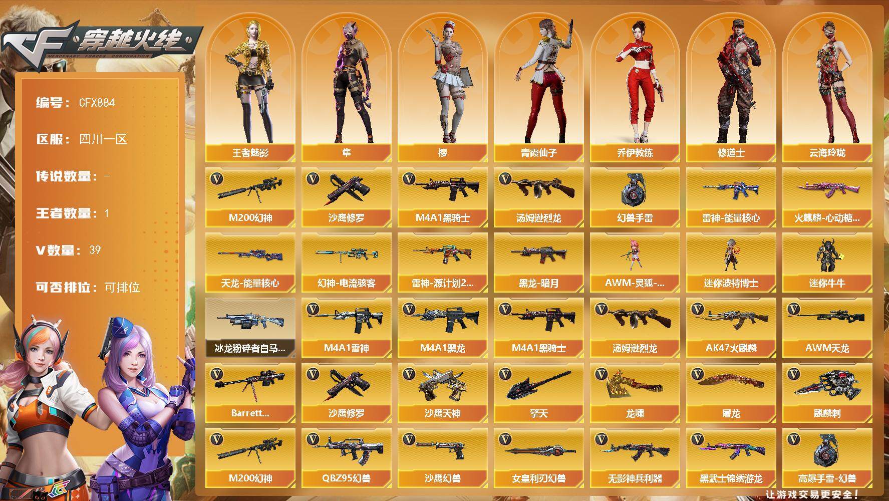 【cfx884】37v/100级/元帅/1王者/2英雄/m200-幻神/m4a1-黑骑士/汤姆逊-烈龙/沙鹰-修罗/高爆手蕾-幻兽/幻神-电流骇客/雷神-能量核心/雷神-源计划2.0专属 皮肤/火麒麟-心动糖果/黑龙-暗月/天龙-能量核心/樱/隼/王者-魅影/乔伊教练/修道士/云海玲珑/初恋灵狐/电竞少女/芳心审判者/飞虎队-x/风暴女/嘉年华灵狐/娟娟/0号玩家/灵狐者-x/麻雀/曼陀罗-x