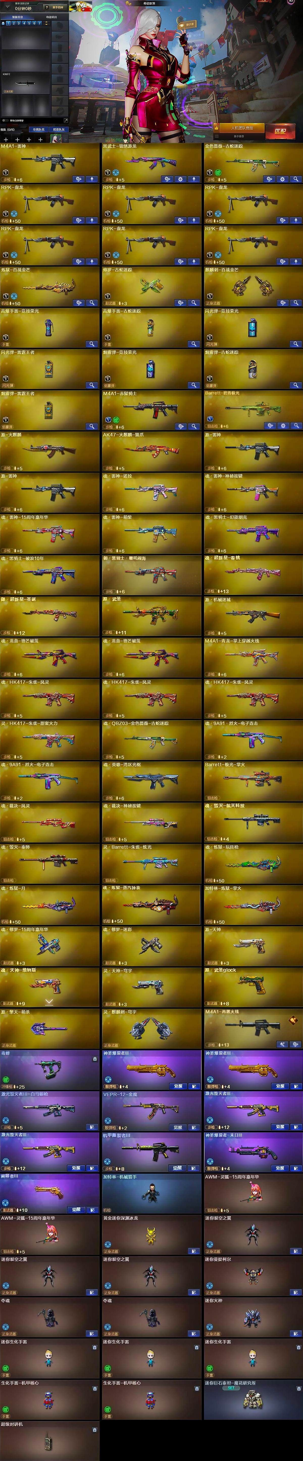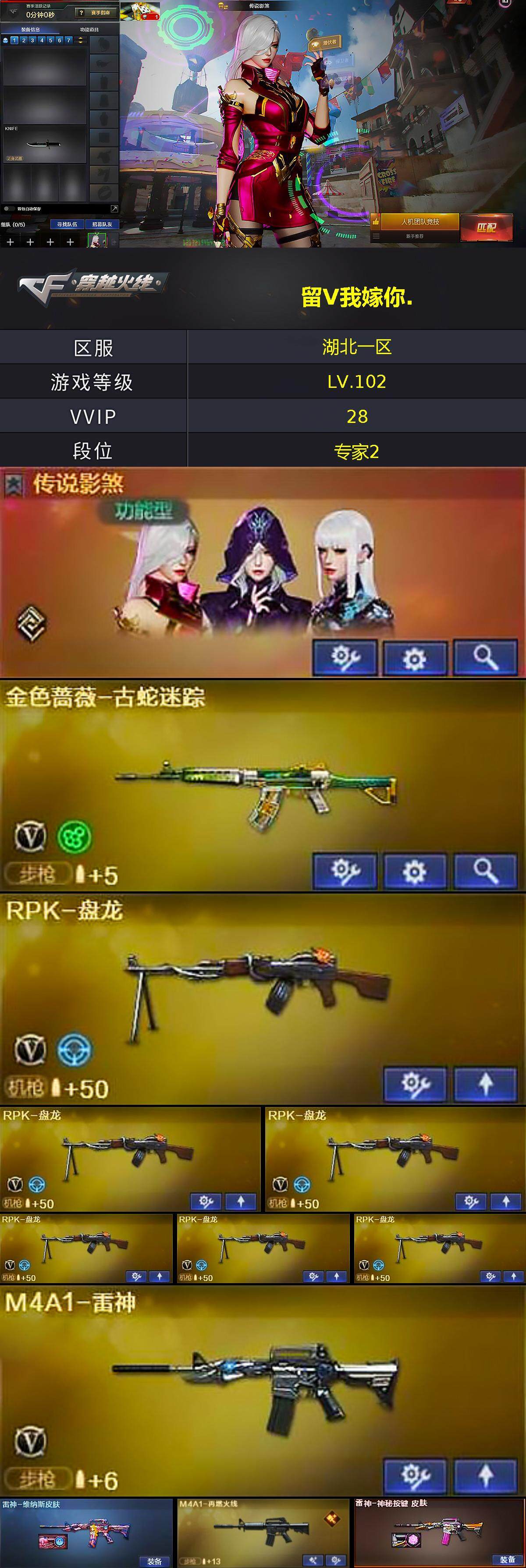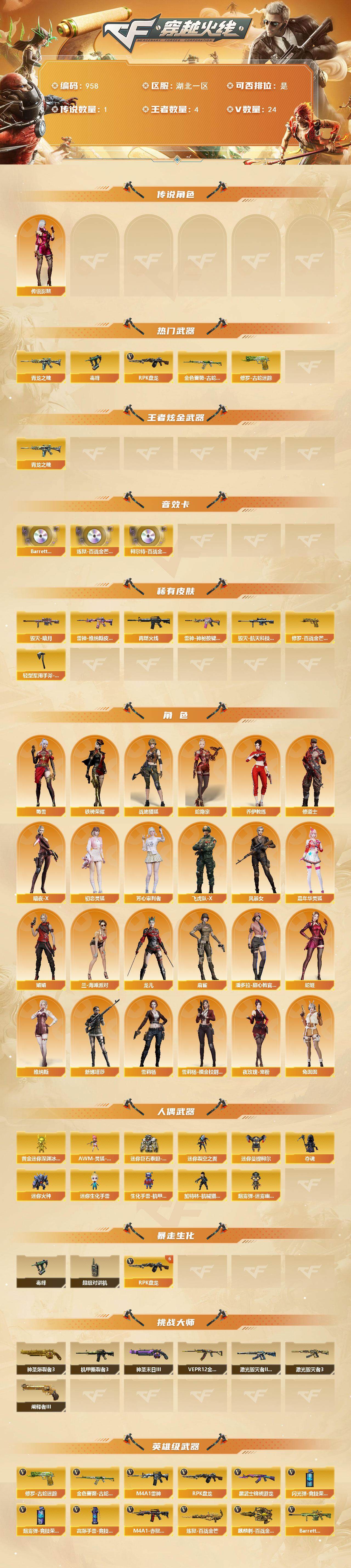 [14687085]湖北一区-24v-4王者-0炫金 【传说角色】:传说影煞 【热门武器】:金色蔷薇-古蛇迷踪,修罗-古蛇迷踪,青龙之魄,毒蜂,rpk-盘龙6 【王者炫金武器】:青龙之魄 【音效卡】:barrett-碧霄极光音效卡,炼狱-百战金芒-庆典舞曲音效卡,柯尔特-百战金芒-庆典舞曲音效卡 【皮肤】:雷神-维纳斯皮肤,m4a1-再燃火线,雷神-神秘按键 皮肤,毁灭-暗月,毁灭-航天科技皮肤,修罗-百战金芒