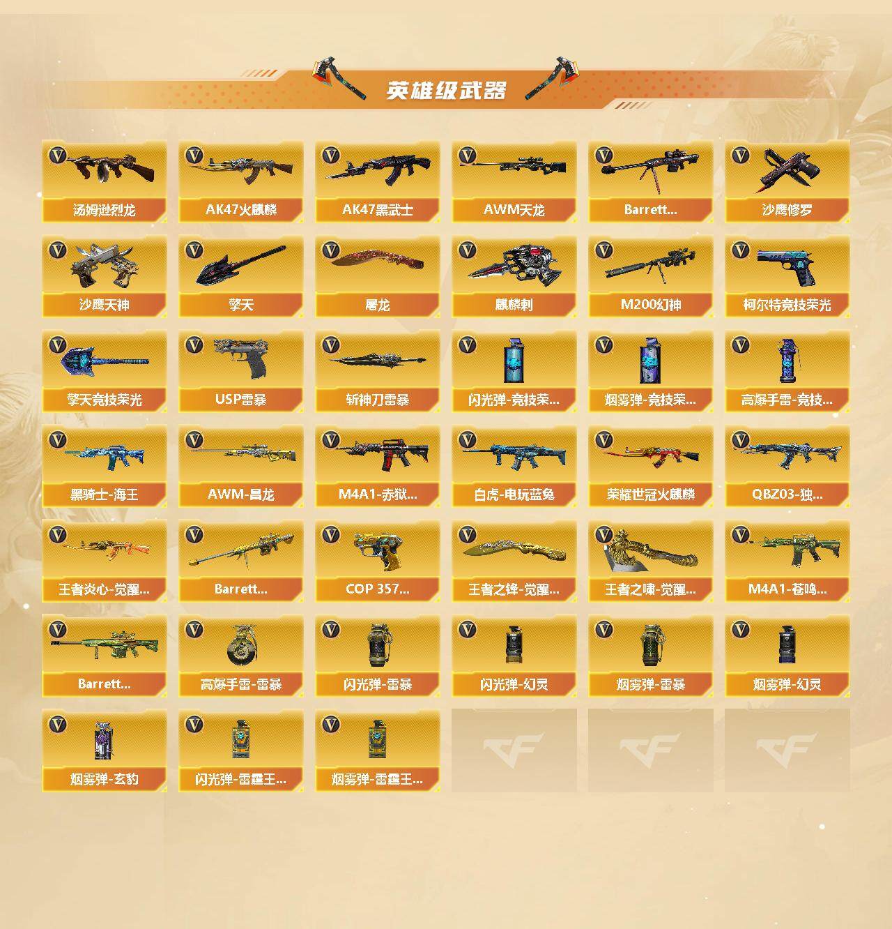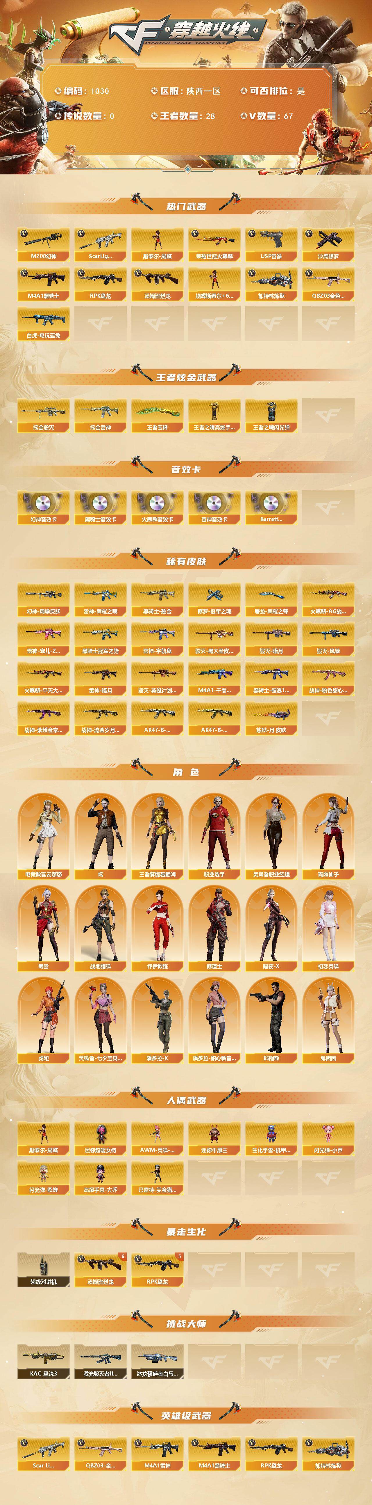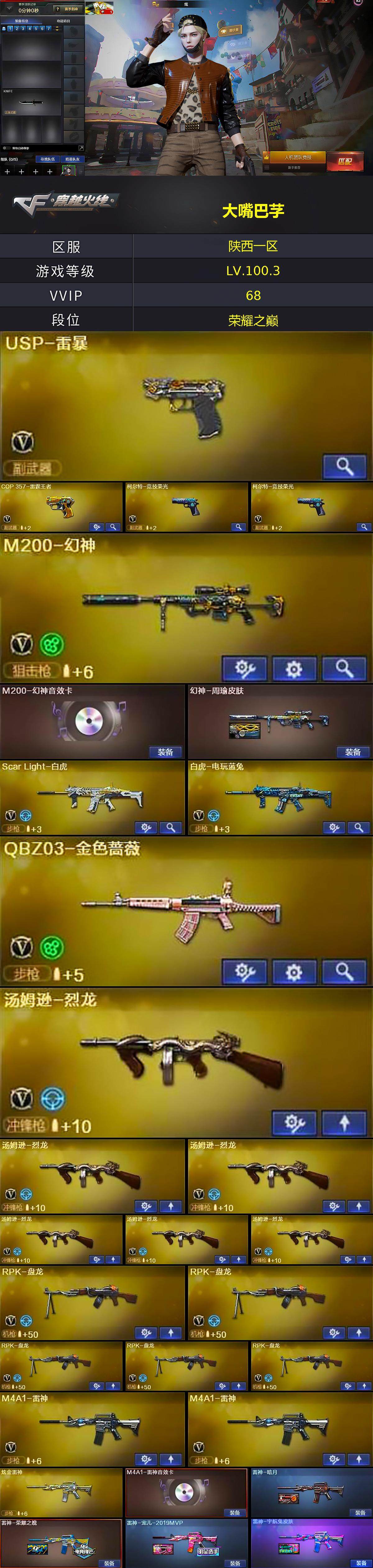 陕西一区-67v-28王者-2炫金 【热门武器】:q03-金色蔷薇,scar light-白虎,m200-幻神,荣耀世冠-火麒麟,白虎-电玩蓝兔,m4a1-黑骑士,汤姆逊-烈龙6,rpk-盘龙5,加特林-炼狱2,斯泰尔-蝴蝶,usp-雷暴,沙鹰-修罗5 【王者炫金武器】:王者玉锋,炫金雷