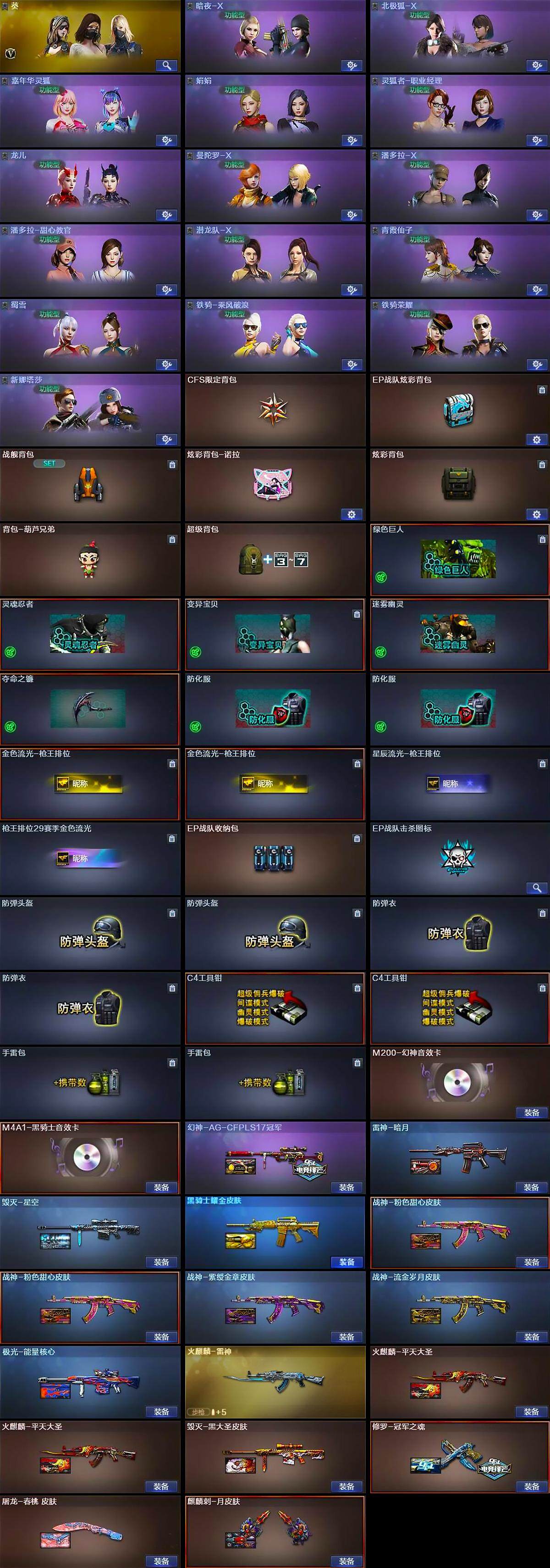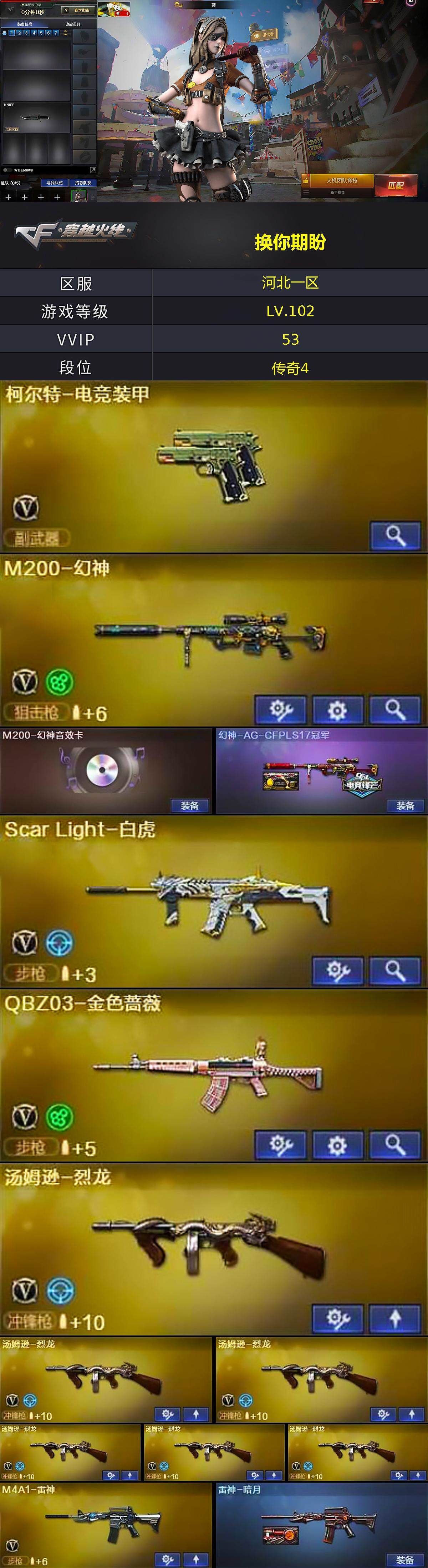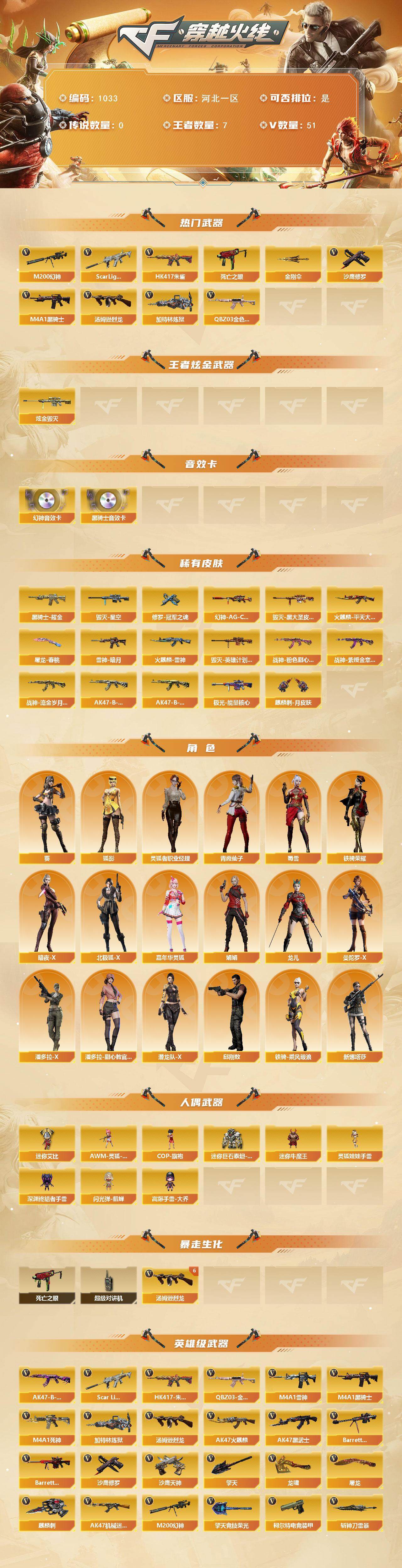 [14688111]河北一区-51v-7王者-1炫金 【热门武器】:q03-金色蔷薇,scar light-白虎,hk417-朱雀,m200-幻神,死亡之眼,m4a1-黑骑士,汤姆逊-烈龙6,加特林-炼狱2,沙鹰-修罗,金刚伞 【王者炫金武器】:炫金毁灭 【音效卡】:m200-幻神音效卡,m4a1-黑骑士音效卡 【皮肤】:幻神-ag-cfpls17冠军,雷神-暗月,火麒麟-雷神,火麒麟-平天大圣2,毁灭-星空,毁灭-黑大圣皮肤,毁灭-英雄计划 皮肤,黑骑士耀金皮肤,战神-粉色甜心皮肤2,战神-紫绶金章皮肤,战神-流金岁月皮肤,ak47-b-常胜将军-刘备,ak47-b-常胜将军-孙权3,极光-能量核心,修罗-冠军之魂,屠龙-春桃 皮肤,麒麟刺-月皮肤 【角色】:葵,狐影,暗夜-x,北极狐-x,嘉年华灵狐,娟娟,灵狐者-职业经理,龙儿,曼陀罗-x,潘多拉-x,潘多拉-甜心教官,潜龙队-x,邱刚敖,青霞仙子,蜀雪,铁骑-乘风破浪,铁骑荣耀,新娜塔莎 【人偶武器】:awm-灵狐-15周年嘉年华,cop-旗袍,迷你牛魔王,深渊终结者手蕾2,闪光丹-貂蝉,高爆手蕾-大乔,迷你艾比,迷你巨石泰坦-魔花研究所,灵狐娃娃手蕾 【暴走生化】:死亡之眼,超级对讲机 【英雄级武器】:ak47-火麒麟2,m4a1-雷神,m4a1-黑骑士,m4a1-死神,ak47-黑武士,ak47-机械迷城,hk417-朱雀,scar light-白虎,q03-金色蔷薇,ak-47-猩红传说,ak47-b-战神,王者炎心-觉醒版,王者火魄-觉醒版,黑骑士-海王2,ak47-b-常胜将军,barrett-毁灭,barrett-极光,m200-幻神,加特林-炼狱2,汤姆逊-烈龙6,沙鹰-修罗,沙鹰-天神2,柯尔特-电竞装甲,屠龙2,龙啸,擎天,麒麟刺,擎天-竞技荣光,斩神刀-雷暴,王者之啸-觉醒版,王者之击-觉醒版2,高爆手蕾-雷暴,闪光丹-雷暴,盐雾蛋-雷暴,盐雾蛋-荣耀世冠ep 【道具】:cfs限定背包,ep战队炫彩背包,战舰背包,炫彩背包-诺拉,炫彩背包,背包-葫芦兄弟,超级背包,绿色巨人,灵魂忍者,变异宝贝,迷雾幽灵,夺命之镰,防化服2,金色流光-呛王排位2,星辰流光-呛王排位,呛王排位29赛季金色流光,ep战队收纳包,ep战队击杀图标,防弹头盔2,防弹衣2,c4工具钳2,手蕾