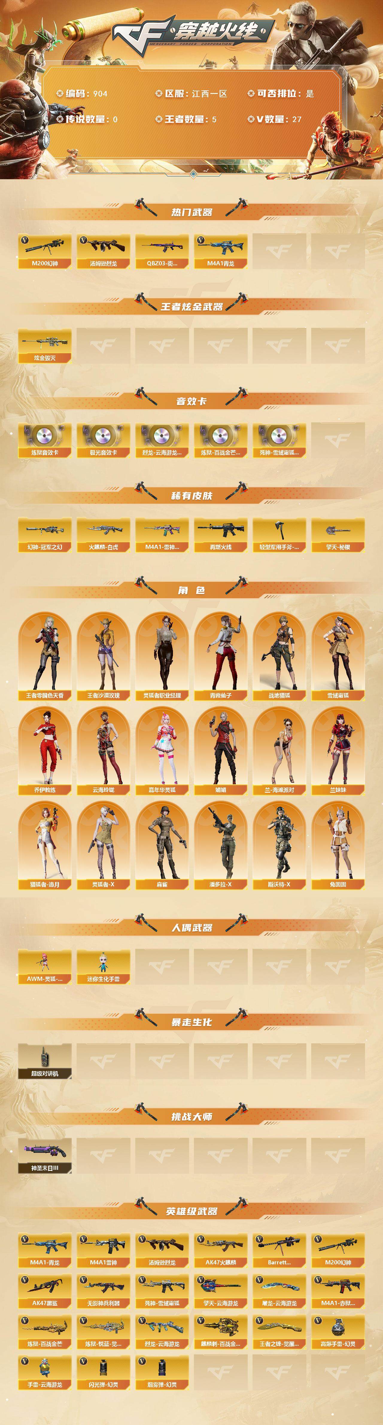 [14697313]江西一区-27v-5王者-1炫金 【热门武器】:m4a1-青龙,m200-幻神2,q03-街机,汤姆逊-烈龙3 【王者炫金武器】:炫金毁灭 【音效卡】:烈龙-云海游龙音效卡,barrett-极光音效卡,加特林-炼狱音效卡,炼狱-百战金芒-庆典舞曲音效卡,死神-雪域霜狐-怀旧音效卡 【皮肤】:幻神-冠军之幻,m4a1-雷神-巅峰荣耀皮肤,m4a1-再燃火线,火麒麟-白虎,轻型军用手斧-再燃火线,擎天-秘银 【角色】:战地猎狐,王者-零-国色天香,王者沙漠玫瑰,雪域霜狐,乔伊教练,云海玲珑,嘉年华灵狐,娟娟,兰-海滩派对,兰妹妹,猎狐者-追月,灵狐者-x,灵狐者-职业经理,麻雀,潘多拉-x,青霞仙子,斯沃特-x,兔囡囡 【人偶武器】:awm-灵狐-15周年嘉年华,迷你生化手蕾 【暴走生化】:超级对讲机 【挑战大师】:神圣爆裂者-末日iii 【英雄级武器】:ak47-火麒麟,m4a1-雷神,ak47-黑鲨3,m4a1-青龙,无影-神兵利器,死神-雪域霜狐,barrett-毁灭,m200-幻神2,炼狱-百战金芒,炼狱-悦蓝-觉醒版,汤姆逊-烈龙3,烈龙-云海游龙,擎天-云海游龙,麒麟刺-百战金芒,屠龙-云海游龙,王者之锋-觉醒版,高爆手蕾-幻灵,手蕾-云海游龙,闪光丹-幻灵,盐雾蛋-幻灵,m4a1-赤狱骑士 【道具】:喜狮迎春背包,云山科技背包,云海游龙炫彩背包,亚洲杯纪念炫彩背包,百战金芒炫彩背包,雪域霜狐炫彩背包,女皇终结者-魔龙之吻,救世主-黑桃战神,绿色巨人,灵魂忍者2,变异宝贝,迷雾幽灵2,夺命之镰,防化服3,金色流光-呛王排位2,星辰流光-呛王排位,流光-鎏金之域,流光-再燃火线,语音特效-盛典烟火,语音特效-怀旧,雪域霜狐表情,萌萌小葵表情,云海游龙表情,防弹头盔4,防弹衣4,c4工具钳4,手蕾包4 【特殊呛械】:3烈龙