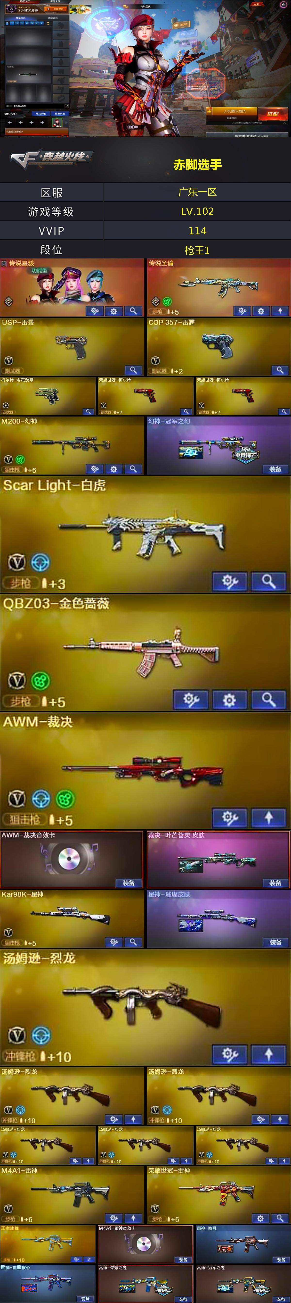 广东一区-112v-10王者-7炫金 【传说武器】:传说圣谕 【传说角色】:传说星骇 【热门武器】:传说圣谕,q03-金色蔷薇,scar light-白虎,hk417-朱雀,m200-幻神,死亡之眼2,荣耀世冠-雷神,荣耀世冠-柯尔特2,kar98k-星神,金色小号,m4a1-黑骑士,汤姆逊-烈龙6,加特林-炼狱,斯泰尔-蝴蝶,火麒麟-绝迹,cop-白鲨,usp-雷暴,沙鹰-修罗3