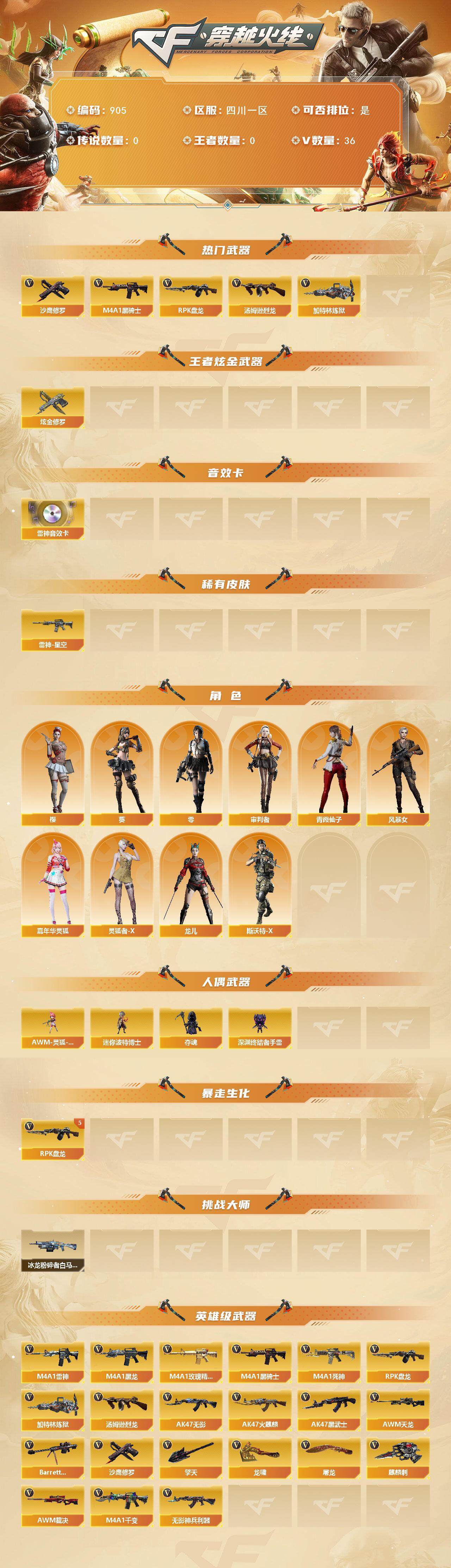 [14697513]四川一区-36v-0王者-1炫金 【热门武器】:m4a1-黑骑士,汤姆逊-烈龙,rpk-盘龙5,加特林-炼狱,沙鹰-修罗 【王者炫金武器】:炫金修罗 【音效卡】:m4a1-雷神音效卡 【皮肤】:雷神-星空 【角色】:零,葵,樱,审判者,风暴女,嘉年华灵狐,灵狐者-x,龙儿,青霞仙子,斯沃特-x 【人偶武器】:awm-灵狐-15周年嘉年华,迷你波特博士,夺魂,深渊终结者手蕾 【挑战大师】:冰龙粉碎者-白马银呛 【英雄级武器】:m4a1-千变2,ak47-火麒麟,m4a1-黑龙2,m4a1-雷神,m4a1-黑骑士,ak47-无影,m4a1-死神,ak47-黑武士,无影-神兵利器,m4a1-玫瑰精灵,awm-天龙2,barrett-毁灭2,awm-裁决,rpk-盘龙5,加特林-炼狱,汤姆逊-烈龙,沙鹰-修罗,屠龙,龙啸3,擎天,麒麟刺 【道具】:全能呛王背包,炫彩背包,超级背包,夺命之镰,防化服,金色流光-呛王排位,防弹头盔4,防弹衣4,c4工具钳4,手蕾包3 【特殊呛械】:1黑骑士,1烈龙,5盘龙,1炼狱