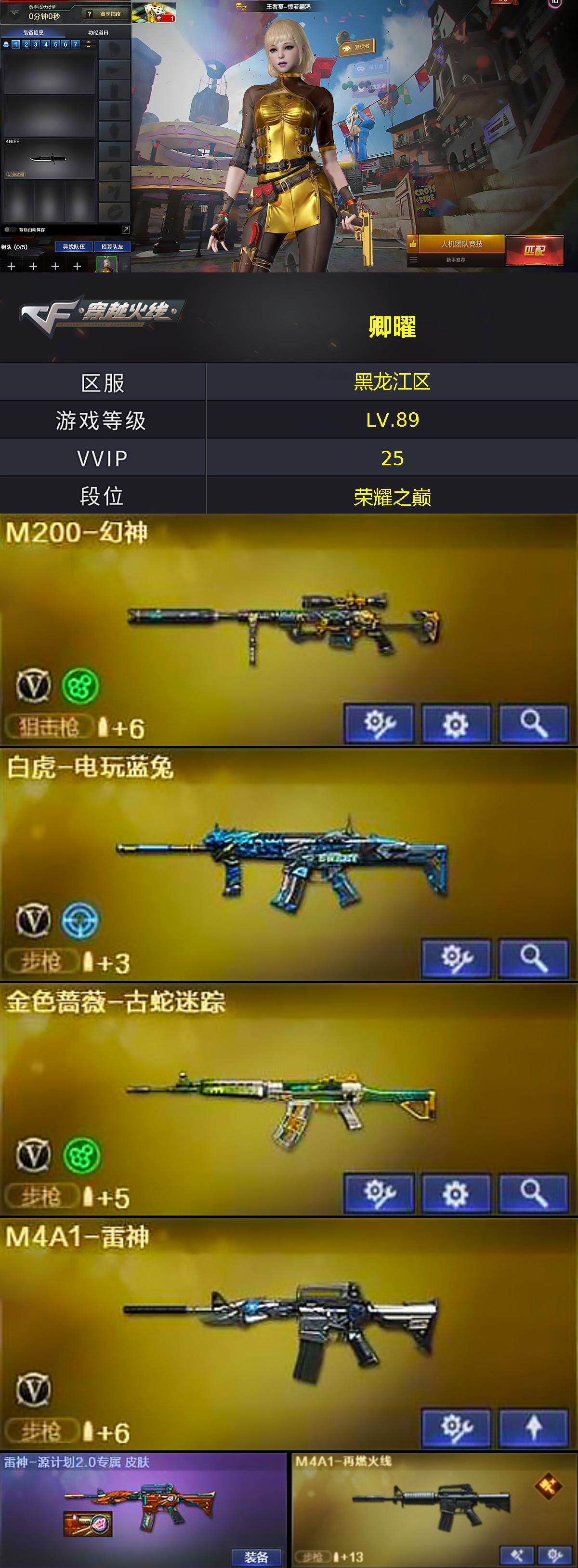 黑龙江区-22v-1王者-0炫金 【热门武器】:m200-幻神,金色蔷薇-古蛇迷踪,修罗-古蛇迷踪,白虎-电玩蓝兔 【音效卡】:炼狱-百战金芒-庆典舞曲音效卡 【皮肤】:金色蔷薇-电竞之星 皮肤,雷神-源计划2.0专属 皮肤,m4a1-再燃火线,火麒麟-战神关羽,火麒麟-平天大圣,毁灭-黑大圣皮肤,黑骑士-暗月,ak47-b-常胜将军-曹操,轻型军用手斧-再燃火线 【角色】:王者葵-惊若翩鸿,蛇隐宗,奇洋探员,乔伊教练,修道士,云海玲珑,暗夜-x,初恋灵狐,芳心审判者,风暴女,娟娟,灵狐者-x,龙儿,曼陀罗-x,潘多拉-x,潘多拉-甜心教官,蛇姬,斯沃特-x,兔囡囡,新娜塔莎,雪莉杨,影武者-x 【人偶武器】:迷你救赎猎手,黄金迷你裂空之翼,生化手蕾-机甲核心3,迷你超能女侍 【挑战大师】:激光毁灭者iii-白马银呛2,试炼破坏者iii 【英雄级武器】:ak47-火麒麟,m4a1-雷神,金色蔷薇-古蛇迷踪,ak-47-猩红传说2,白虎-电玩蓝兔,m200-幻神,炼狱-百战金芒,修罗-古蛇迷踪,麒麟刺-百战金芒,高爆手蕾-竞技荣光,手蕾-云海游龙,高爆手蕾-古蛇迷踪,闪光丹-雷暴,闪光丹-幻灵,闪光丹-竞技荣光,盐雾蛋-雷暴,盐雾蛋-古蛇迷踪,m4a1-赤狱骑士 【道具】:bs战队炫彩背包,cfs限定背包,亚洲杯纪念炫彩背包,古蛇迷踪炫彩背包,奇洋探员-海龟背包,百战金芒炫彩背包,虎牙炫彩背包,超级背包,女皇终结者-魔龙之吻,救世主-黑桃战神,绿色巨人,灵魂忍者2,变异宝贝,迷雾幽灵2,夺命之镰,防化服3,金色流光-呛王排位2,星辰流光-呛王排位,流光-再燃火线,呛王排位28赛季金色流光,呛王排位29赛季金色流光,语音特效-盛典烟火,古蛇迷踪打击特效,蛇隐宗表情,萌萌小葵表情,电玩兔兔表情,ep战队名片,ep战队喷图,ep战队击杀图标,c4-红龙,防弹头盔5,防弹衣5,c4工具钳5,手蕾包5 【特殊呛械】: