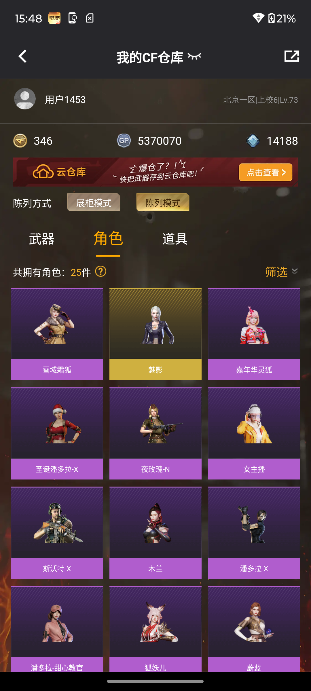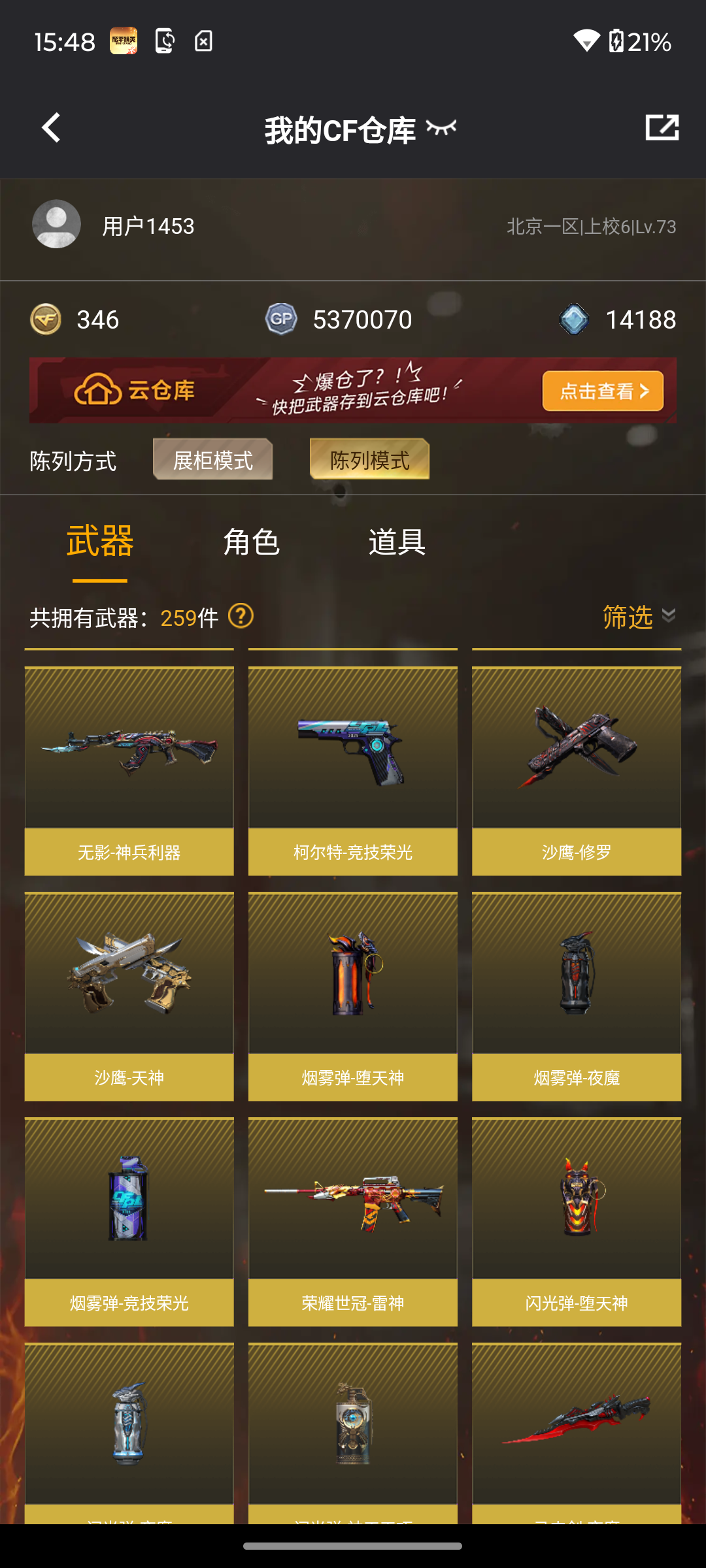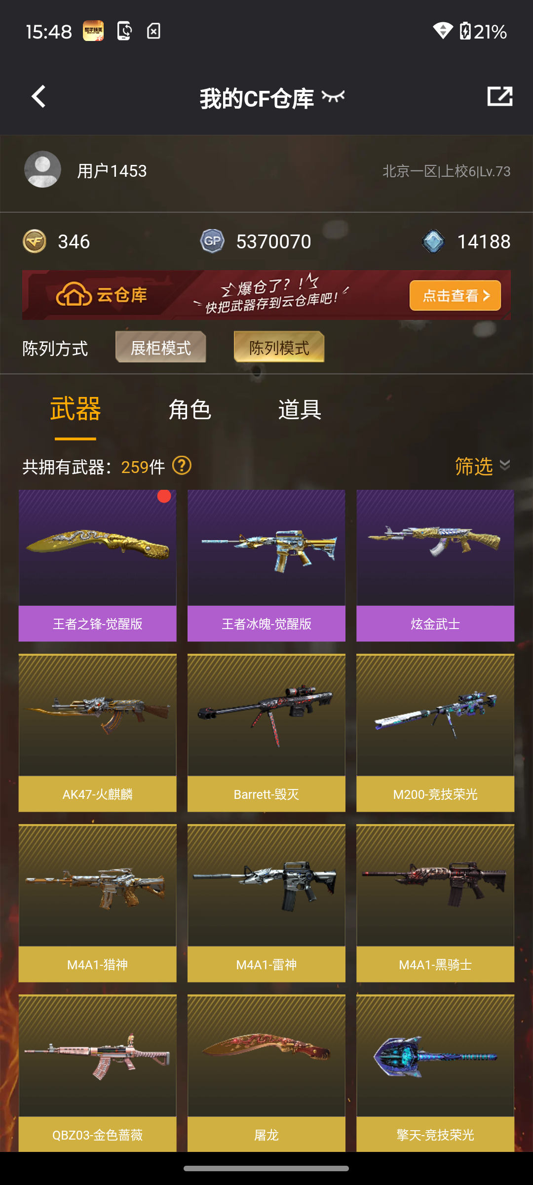 【26v 竞技荣光一套 王者之锋觉醒版 】【等级】73【区服】北京一区【vip】1【英雄角色】2【英雄武器】26【王者级武器】王者之锋-觉醒版 王者冰魄-觉醒版【炫金级武器】炫金武士【英雄级角色】魅影【英雄级武器】闪光丹-神工天巧 无影-神兵利器 ak47-火麒麟 擎天-竞技荣光 高爆手蕾-竞技荣光 盐雾蛋-竞技荣光 m200-竞技荣光 柯尔特-竞技荣光 barrett-毁灭 m4a1-雷神 沙鹰