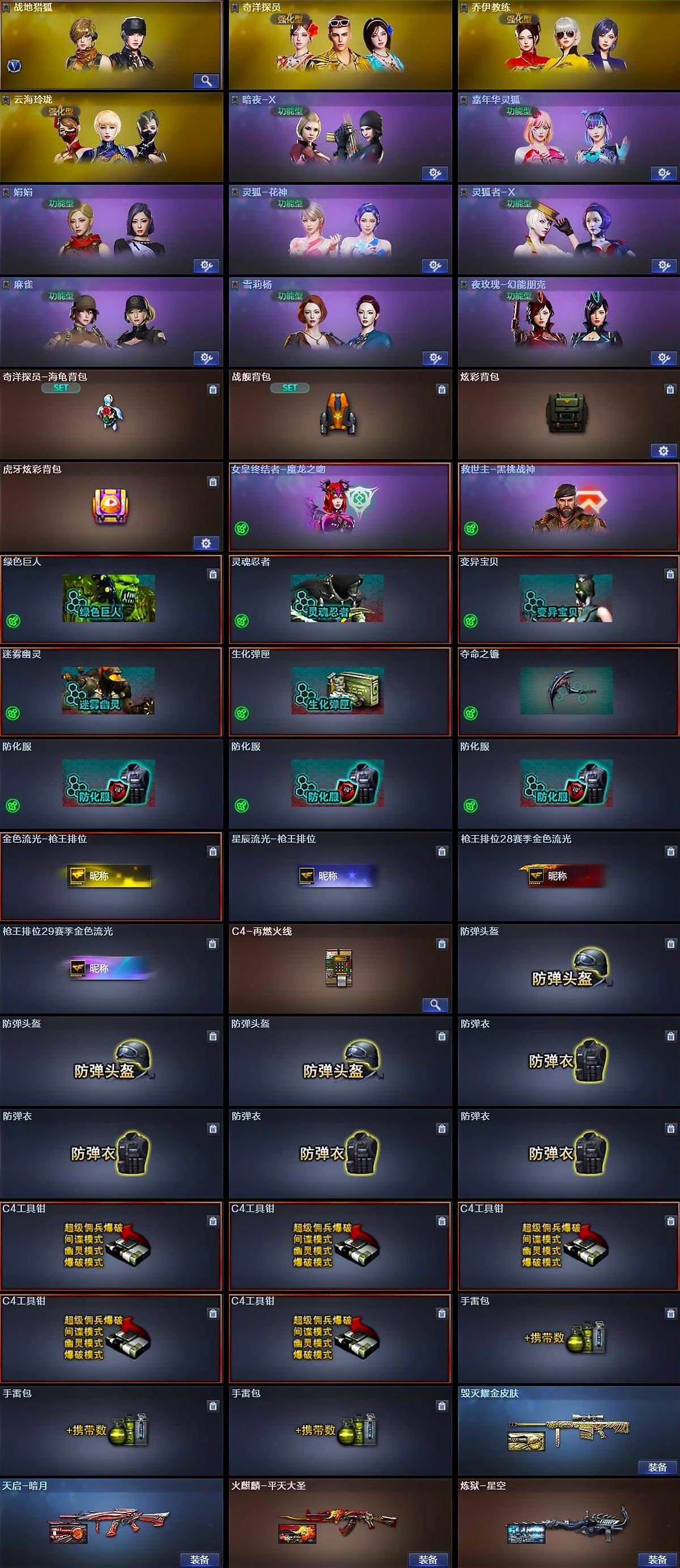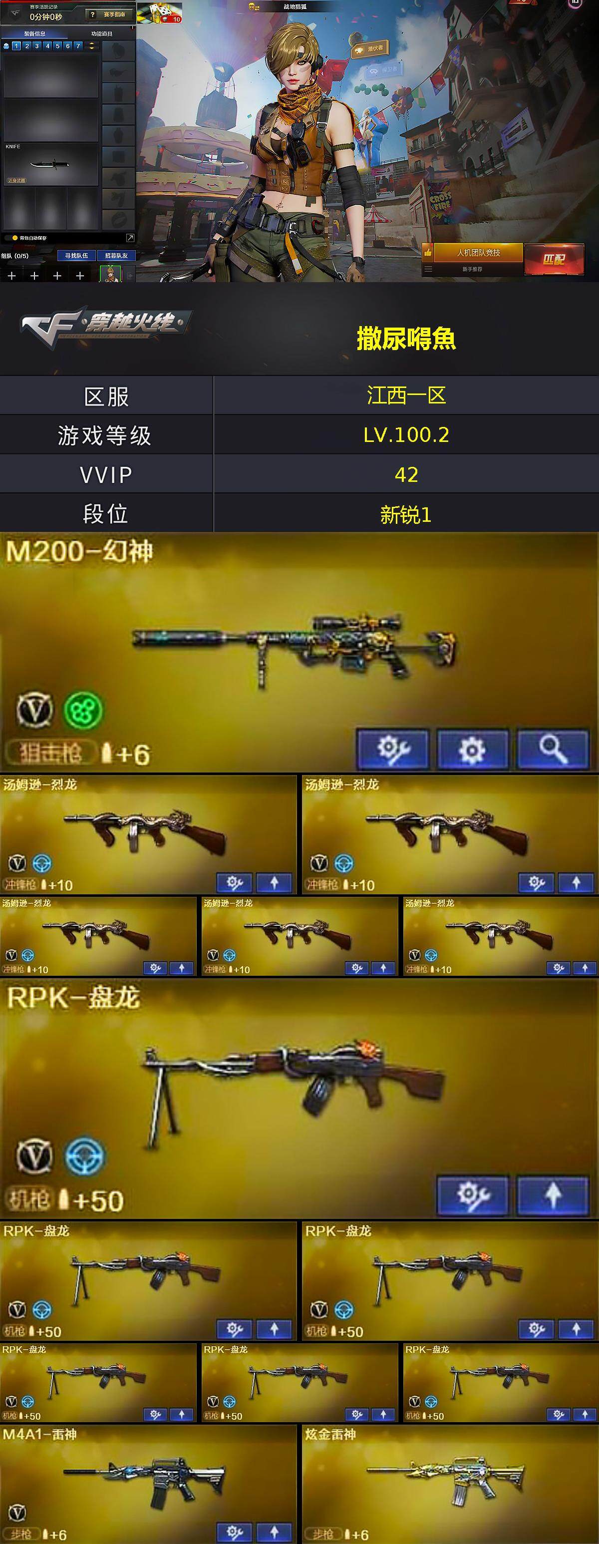江西一区-42v-6王者-4炫金 【热门武器】:hk417-朱雀,m200-幻神,死亡之眼,m4a1-黑骑士2,汤姆逊-烈龙5,rpk-盘龙6,加特林-炼狱2,沙鹰-修罗 【王者炫金武器】:王者之影,王者之心,炼狱-悦蓝,王者之刺,炫金无影,炫金千变,炫金雷神,炫金修罗 【皮肤】:火麒麟-平天大圣,毁灭耀金皮肤,天启-暗月,炼狱-星空 【角色】:战地猎狐,奇洋探员,乔伊教练,云海玲珑,