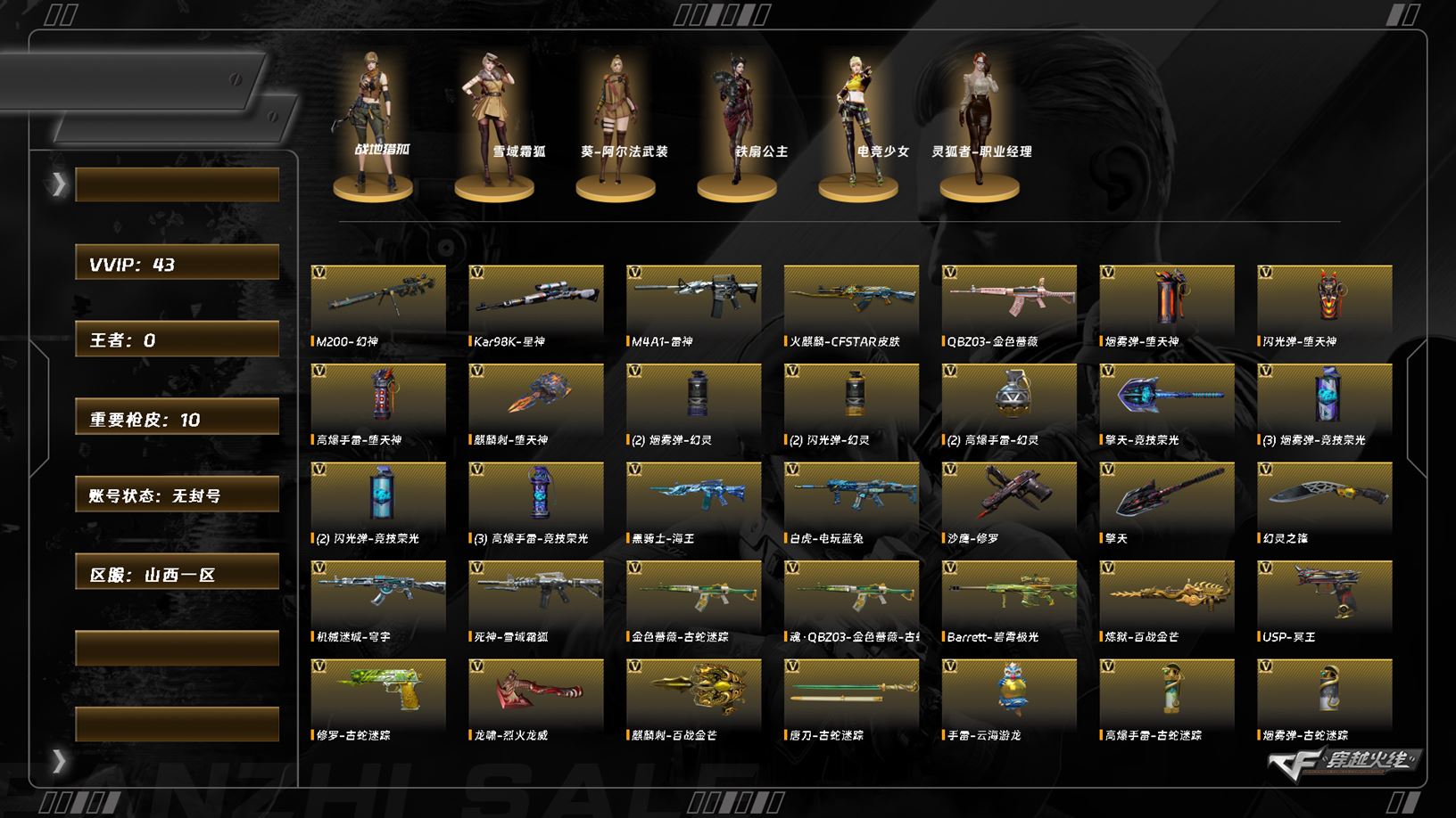 lc7091,北部,山西一区,可排位,39v,幻神,星神,白虎电玩蓝兔,q金色蔷薇,usp冥王,雷神,【,四防角色,灵狐者职业经理,】,【角色】,零纪元,战地猎狐,葵阿尔法武装,蛇隐宗,雪域霜狐,【,音效卡,炼狱百战金芒庆典舞曲音效卡,死神雪域霜狐怀旧音效卡,】,【呛皮】,雷神神秘按键,【小人呛