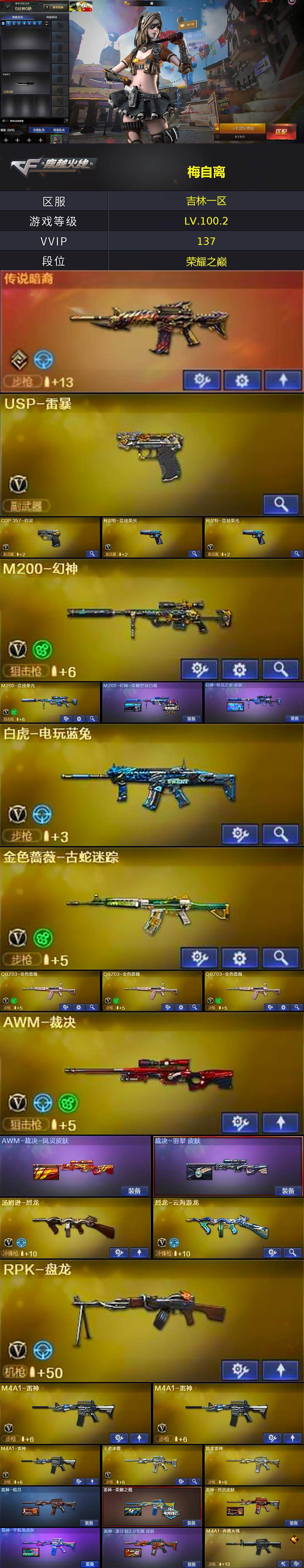吉林一区-129v-13王者-5炫金 【传说武器】:传说暗裔 【热门武器】:传说暗裔,q03-金色蔷薇3,m4a1-青龙,m200-幻神,金色蔷薇-古蛇迷踪,修罗-古蛇迷踪,m200-竞技荣光,死亡之眼,白虎-电玩蓝兔,金色小号,cat-刀锋,牛牛-ak47,m4a1-黑骑士3,汤姆逊-烈龙,rpk-盘龙,加特林-炼狱,cop-白鲨,usp-雷暴,cop 357-幻灵,沙鹰-修罗,金刚