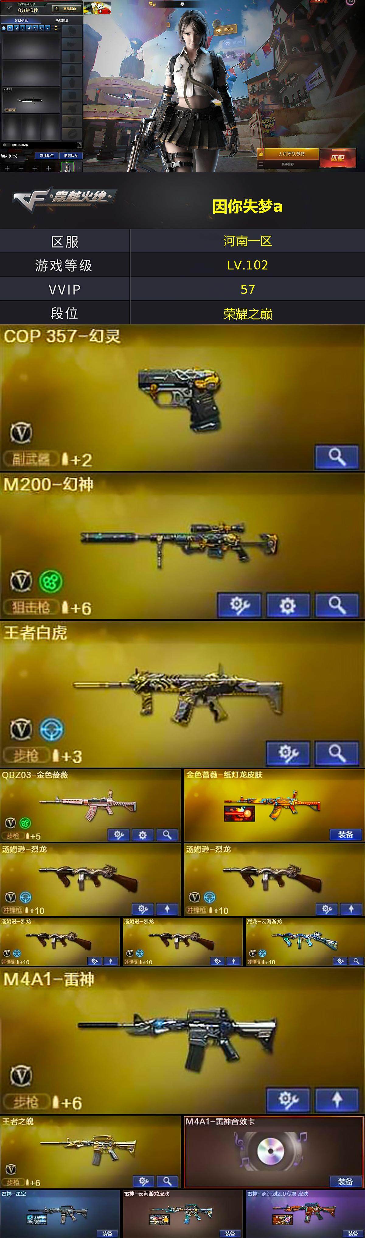 河南一区-57v-5王者-0炫金 【热门武器】:q03-金色蔷薇,m4a1-青龙,m200-幻神,死亡之眼,q03-街机,毒蜂,m4a1-黑骑士,汤姆逊-烈龙4,加特林-炼狱2,毁灭-孙三炮,cop 357-幻灵,沙鹰-修罗 【音效卡】:天神-动感闪耀 音效卡,m4a1-雷神音效卡,m4a1-黑骑士音效卡,barrett-毁灭音效卡,barrett-毁灭-云海游龙音效卡 【皮肤】:
