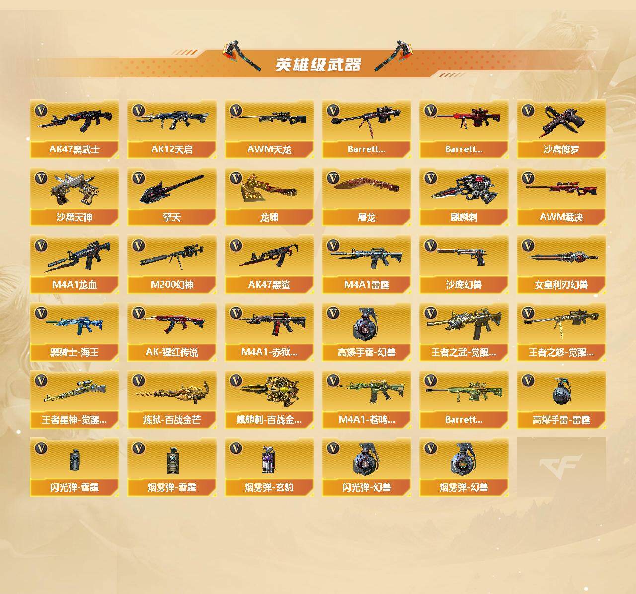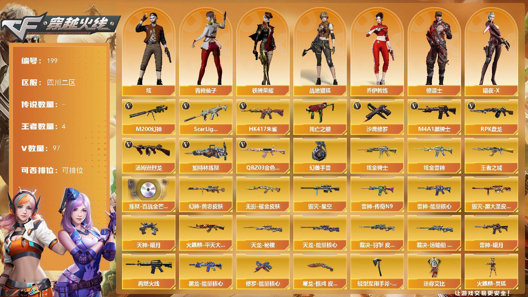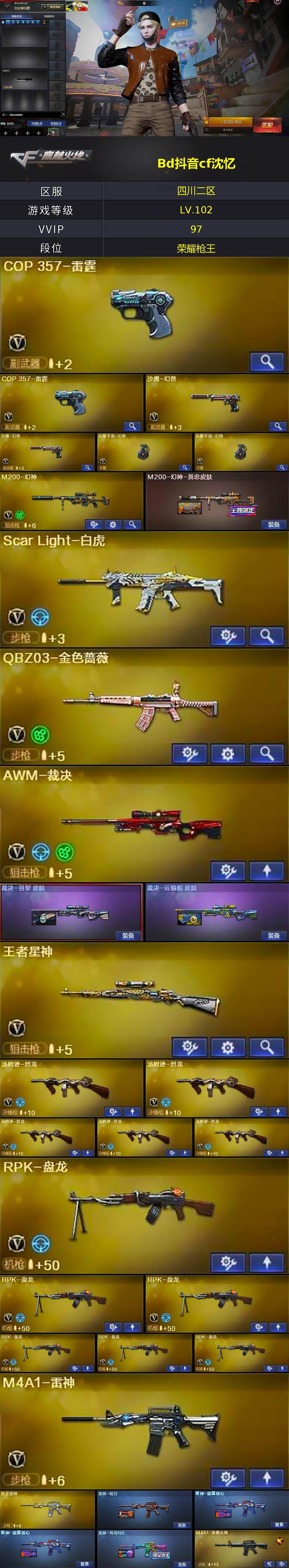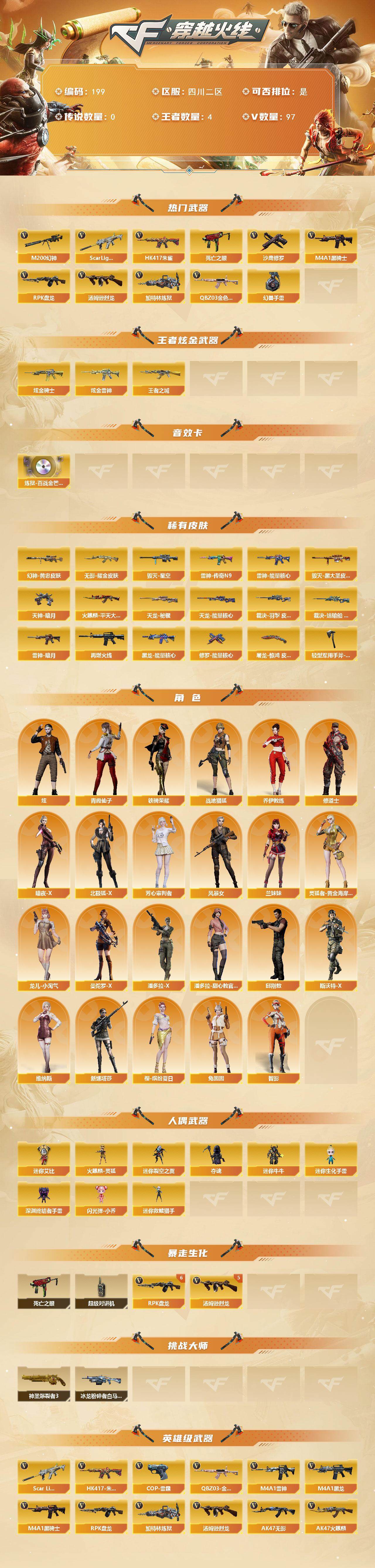 四川二区-97v-4王者-2炫金 【热门武器】:q03-金色蔷薇,scar light-白虎,hk417-朱雀,m200-幻神,死亡之眼,m4a1-黑骑士,汤姆逊-烈龙5,rpk-盘龙6,加特林-炼狱3,沙鹰-修罗4,高爆手蕾-幻兽2 【王者炫金武器】:王者之城,炫金骑士,炫金雷神 【音效卡】:炼狱-百战金芒-庆典舞曲音效卡 【皮肤】:m200-幻神-黄忠皮肤,裁决-羽掣 皮肤,裁决-运输船 皮肤,雷神-暗月,雷神-能量核心2,雷神-传奇n9,m4a1-再燃火线,火麒麟-平天大圣,毁灭-星空,毁灭-黑大圣皮肤,黑龙-能量核心,无影耀金皮肤,天龙-秘银,天龙-能量核心,修罗-能量核心,天神-暗月2,屠龙-惊鸿 皮肤,轻型军用手斧-再燃火线 【角色】:炫,战地猎狐,乔伊教练,修道士,暗夜-x,北极狐-x,芳心审判者,风暴女,兰妹妹,灵狐者-黄金海岸,龙儿-小淘气,曼陀罗-x,潘多拉-x,潘多拉-甜心教官,邱刚敖,青霞仙子,斯沃特-x,铁骑荣耀,兔囡囡,维纳斯,新娜塔莎,樱-缤纷夏日,智影 【人偶武器】:火麒麟-灵狐,迷你救赎猎手,迷你裂空之翼,夺魂,迷你牛牛,迷你生化手蕾,深渊终结者手蕾,闪光丹-小乔,迷你艾比 【暴走生化】:死亡之眼,超级对讲机 【挑战大师】:神圣爆裂者iii,冰龙粉碎者-白马银呛 【英雄级武器】:ak47-火麒麟2,m4a1-黑龙,m4a1-雷神,m4a1-黑骑士,ak47-无影,ak47-黑武士,ak12-天启,ak47-黑鲨,m4a1-龙血4,m4a1-雷霆,hk417-朱雀,scar light-白虎,q03-金色蔷薇,王者之武-觉醒版,ak-47-猩红传说,黑骑士-海王,awm-天龙2,barrett-毁灭2,barrett-极光,awm-裁决,m200-幻神,王者之怒-觉醒版,王者星神-觉醒版,rpk-盘龙6,加特林-炼狱3,炼狱-百战金芒,汤姆逊-烈龙5,沙鹰-修罗4,沙鹰-天神,cop-雷霆2,沙鹰-幻兽2,屠龙4,龙啸,擎天3,麒麟刺,女皇利刃-幻兽,麒麟刺-百战金芒,高爆手蕾-雷霆6,高爆手蕾-幻兽2,闪光丹-雷霆6,闪光丹-幻兽2,盐雾蛋-雷霆6,盐雾蛋-幻兽2,盐雾蛋-玄豹2,m4a1-赤狱骑士,m4a1-苍鸣雷神,barrett-碧霄极光 【道具】:xrock炫彩背包,冰冰企鹅背包-猛男专用,炫彩背包,百战金芒炫彩背包,老虎背包,超级背包2,女皇终结者-魔龙之吻,救世主-黑桃战神,黄金生化钩,绿色巨人,灵魂忍者2,变异宝贝,妖姬,迷雾幽灵,生化弹匣,夺命之镰,防化服3,流光-鎏金之域,呛王排位29赛季金色流光,语音特效-盛典烟火,萌萌小葵表情,电玩兔兔表情,防弹头盔5,防弹衣5,c4工具钳4,手蕾包3 【特殊呛械】:1白虎,1黑骑士,5烈龙,6盘龙,3炼狱