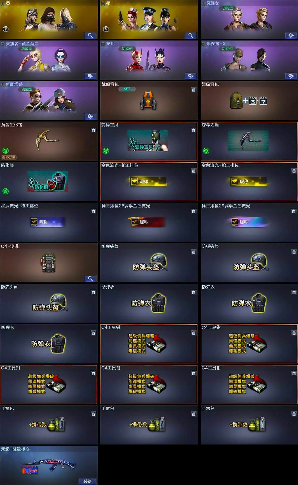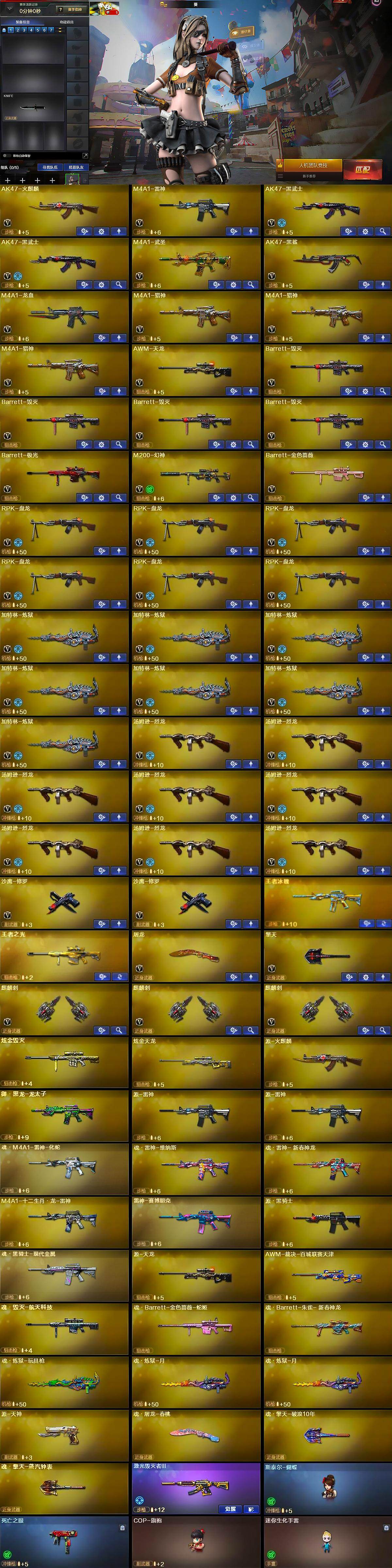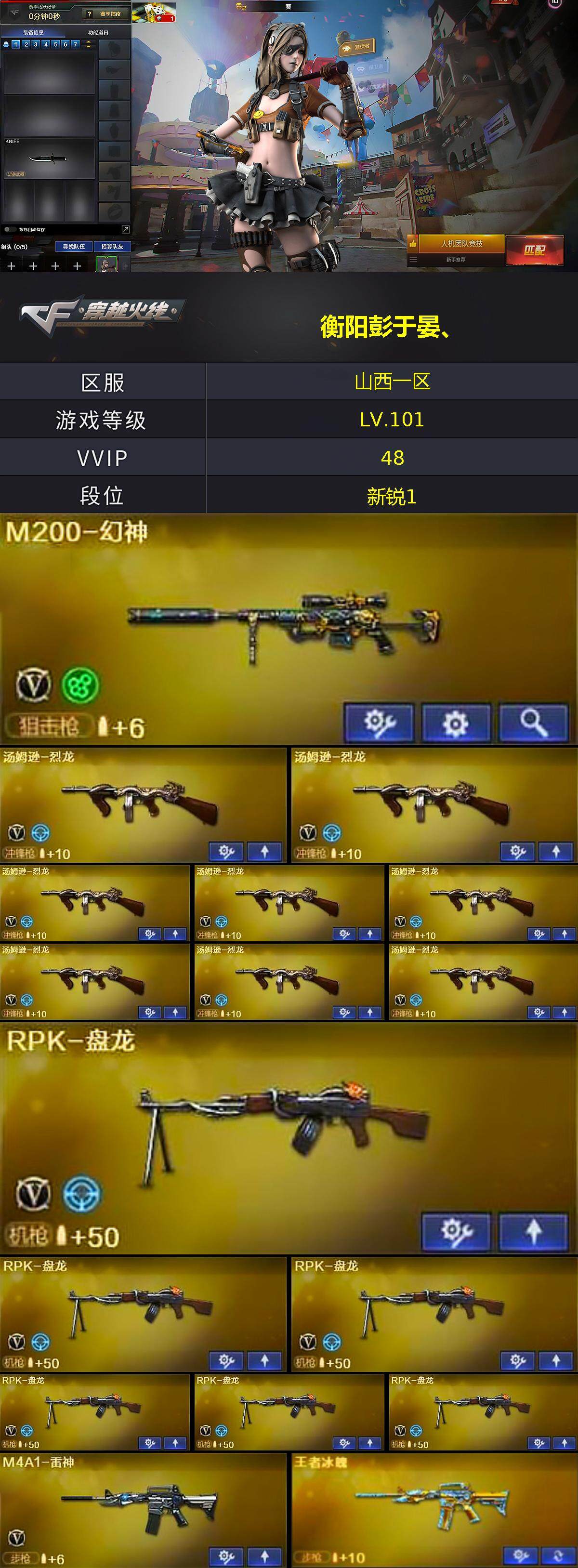 山西一区-48v-2王者-2炫金 【热门武器】:m200-幻神,死亡之眼,汤姆逊-烈龙8,rpk-盘龙6,加特林-炼狱7,斯泰尔-蝴蝶,沙鹰-修罗2 【王者炫金武器】:王者之魄,王者之光,炫金毁灭,炫金天龙 【皮肤】:无影-能量核心 【角色】:葵,樱,风暴女,灵狐者-黄金海岸,龙儿,潘多拉-x,新娜塔莎 【人偶武器】:斯泰尔-蝴蝶,cop-旗袍,迷你生化手蕾 【暴走生化】:死亡之眼 【