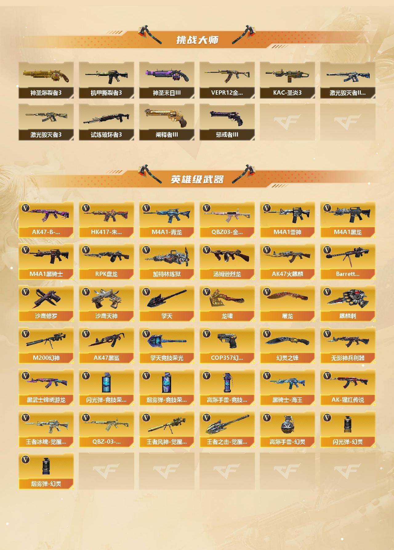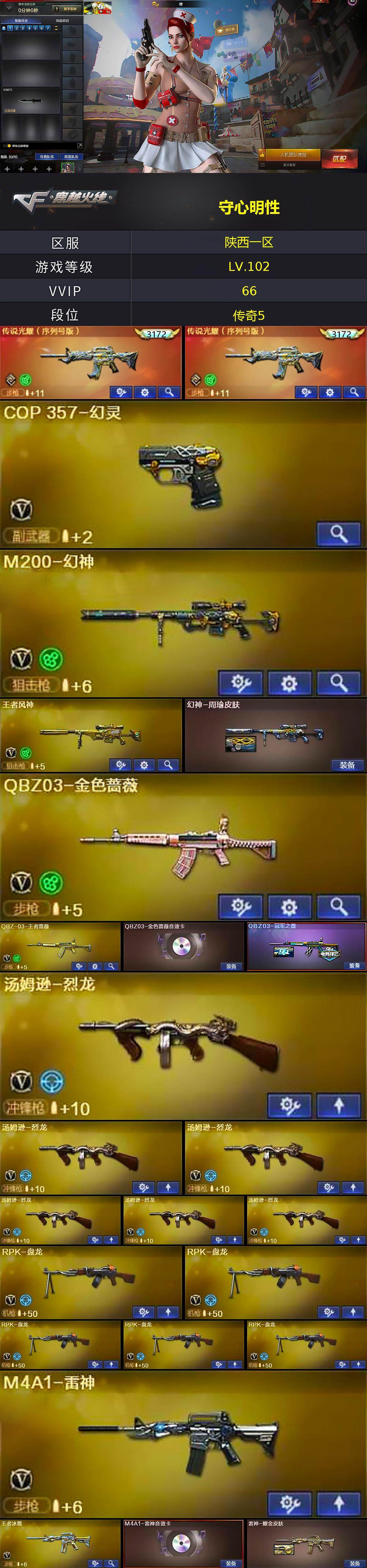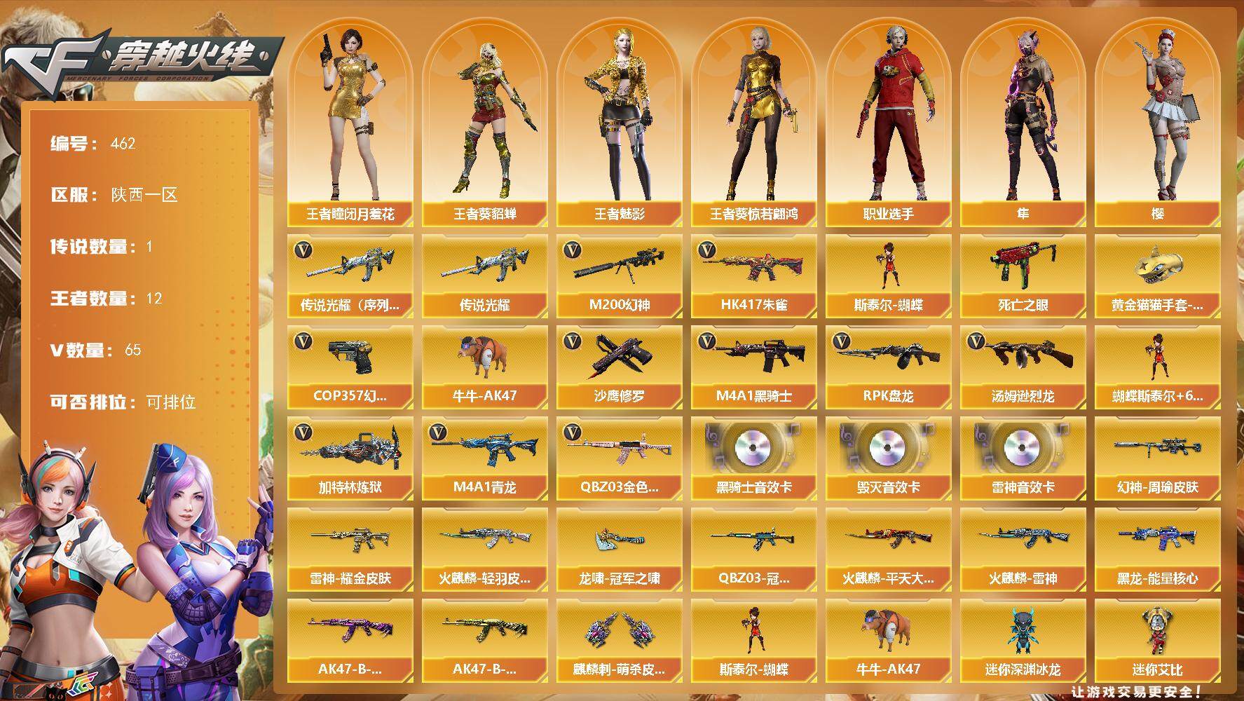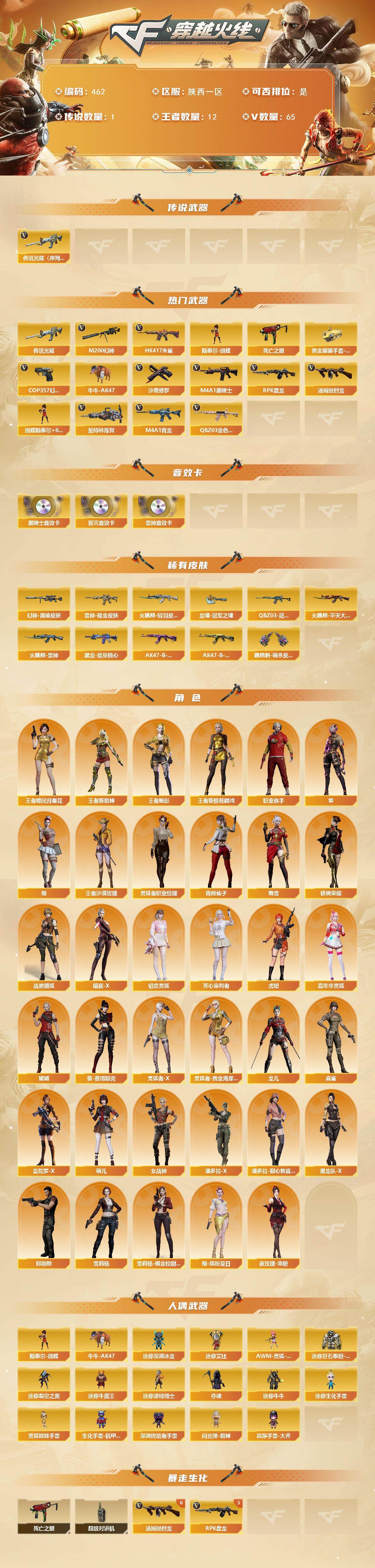 陕西一区-65v-12王者-0炫金 【传说武器】:传说光耀(序列号版) 【热门武器】:传说光耀,q03-金色蔷薇,hk417-朱雀,m4a1-青龙,m200-幻神,死亡之眼,牛牛-ak47,m4a1-黑骑士2,汤姆逊-烈龙6,rpk-盘龙5,加特林-炼狱4,斯泰尔-蝴蝶,cop 357-幻灵,沙鹰-修罗5,黄金猫猫手套-白鲨 【音效卡】:m4a1-雷神音效卡,m4a1-黑骑士音效卡,barrett-毁灭音效卡 【皮肤】:幻神-周瑜皮肤,q03-冠军之薇,雷神-耀金皮肤,火麒麟-雷神,火麒麟-轻羽皮肤2,火麒麟-平天大圣,黑龙-能量核心,ak47-b-常胜将军-曹操,ak47-b-常胜将军-孙权,龙啸-冠军之啸,麒麟刺-萌杀皮肤 【角色】:樱,隼,战地猎狐,王者-瞳-闭月羞花,王者-葵-貂蝉,王者葵-惊若翩鸿,王者-魅影,王者沙漠玫瑰,暗夜-x,初恋灵狐,芳心审判者,虎妞,嘉年华灵狐,娟娟,葵-赛博朋克,灵狐者-x,灵狐者-黄金海岸,灵狐者-职业经理,龙儿,麻雀,曼陀罗-x,萌儿,女战神,潘多拉-x,潘多拉-甜心教官,潜龙队-x,邱刚敖,青霞仙子,蜀雪,铁骑荣耀,雪莉杨,雪莉杨-摸金校尉,夜玫瑰-宠粉,樱-缤纷夏日,职业选手 【人偶武器】:斯泰尔-蝴蝶,awm-灵狐-15周年嘉年华,牛牛-ak47,迷你深渊冰龙,迷你裂空之翼,迷你牛魔王,迷你波特博士4,夺魂3,迷你牛牛,迷你生化手蕾,生化手蕾-机甲核心2,深渊终结者手蕾2,闪光丹-貂蝉,高爆手蕾-大乔,迷你艾比,迷你巨石泰坦-魔花研究所,灵狐娃娃手蕾 【暴走生化】:死亡之眼,超级对讲机 【挑战大师】:神圣爆裂者iii,激光毁灭者iii-白马银呛6,vepr-12-金魔,激光毁灭者iii3,机甲撕裂者iii,试炼破坏者iii2,kac-圣炎切割者iii,神圣爆裂者-末日iii,阐释者iii2,惩戒者iii 【英雄级武器】:ak47-火麒麟,m4a1-黑龙,m4a1-雷神,m4a1-黑骑士2,ak47-黑鲨,m4a1-青龙,hk417-朱雀,无影-神兵利器,黑武士-锦绣游龙,q03-金色蔷薇,ak-47-猩红传说,王者冰魄-觉醒版,黑骑士-海王3,ak47-b-常胜将军,q-03-王者蔷薇-觉醒版,barrett-毁灭,m200-幻神,王者风神-觉醒版,rpk-盘龙5,加特林-炼狱4,汤姆逊-烈龙6,沙鹰-修罗5,沙鹰-天神,cop 357-幻灵,屠龙,龙啸2,擎天,麒麟刺,幻灵之锋,擎天-竞技荣光,王者之击-觉醒版3,高爆手蕾-幻灵2,高爆手蕾-竞技荣光2,闪光丹-幻灵,闪光丹-竞技荣光2,盐雾蛋-幻灵,盐雾蛋-竞技荣光2 【道具】:bs战队炫彩背包,cfs限定背包,ep战队炫彩背包,xrock炫彩背包,全能呛王背包,冰冰企鹅背包-猛男专用,沙漠龙背包-猛男专属,炫彩背包,牛魔王背包-至尊黄金,超级背包,黑桃战神背包,女皇终结者-魔龙之吻,救世主-黑桃战神,绿色巨人,灵魂忍者,变异宝贝,妖姬,迷雾幽灵,生化弹匣,夺命之镰4,防化服4,金色流光-呛王排位2,星辰流光-呛王排位,呛王排位28赛季金色流光,语音特效-机器人,零-水下丽影表情,循环实验表情2,ep战队名片,防弹头盔6,防弹衣7,c4工具钳4,手蕾包2 【特殊呛械】:蝴蝶斯泰尔6烈龙,2黑骑士,6烈龙,5盘龙,4炼狱,1蝴蝶斯泰尔