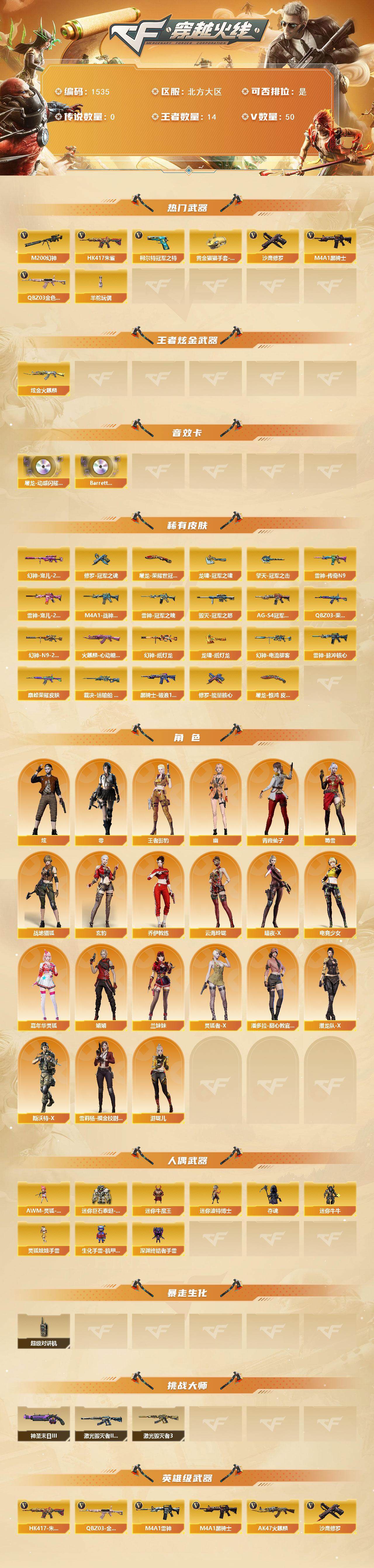 【1535】贝25562北部北方大区可排位可二次【北方大区/55v/vip6】【纯白无封号/幻神4皮肤/雷霆王者套/7手呛拉满/2四防角色/q三件套】【m200-幻神/幻神-宠儿-2021mvp/m200-幻神-n9-2022mvp/幻神-纸灯龙皮肤/幻神-电流骇客,皮肤】【黄金猫猫手套-白鲨】【柯尔特-冠军之特】【q03-金色蔷薇/q03-金色蔷薇音效卡/q03-荣耀世冠白鲨/q03-巅峰荣耀皮肤】【m4a1-雷神2/雷神-宠儿-2019mvp/雷神-冠军之魄/雷神-传奇n9/m4a1-战神赵云/雷神-脉冲核心】【cop,357-雷霆王者】【芭蕾特-毁灭-cfpl冠军/毁灭-冠军之怒】【ak47-火麒麟2/火麒麟-cfstar2/火麒麟-心动糖果】【m4a1-黑骑士2/黑骑士-ag-s4冠军典藏】【hk417-朱雀】【无影-神兵利器】【黑武士-锦绣游龙】【天龙-cfstar2】【烈龙-云海游龙】【沙鹰-修罗3/修罗-cfstar2/修罗-冠军之魂/修罗-能量核心】【天神-动感闪耀】【擎天/擎天-冠军之击/擎天-云海游龙】【屠龙2/屠龙-动感闪耀,音效卡/屠龙-荣耀世冠ag/屠龙-云海游龙/屠龙-动感闪耀】【龙啸2/龙啸-冠军之啸/龙啸-纸灯龙皮肤/龙啸-烈火龙威】【炫/王者影豹/暗夜-x/幽/木兰/云海玲珑/乔伊教练/青霞仙子/妲己/蜀雪/娟娟/斯沃特-x/救世主-x/幻影/堕天使/复仇者】【m4a1-雷霆王者】【barrett-雷霆王者】【colt1911-小故障2/colt,1911-大黄蜂3/柯尔特-萌杀2/新usp-呛王排位奖励】【雷霆王者之锋】【神圣爆裂者-末日iii/激光毁灭者iii-白马银呛/激光毁灭者iii】【斯泰尔-巧克力】【猫猫手套/夺魂】【王者之心】【高爆手蕾-竞技荣光】【手蕾-云海游龙】【高爆手蕾-雷霆王者2/闪光丹-雷霆王者2/盐雾蛋-雷霆王者2】【高爆手蕾-神工天巧】【高爆手蕾-幻灵/闪光丹-幻灵】【炫金火麒麟】【语音特效-云海游龙】【烟雾保护头盔/闪光护目镜/超级对讲机/超级背包/防弹头盔8/防弹衣8/c4工具钳7/手蕾包7/防化服3】截图展示段位不代表实际段位,如赛季更新等不/拒因素发生变化、时限道具不保证所剩时间。标题未写送点卷默认不送 【稀有套装】:q三件套